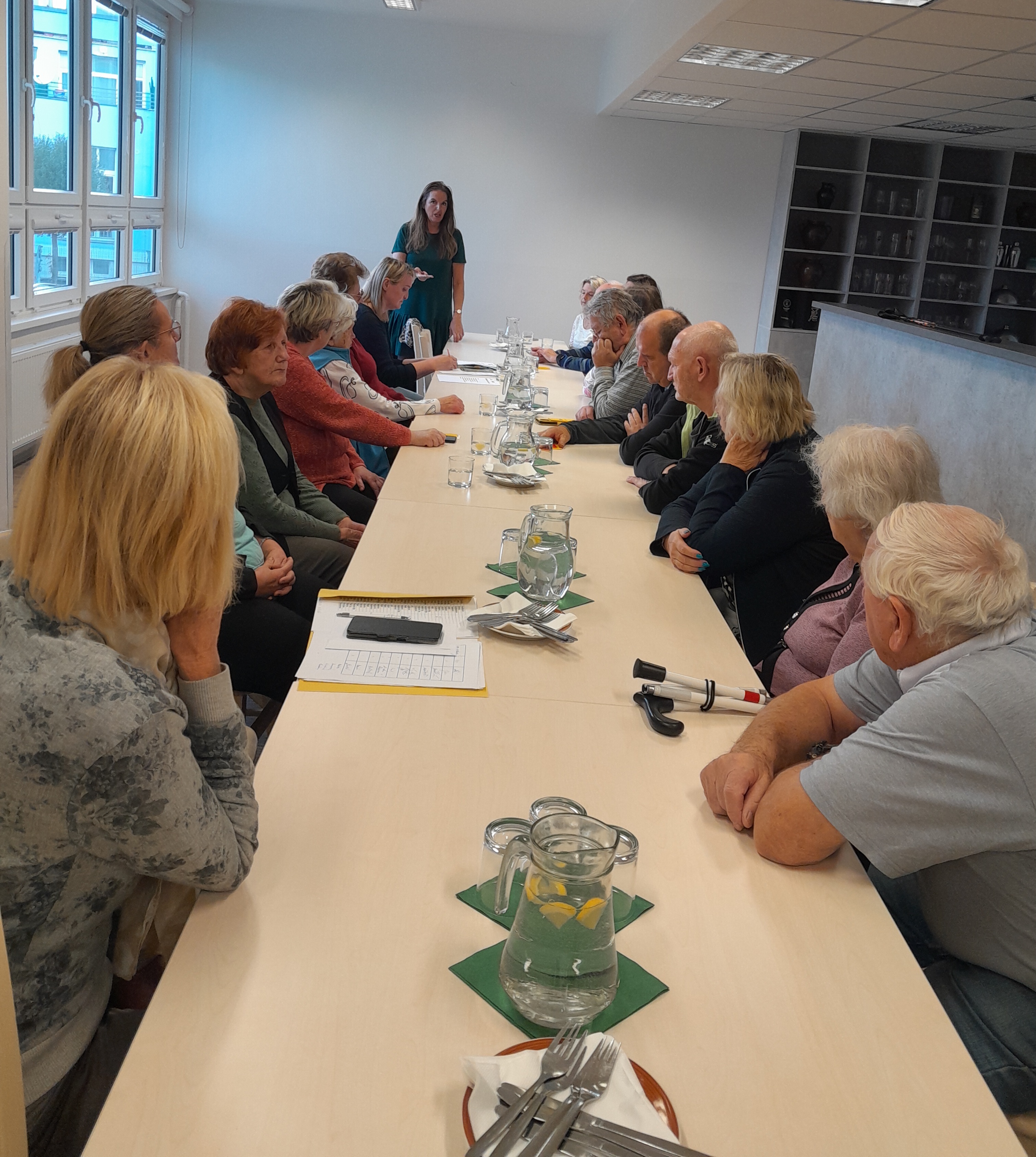 Poté se slova se ujala paní Mgr. Sládková (vedoucí odboru sociálních věcí), pohovořila o získávání parkovacích průkazů a o sociálním poradenství. Parkovací průkazy: (průkaz ZTP, fotografie, musí být přítomna osoba, která ho bude užívat – nutný podpis). Přijímání žádostí do pečovatelských domů v Pelhřimově má na starosti paní Svitáková. Pokud se uvolní místo, tak proběhne rekonstrukce bytu a poté je dle pořadníku přijat nový klient.