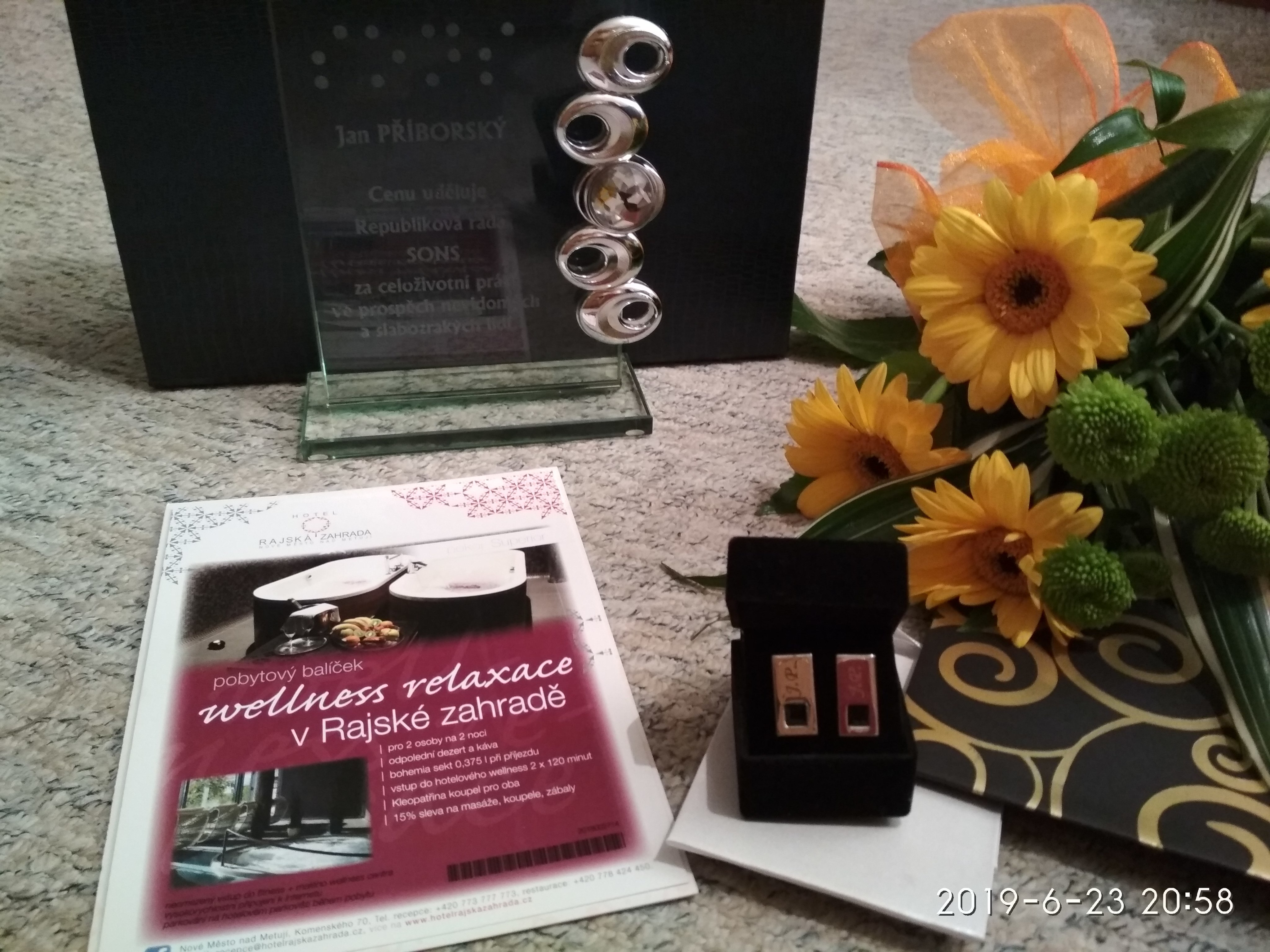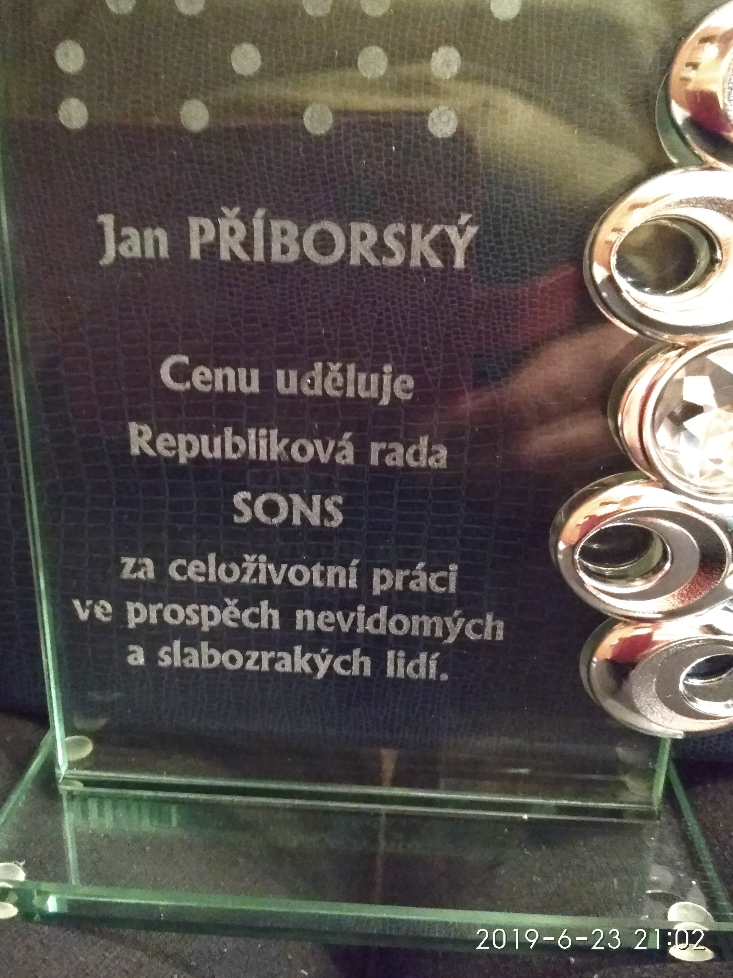 Pan Jan Příborský dne 22. června 2019 převzal z rukou viceprezidenta SONS Rudolfa Volejníka "Cenu Republikové rady SONS za celoživotní práci ve prospěch nevidomých a slabozrakých lidí."
