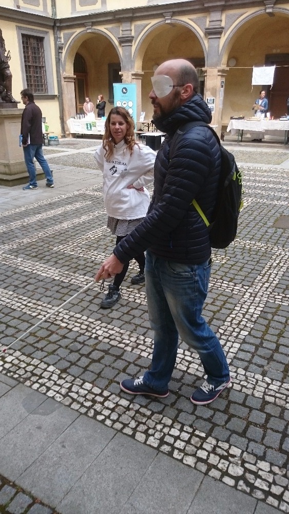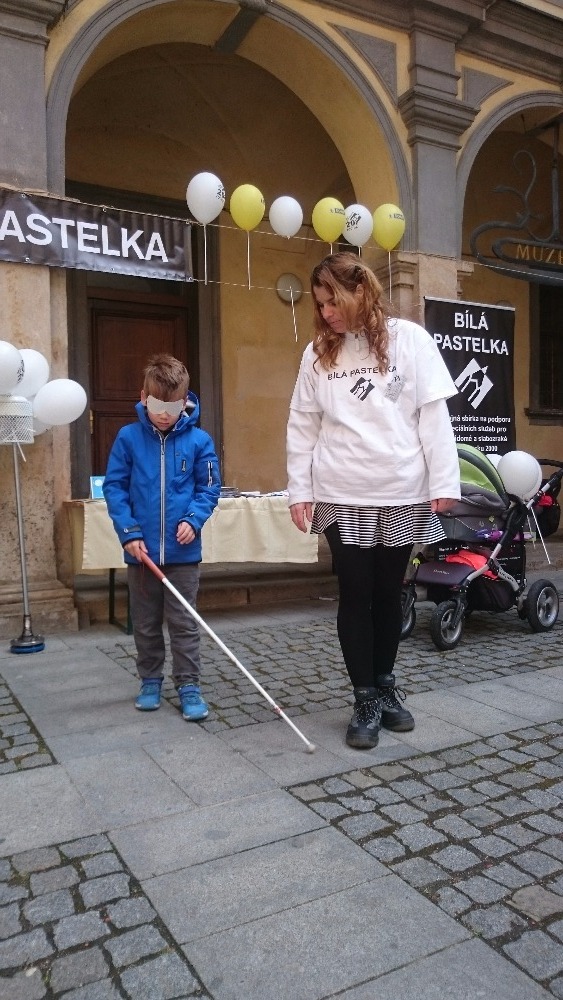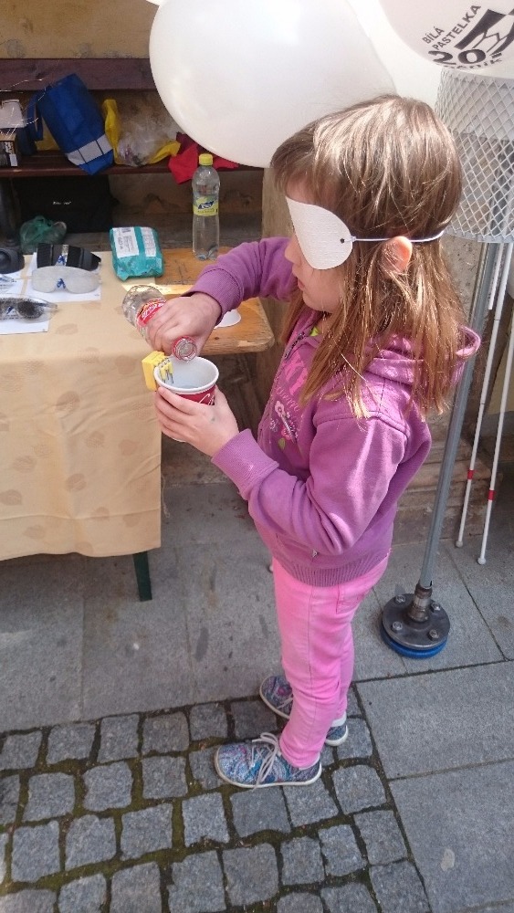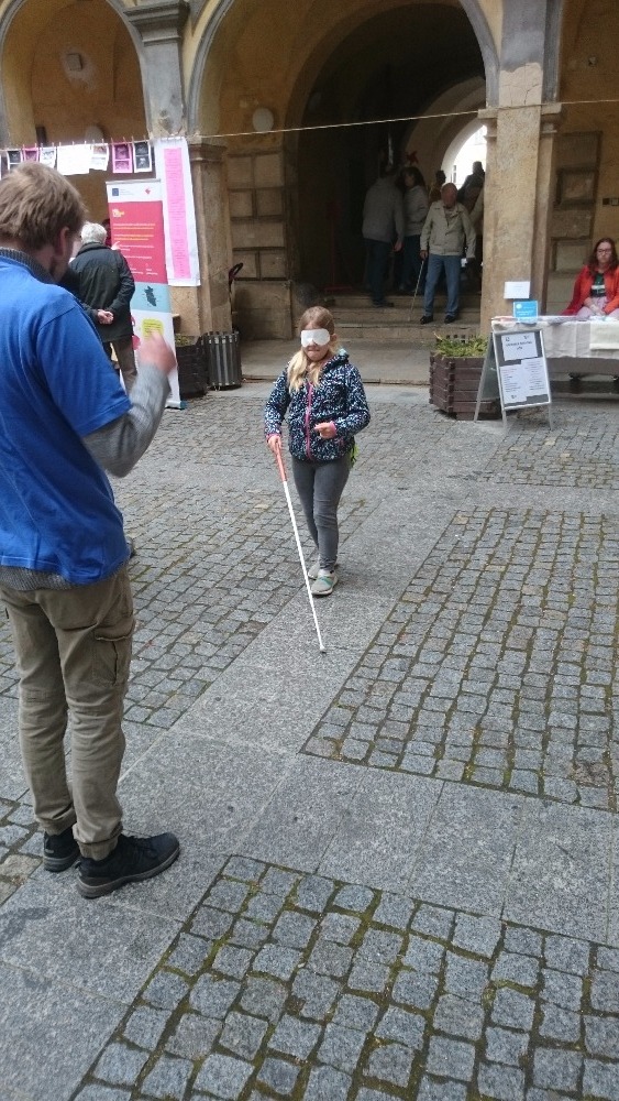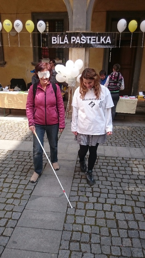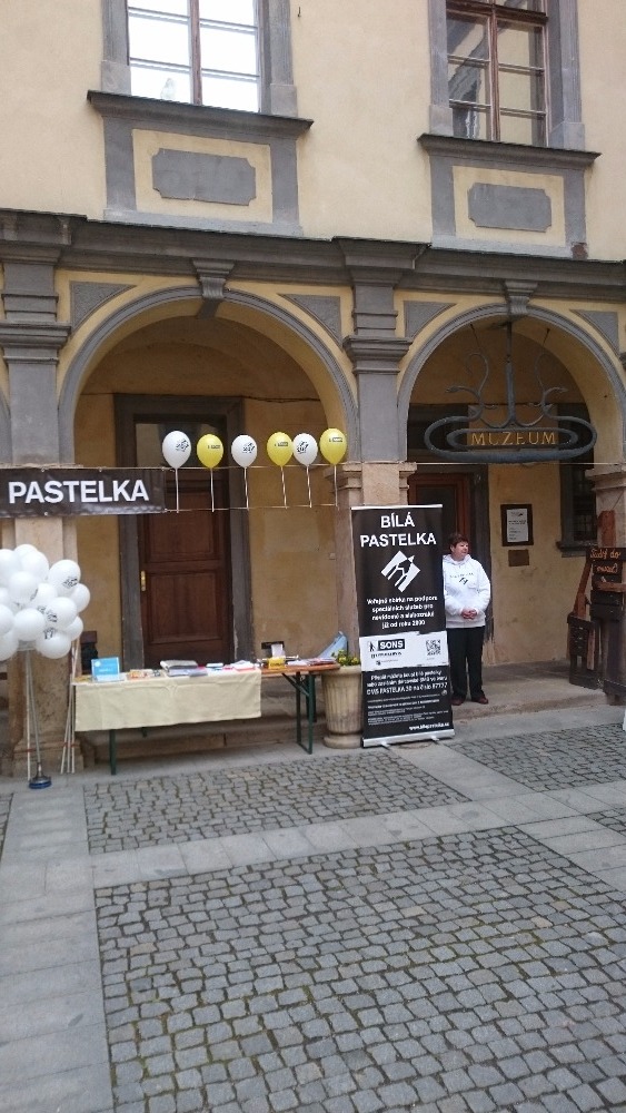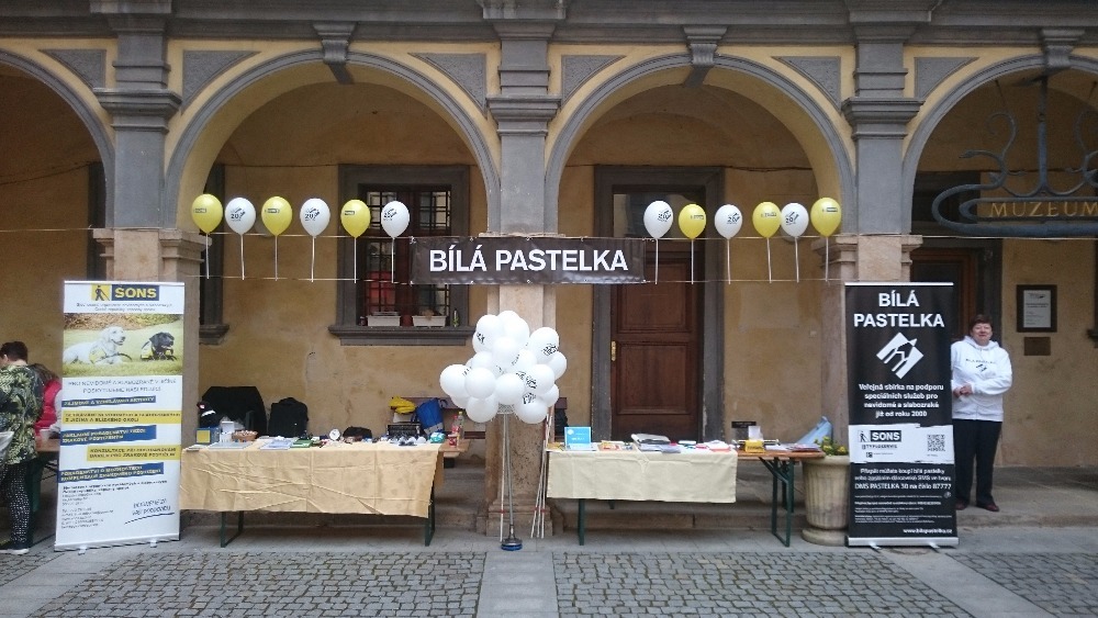 První květnový den se již tradičně konala na nádvoří jičínského zámku akce zvaná Ochutnávka neziskovek. Naše organizace se po roce opět zúčastnila a nutno říci, že o náš stánek byl velký zájem. Příchozí si měli možnost vyzkoušet pomůcky, které využívají slabozrací a nevidomí. Mohli se seznámit s Braillovým písmem, napsat jím text na Pichtově psacím stroji a zkusit si přečíst slova napsaná tímto strojem. Také si mohli prohlédnout pomůcky a přístroje usnadňující život slabozrakých a nevidomých, např. mluvicí kuchyňskou váhu, přístroj na zjištění barvy předmětů, peněženku, hodinky, budík pro nevidomé, měřič hladiny tekutiny v nádobách, několik druhů lup, zkusit se podepsat pomocí šablonky a další pomůcky. Zároveň si mohli vyzkoušet, zda poznají předměty na vyobrazených obrázcích. Dále byly k vidění hry pro nevidomé (Člověče, nezlob se; Logik; karetní hry). K dispozici byly také speciální brýle simulující různé oční vady. Samozřejmostí byla zkouška chůze s bílou holí s klapkami na očích.