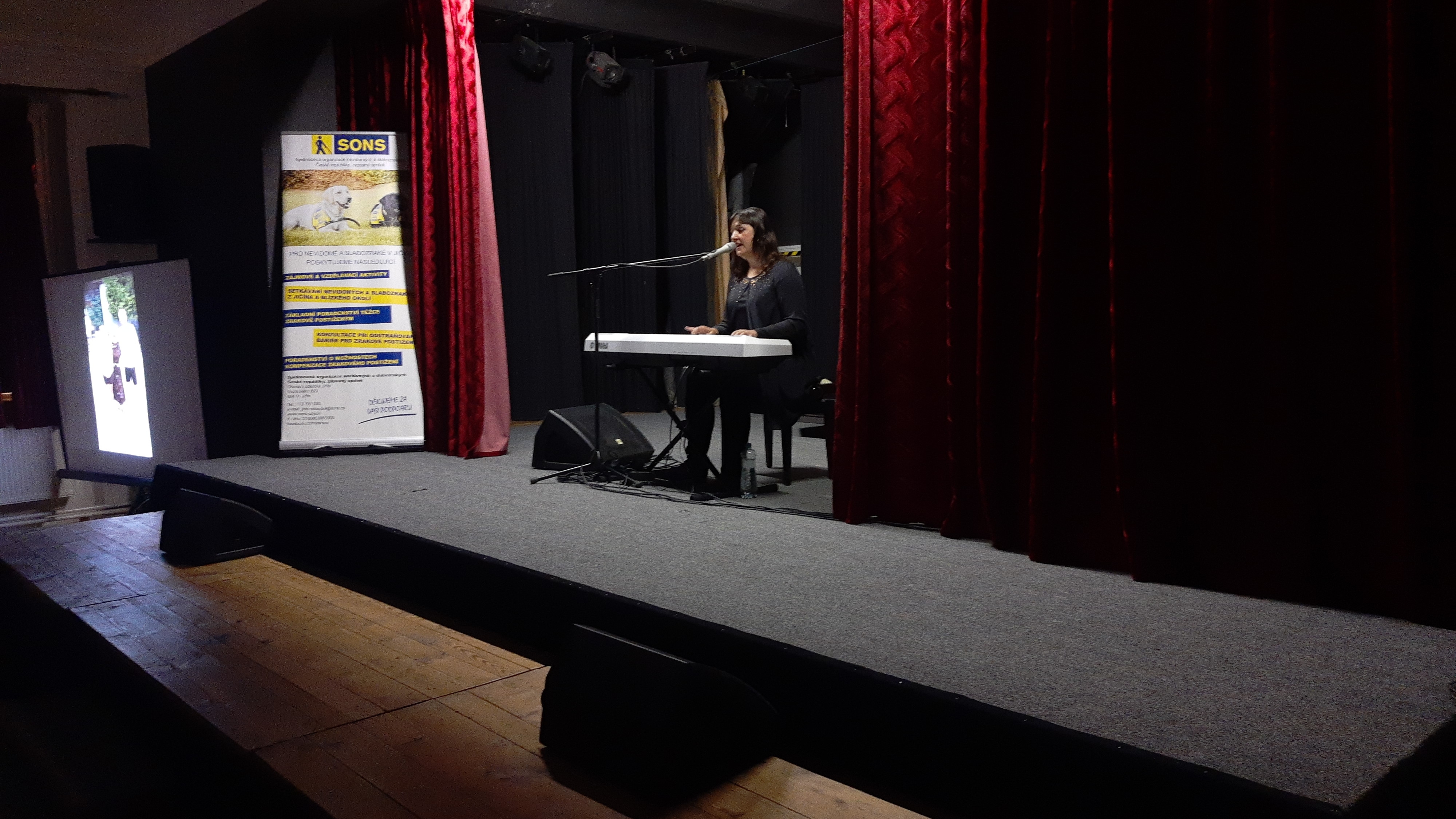 Po krátké přestávce jsme se zaposlouchali do líbezného zpěvu krásné nevidomé zpěvačky a naší členky Simony Maierové. Kdo chtěl, zazpíval si spolu s ní i písničku. Její slova byla předána při vstupu do sálu v programu odpoledne.