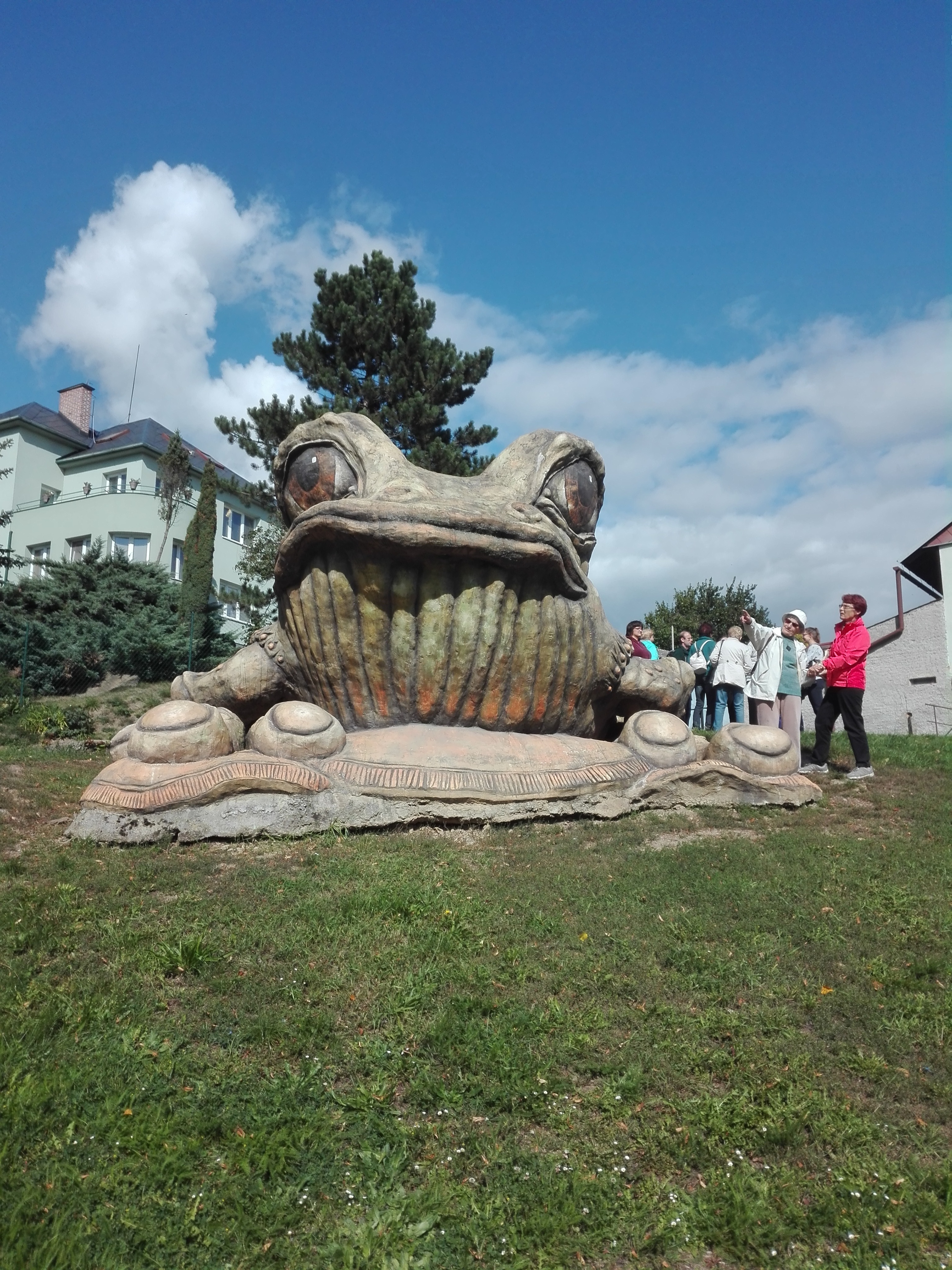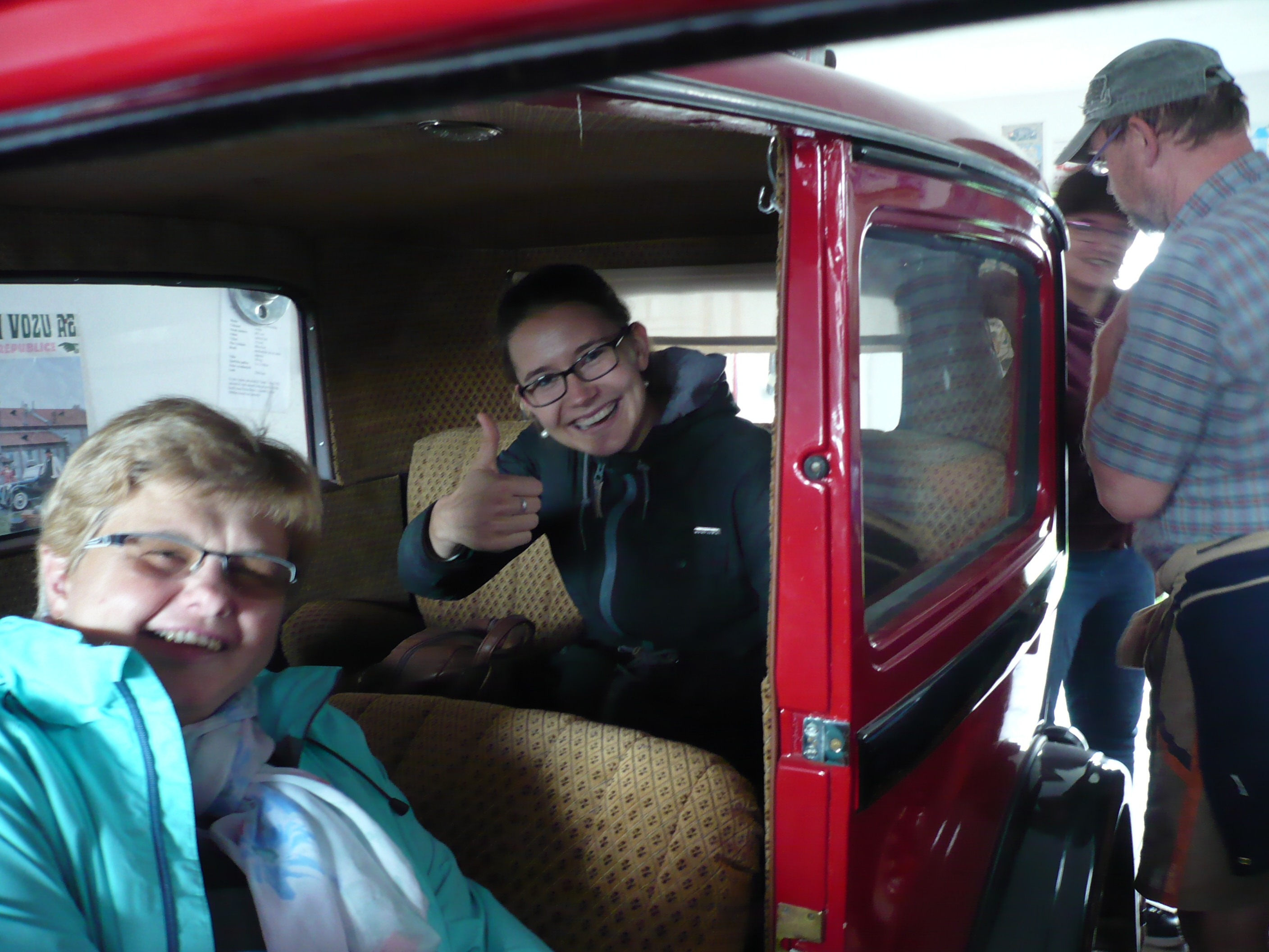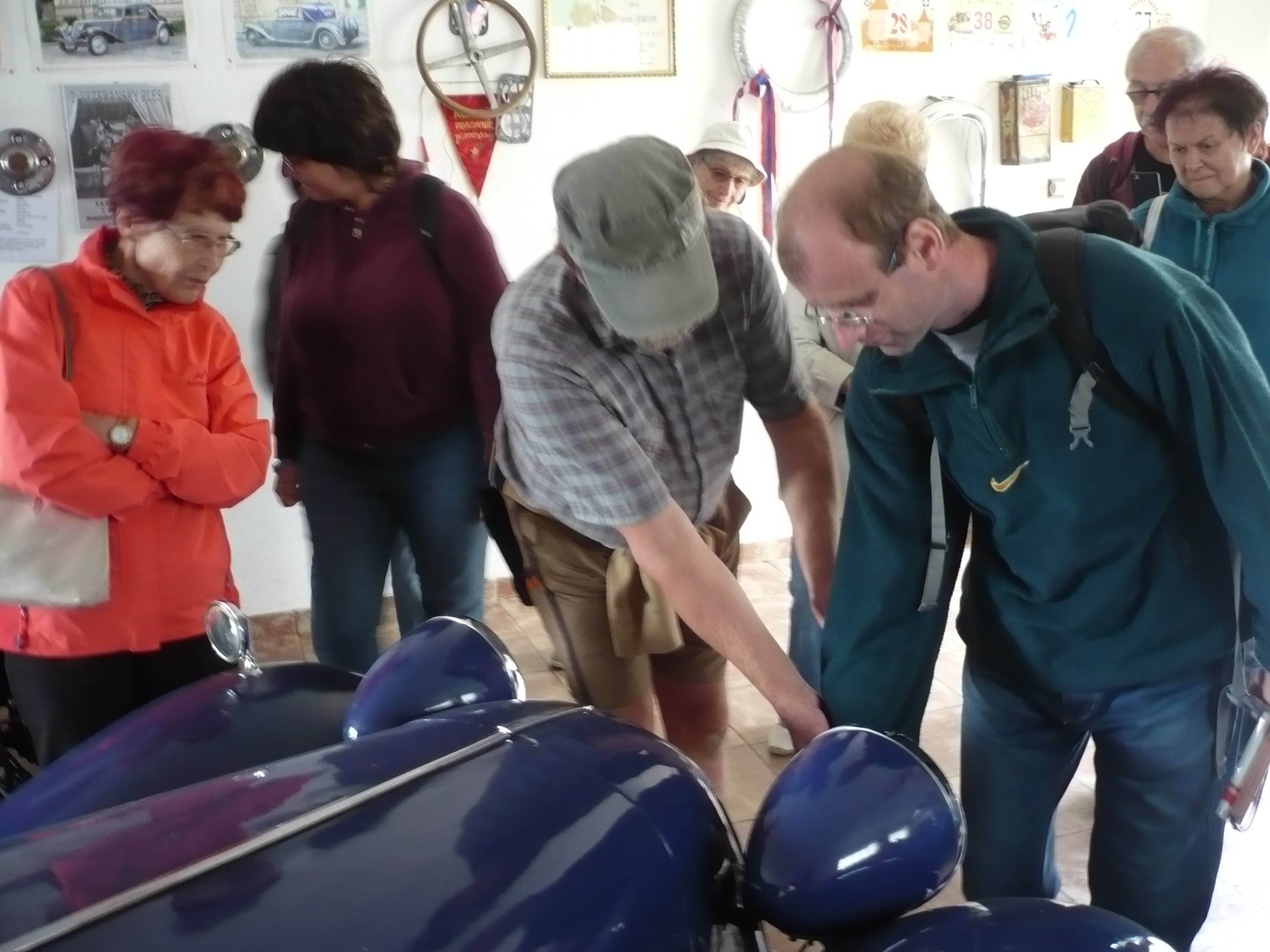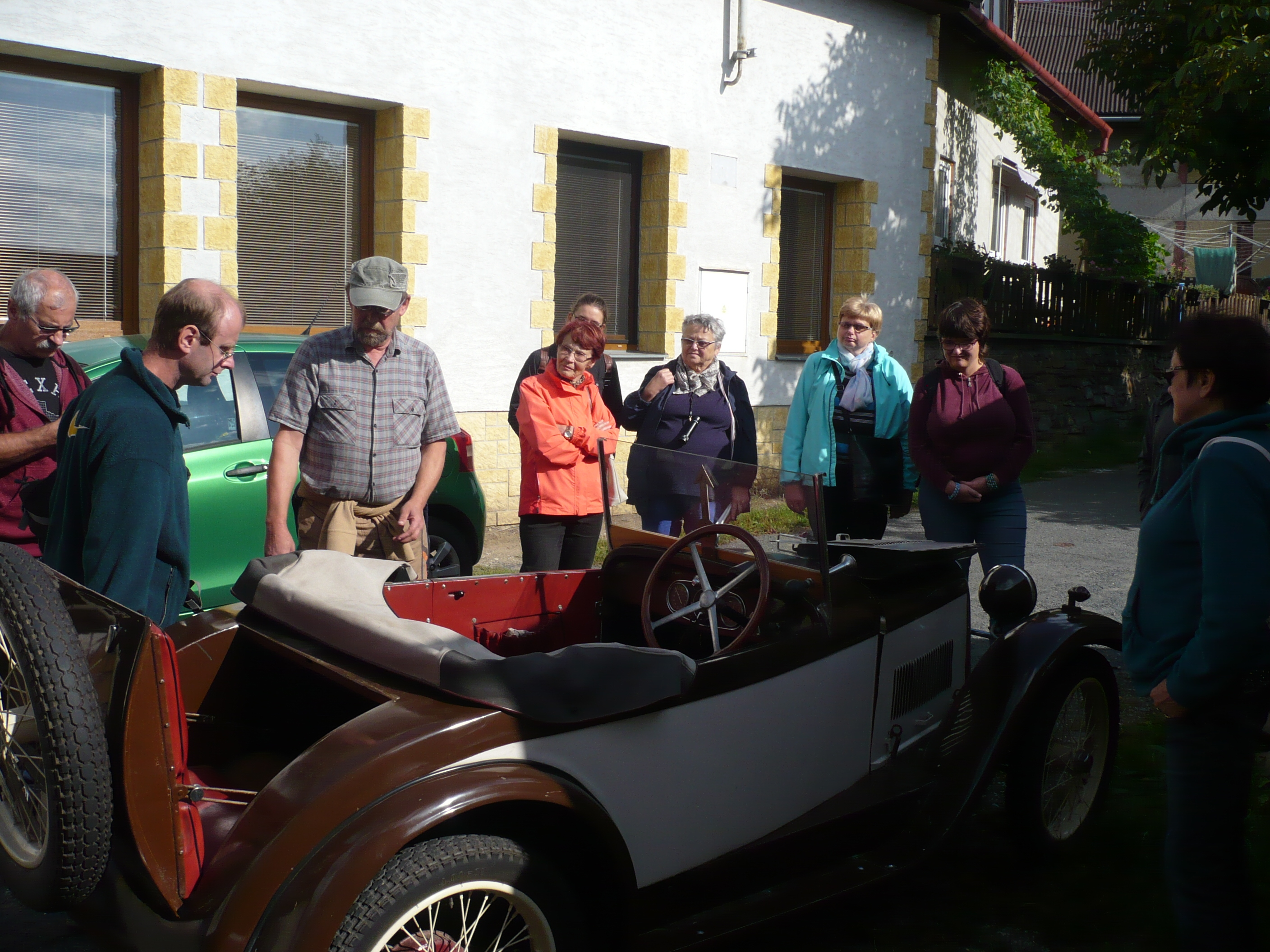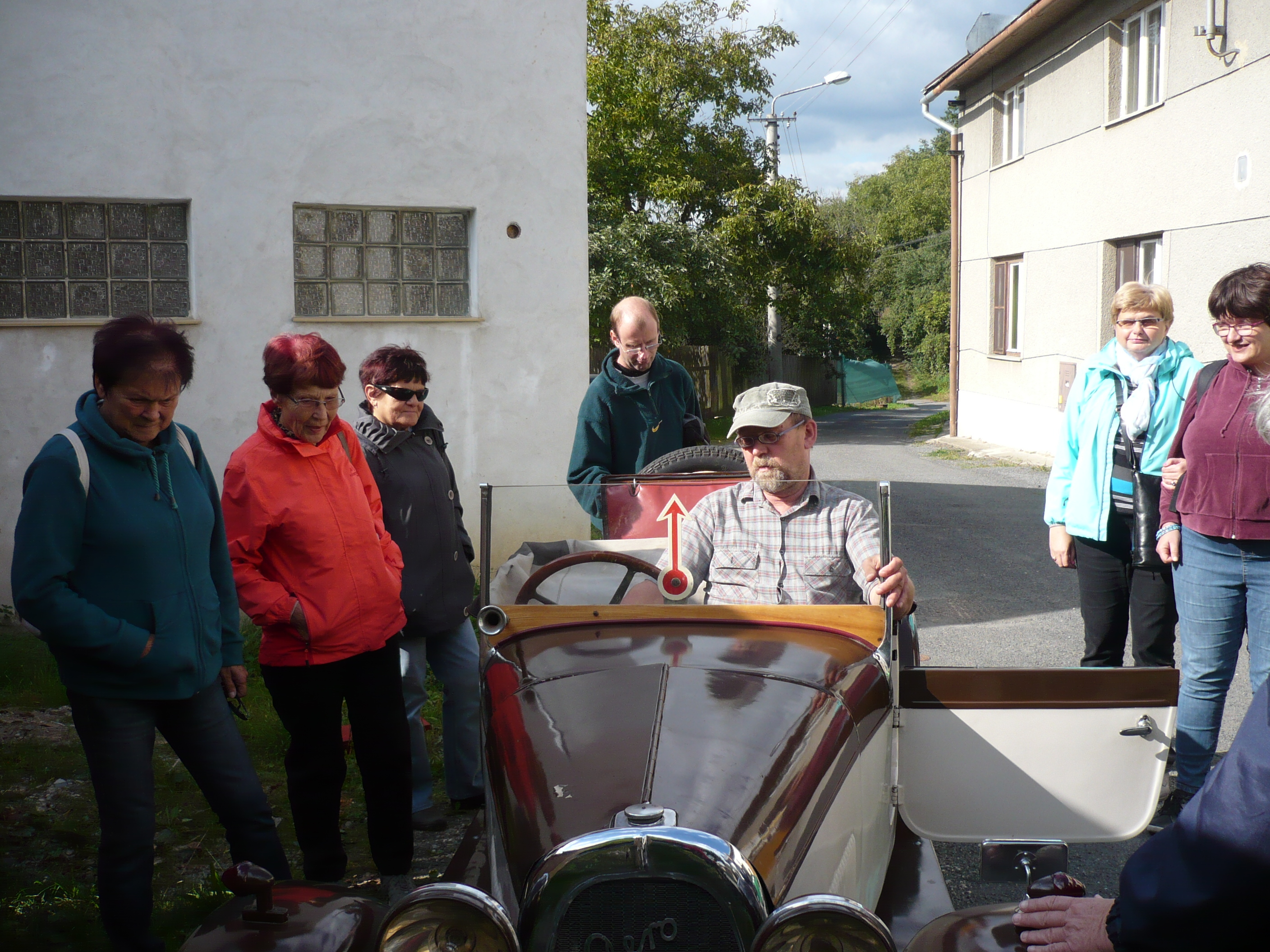 Paní Táňa nám přišla naproti už na zastávku autobusu v Tršicích, na kterou jsme přijeli, a navrhla nám procházku, během které nám o této obci pověděla několik zajímavostí. Vydali jsme se do mírného kopce k místnímu zámku. Cestou jsme pozdravili velkou sochu žáby, dominantu opraveného náměstí nedaleko kostela. Tuto tři metry vysokou a asi 10 tun těžkou sochu vytvořil v roce 2009 známý sochař Michal Olšiak, jehož sochy jsou rozmístěny po celé republice. Žábu mají Tršice i ve znaku jako poctu bývalému majiteli panství Jiřímu Žabkovi z Limberka. Naši výletníci si žábu zblízka prohlédli a mohli ji i pohladit. Poté jsme se za příjemného počasí prošli zahradou zámku a kolem rybníka k domu manželů Grolichových. Poklidným tempem jsme se k němu s úsměvem přibližovali a to už nás troubením na klakson v malé béžové aerovce (Aero 500) vítal i pan Standa. Pozval nás do garáže, ve které je větší část jeho sbírky vystavena a nadšeně nám o svých veteránech vyprávěl. Je vidět, že jsou jeho srdcová záležitost! Samozřejmě jsme měli možnost si je nejen fotit, ale také prohlížet hmatem, posadit se do nich a ptát se na všechno, co nás o nich zajímalo. Po prohlídce exponátů v garáži jsme se přesunuli o kousek níž ke druhému vchodu do domu a u něj stál žlutý veterán Aero 30. Je to první exponát ve sbírce pana Standy, o to je pro něj cennější. Během dalšího povídání pana Grolicha nás paní Táňa přišla pozdravit v dobových šatech, ve kterých jí to náramně slušelo!