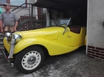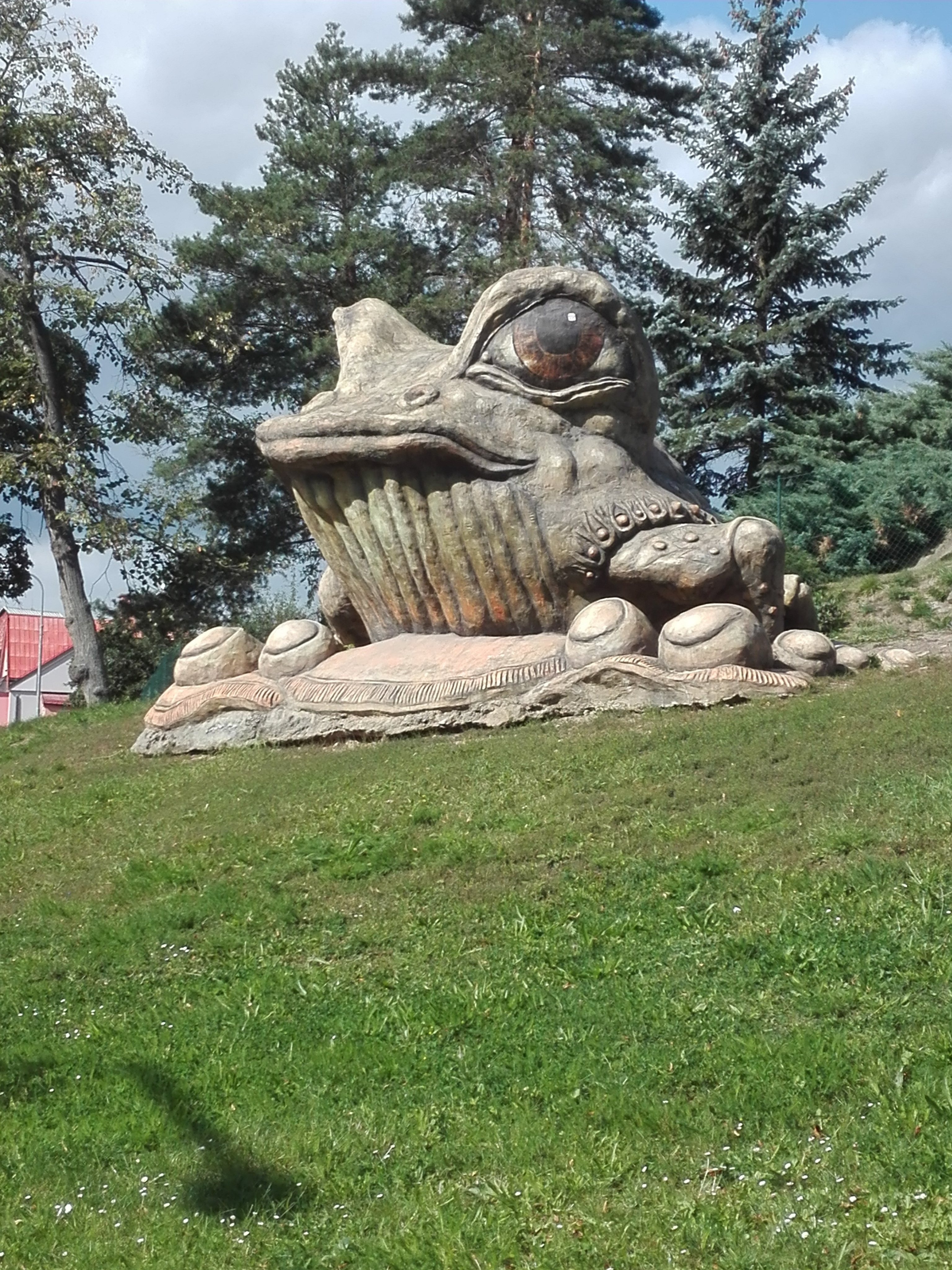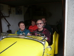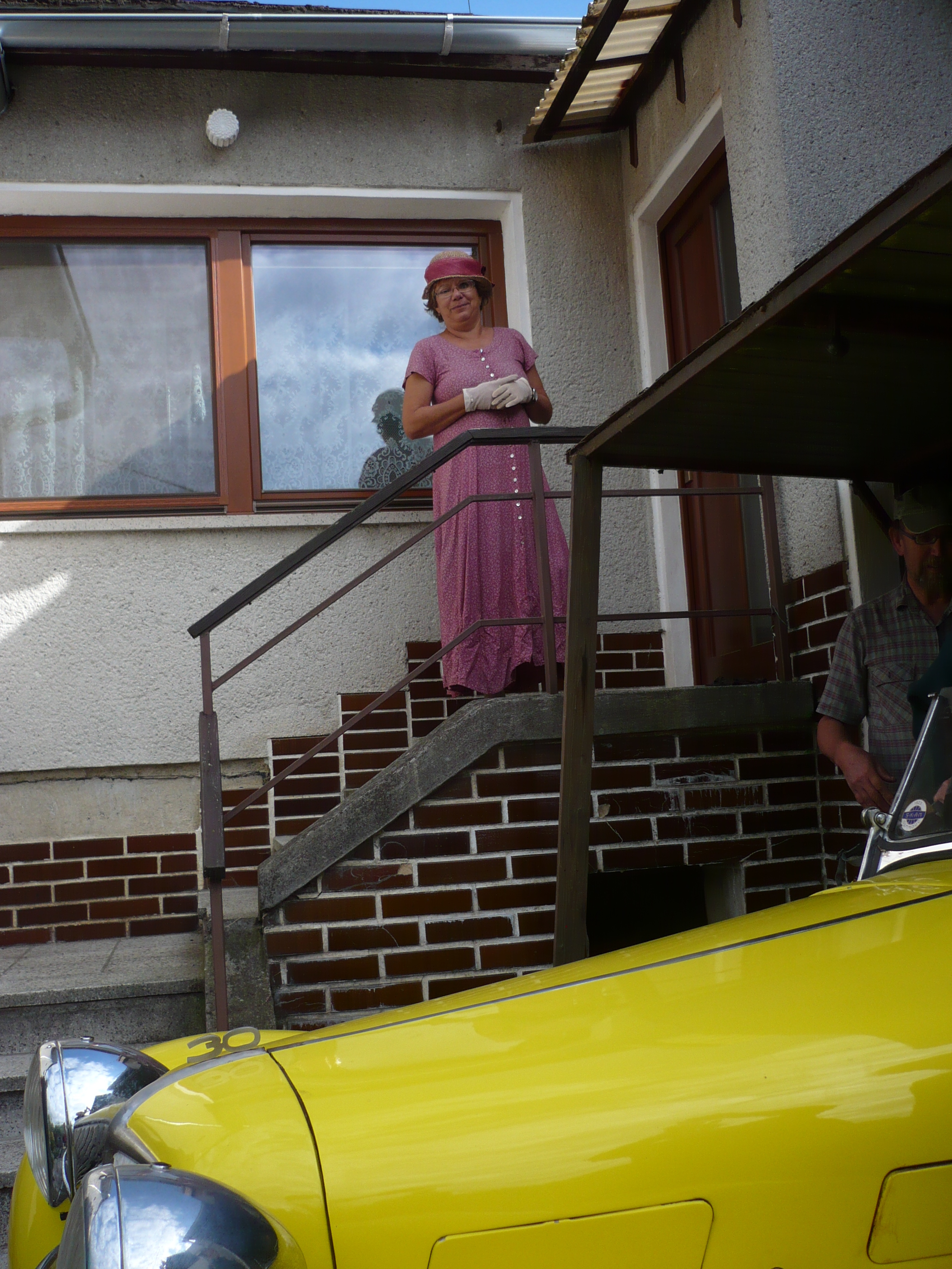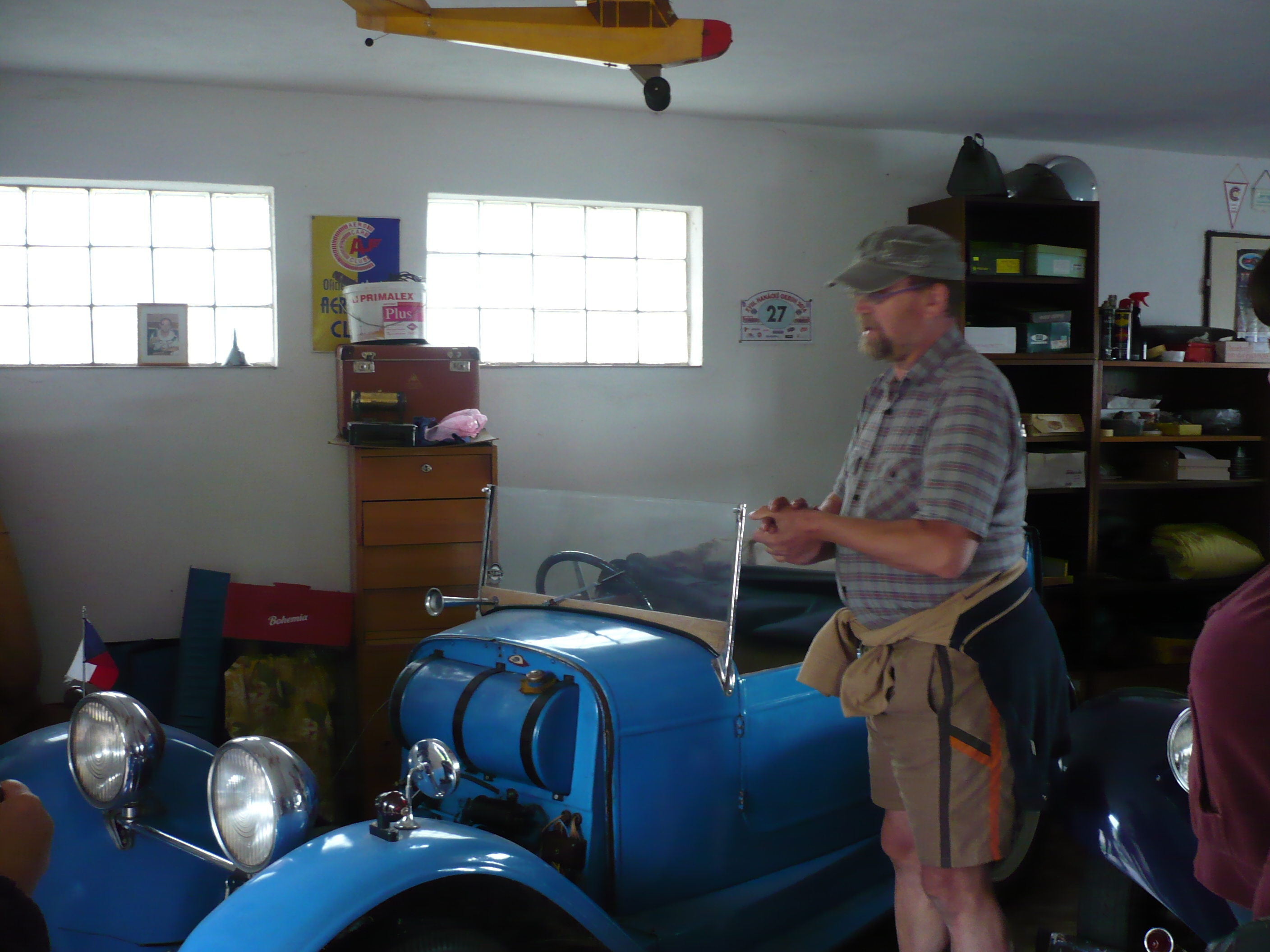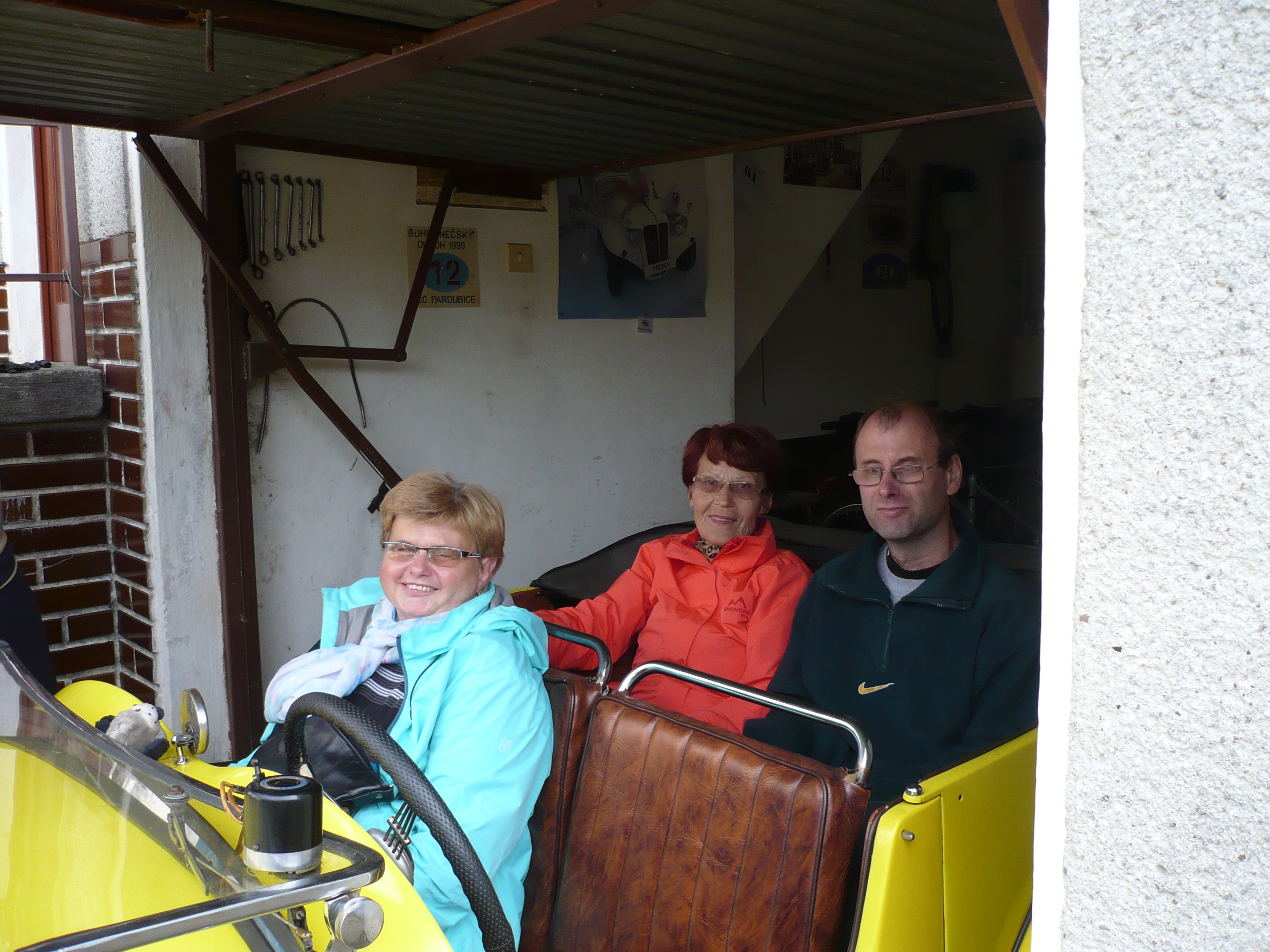Paní Táňa nám přišla naproti už na zastávku autobusu v Tršicích, na kterou jsme přijeli, a navrhla nám procházku, během které nám o této obci pověděla několik zajímavostí. Vydali jsme se do mírného kopce k místnímu zámku. Cestou jsme pozdravili velkou sochu žáby, dominantu opraveného náměstí nedaleko kostela. Tuto tři metry vysokou a asi 10 tun těžkou sochu vytvořil v roce 2009 známý sochař Michal Olšiak, jehož sochy jsou rozmístěny po celé republice. Žábu mají Tršice i ve znaku jako poctu bývalému majiteli panství Jiřímu Žabkovi z Limberka. Naši výletníci si žábu zblízka prohlédli a mohli ji i pohladit. Poté jsme se za příjemného počasí prošli zahradou zámku a kolem rybníka k domu manželů Grolichových. Poklidným tempem jsme se k němu s úsměvem přibližovali a to už nás troubením na klakson v malé béžové aerovce (Aero 500) vítal i pan Standa. Pozval nás do garáže, ve které je větší část jeho sbírky vystavena a nadšeně nám o svých veteránech vyprávěl. Je vidět, že jsou jeho srdcová záležitost! Samozřejmě jsme měli možnost si je nejen fotit, ale také prohlížet hmatem, posadit se do nich a ptát se na všechno, co nás o nich zajímalo. Po prohlídce exponátů v garáži jsme se přesunuli o kousek níž ke druhému vchodu do domu a u něj stál žlutý veterán Aero 30. Je to první exponát ve sbírce pana Standy, o to je pro něj cennější. Během dalšího povídání pana Grolicha nás paní Táňa přišla pozdravit v dobových šatech, ve kterých jí to náramně slušelo!