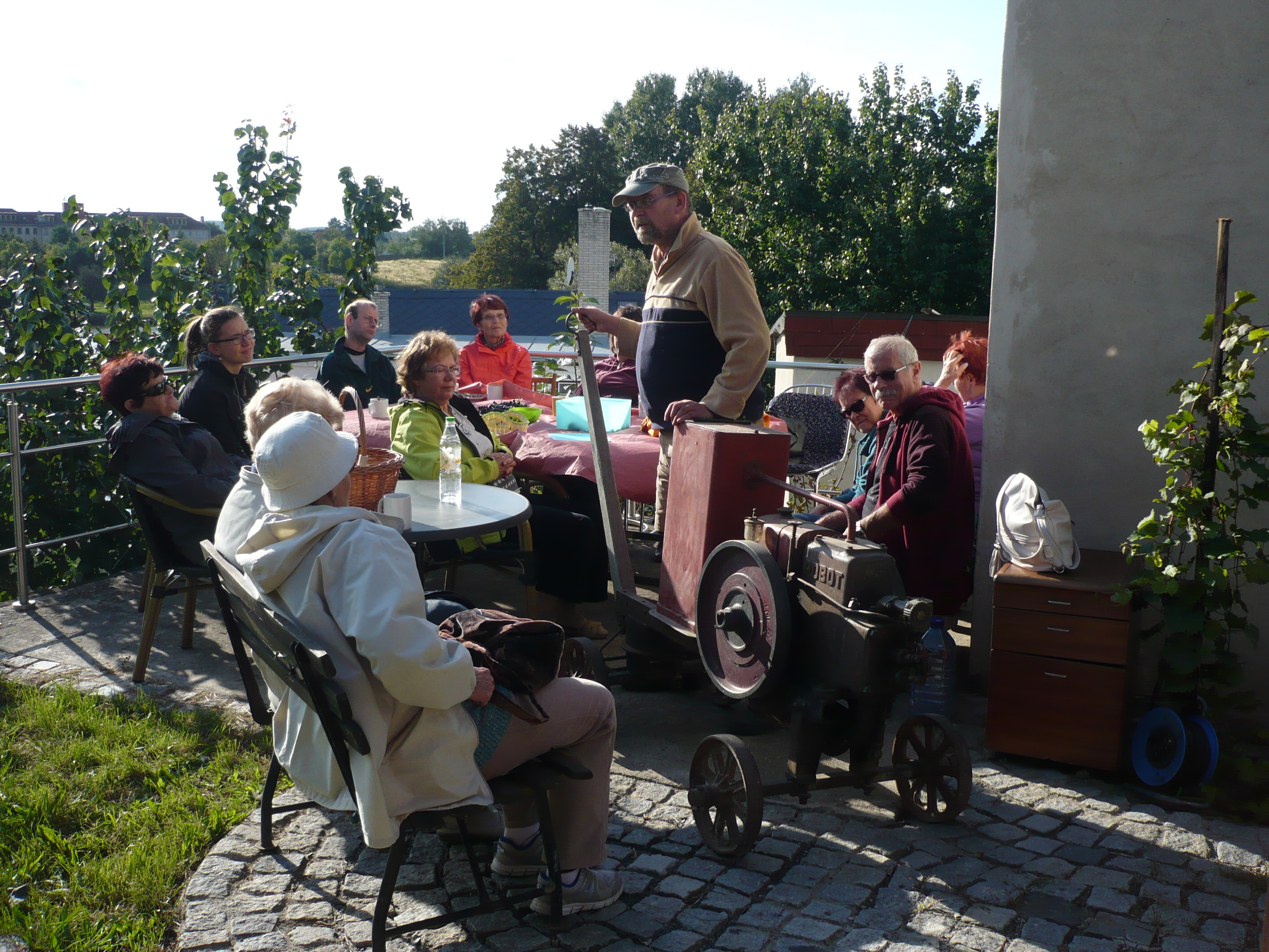 Naše návštěva prohlídkou veteránů neskončila, protože jsme byli pozvaní také k příjemnému posezení na terase domku manželů Grolichových. Ochutnali jsme zde například výborné koláče, které pro nás paní Táňa napekla a pan Standa nám při tom povídal i o dalších skvostech, které má ve svých sbírkách – například starých jízdních kolech, která jsme právě pod přístřeškem na terase mohli obdivovat.