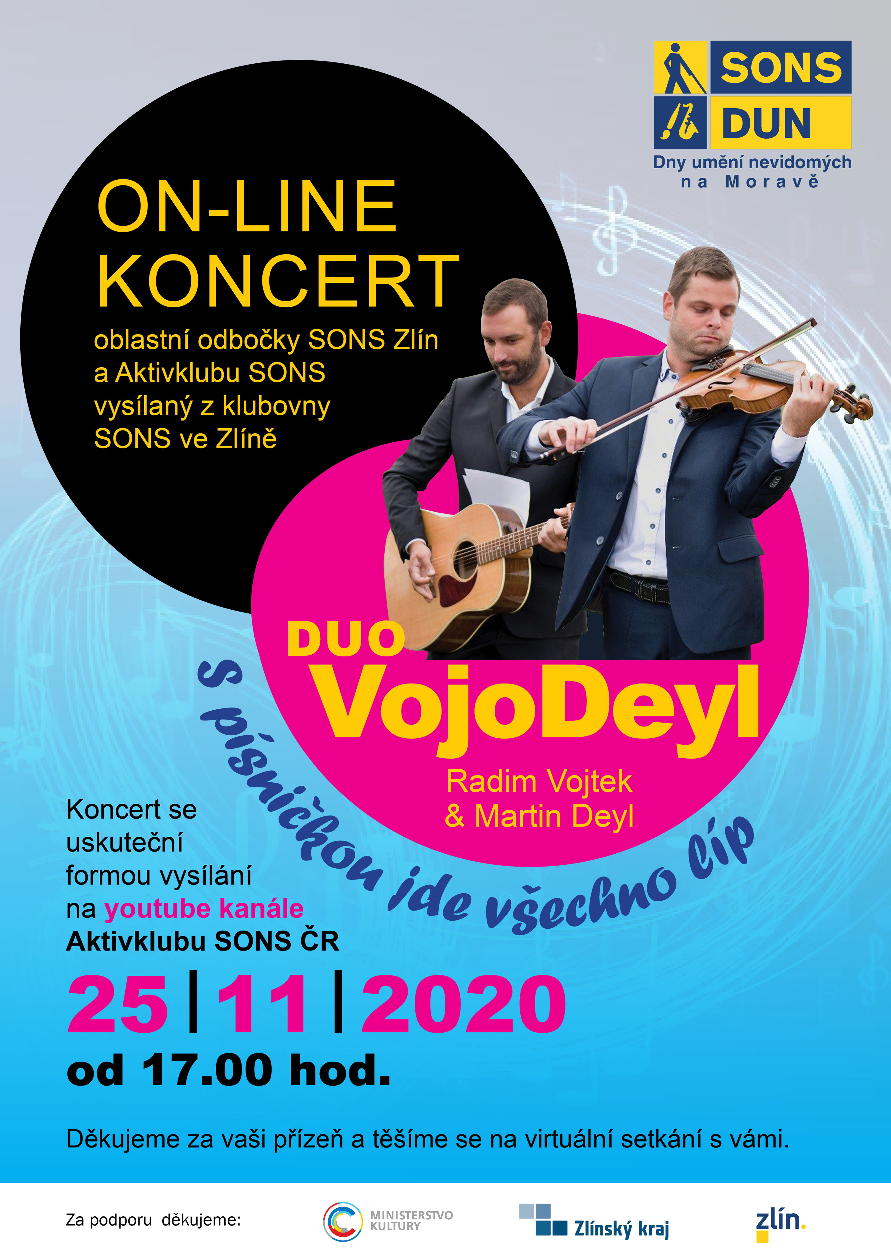 oblastní odbočka SÖNS Zlín a Aktivklub SONS ČR pro vás připravili další z řady online koncertů tentokrát s názvem "S písničkou jde všechno líp" v podání známého dua Vojodeyl. Ve středu 25. 11. 2020 se od 17:00 hodin můžete kliknutím na tento odkaz: https://www.youtube.com/watch?v=hvccYjalD_s&feature=youtu.be jednoduše připojit. Vysílání půjde otevřít ve všech běžných zařízeních jako je chytrý telefon, počítač nebo chytrá televize, kde se automaticky zobrazí ihned po kliknutí na odkaz. Nemusíte se tedy obávat, že video nebudete moci najít.