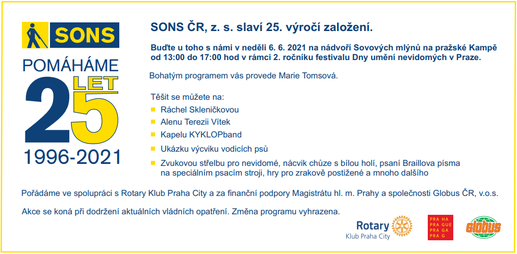 Dovolte, abychom Vás pozvali na oslavu 25. výročí založení našeho spolku. Akce, která se koná ve spolupráci s Rotary Klub Praha City, se bude konat na pražské Kampě v neděli 6. 6. 2021 od 13 do 17 hod. Za velké pomoci paní Dagmar Filgasové byl připraven kulturní program, kterým Vás provede Marie Tomsová. Můžete se těšit mimo jiné na Ráchel Skleničkovou, Alenu Terezii Vítek nebo skupinu KYKLOPBand.