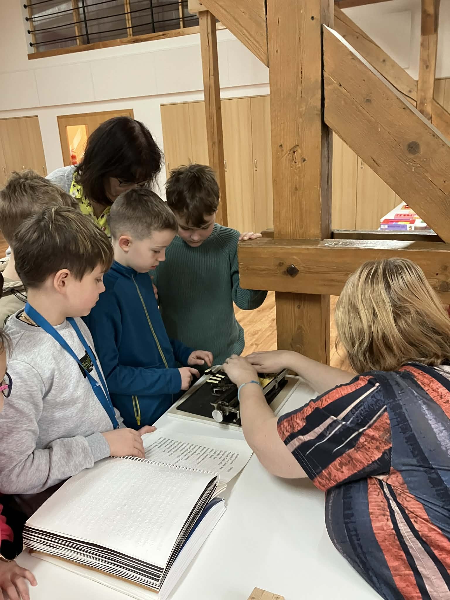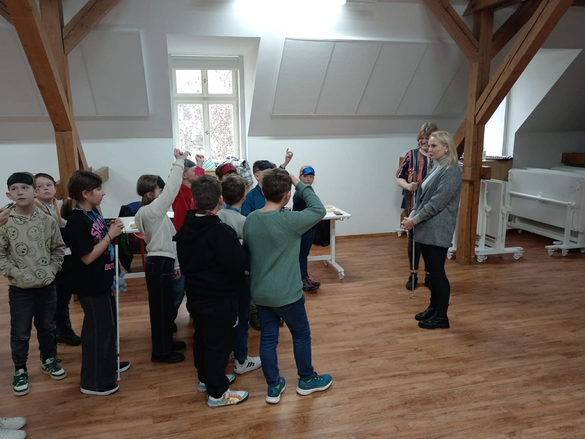 Letos jsme se již po druhé sešli, tentokrát s dětmi ze ZŠ SNP, v příjemném prostředí ústecké knihovny. Nesměla u toho, stejně jako začátkem roku, chybět ani naše kolegyně Radka Lienertová se svými knihami o dětech a nevidomé Kačce z domova U Sluníčka. Děti si nejdřív se zájmem poslechly čtení, a pak si vyzkoušely pomůcky pro nevidomé, hladinku, která zabrání přelití nápoje, Colorino, které vám řekne nejen barvu oblečení, ale i vlasů, složily si různé hlavolamy, zahrály si zvukové pexeso a člověče nezlob se s páskou na očích, aby si alespoň trošku dokázaly představit a vcítit se do nevidomého. Představili jsme Braillovo písmo a děti si vyzkoušely modelovou situaci, jak oslovit a pomoci nevidomému. Nakonec si děti po slepu zahrály míčovou hru s ozvučeným míčem.