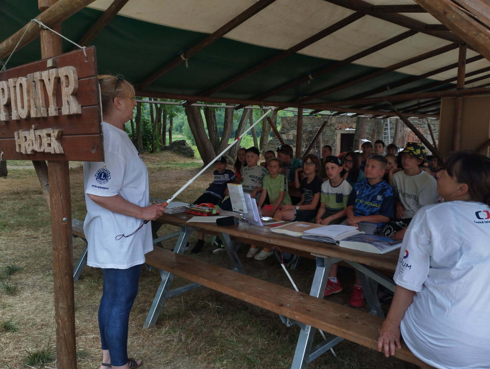Na sérii fotografií je zachyceno zahájení osvětové akce SONS Rokycany v pionýrském táboře Hrádek u Rokycan na Spáleném mlýně. Pod dřevěným přístřeškem sedí děti na lavičkách a se zaujetím poslouchají úvodní povídání a představení programu od členek SONS. Na stole jsou připravené pomůcky, brožury a materiály, které budou využity během aktivit. Na fotografiích je vidět: Úvodní slovo a přivítání účastníků akce. Seznámení dětí s činností SONS a smyslem sbírky Bílá pastelka. Atmosféru tábora s typickými stanovými podsadami v pozadí a dětmi soustředěně naslouchajícími programu. Na sérii fotografií je zachycena praktická část osvětové akce SONS Rokycany v pionýrském táboře Hrádek u Rokycan – chůze s bílou holí. C. Na fotografiích je zachycena aktivita z osvětového programu SONS Rokycany v pionýrském táboře Hrádek u Rokycan, při které si děti vyzkoušely hmatové hry poslepu. Děti měly zavázané oči a pomocí hmatu se snažily rozpoznat různé tvary, písmena a symboly. Účastníci se soustředili na jemnou motoriku a vnímání detailů bez použití zraku, což jim umožnilo lépe pochopit svět lidí se zrakovým postižením. Aktivita podpořila rozvoj empatie, trpělivosti a spolupráce.