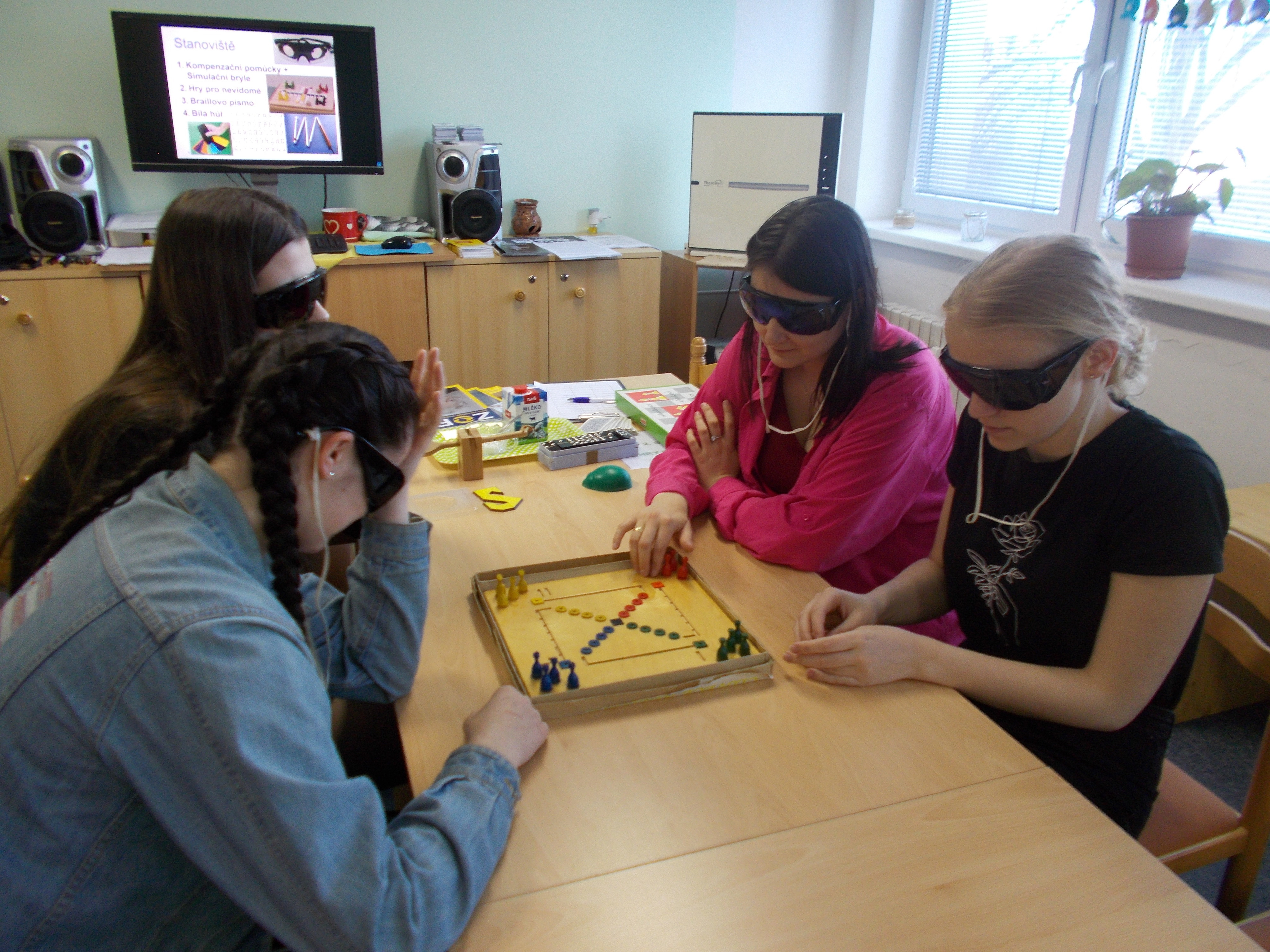 Dne 8. 4. 2022 proběhla na naší odbočce osvětová akce pro studenty gymnázia a střední odborné školy. Seznámily jsme studentky, s tím kdo jsme a co děláme, se sbírkou bílá pastelka a se střediskem vodicích psů. Poté jsme studentům přehrály videa o středisku vodicích psů a o tom jak správně vodit nevidomého člověka. Studentky se následně rozdělily do skupinek a měly možnost na 4 stanovištích si vyzkoušet - hry pro nevidomé, kompenzační pomůcky, simulační brýle se zrakovými vadami, psát na pichtovém stroji (braillské písmo) a zkusit se vžít do nevidomého klienta prostřednictvím chůze s bílou holí, ale naopak i do role průvodce. Nakonec nám studentky vyplnily krátký dotazník, jak se jim exkurze u nás líbila.