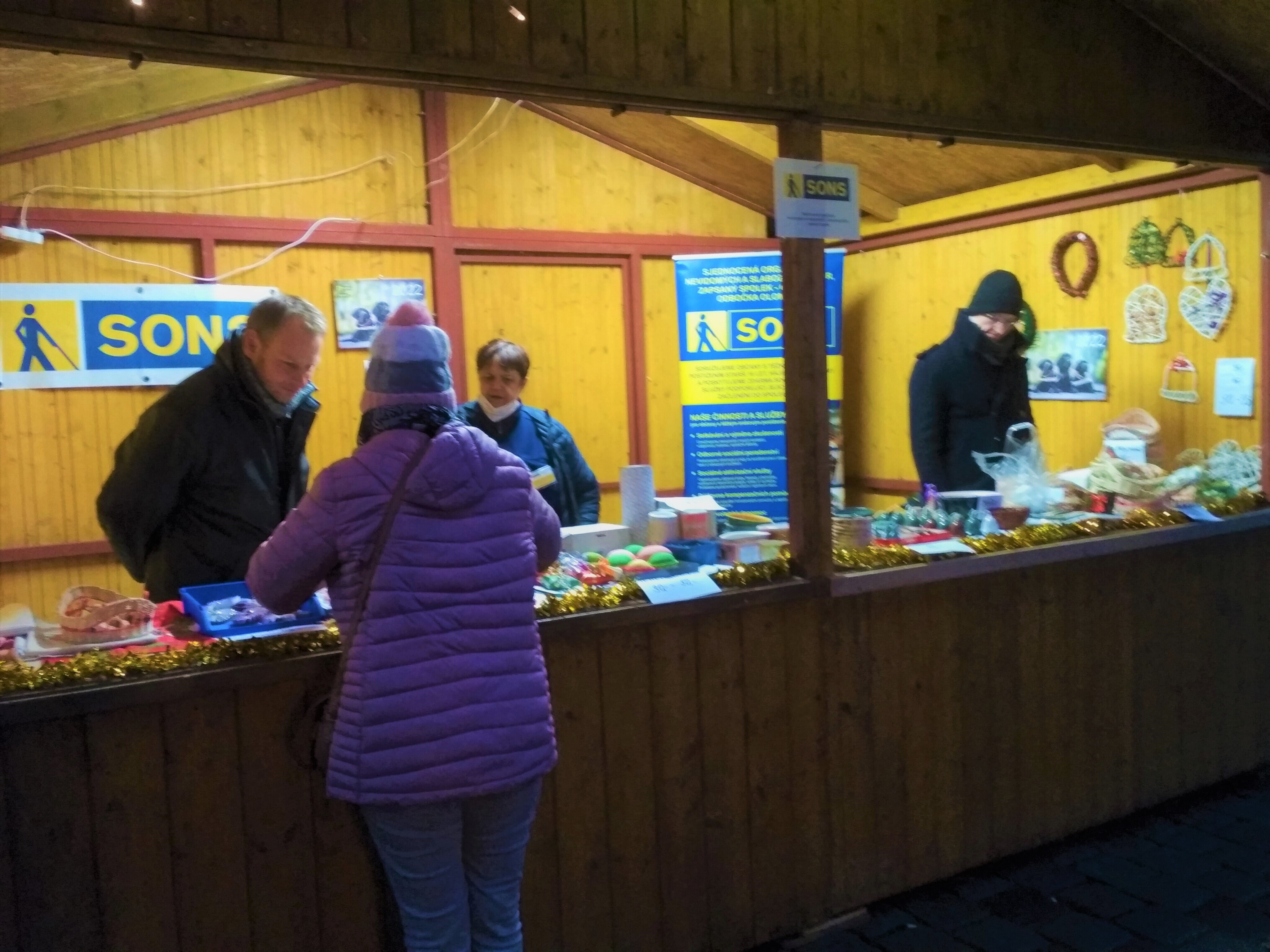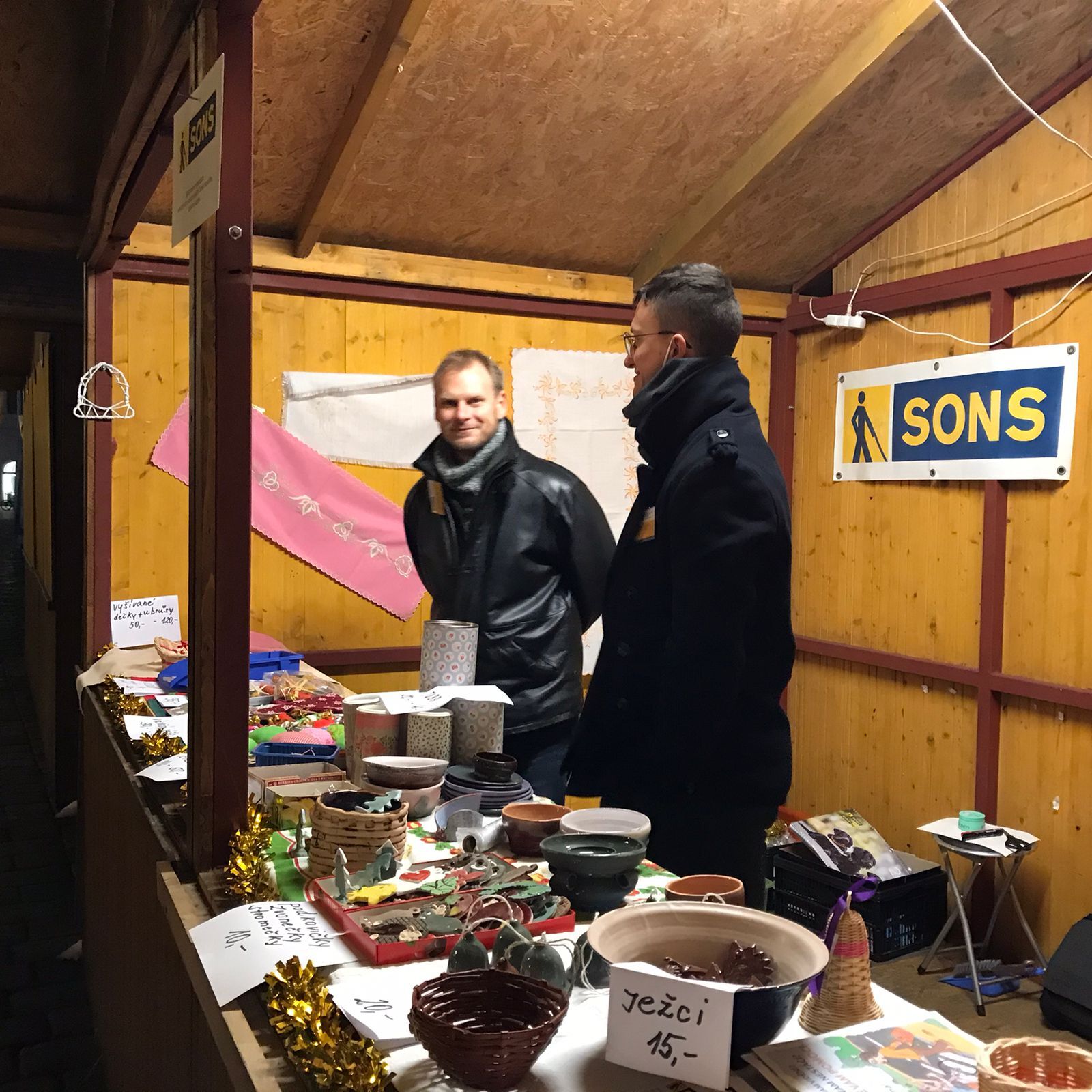 Návštěvníkům „Zimního Jarmarku“, který částečně nahradil zrušené vánoční trhy, jsme tak mohli nabídnout vánoční předměty vyrobené našimi uživateli, ale také kalendáře s pejsky ze Střediska výcviku vodicích psů v Praze – Jinonicích.