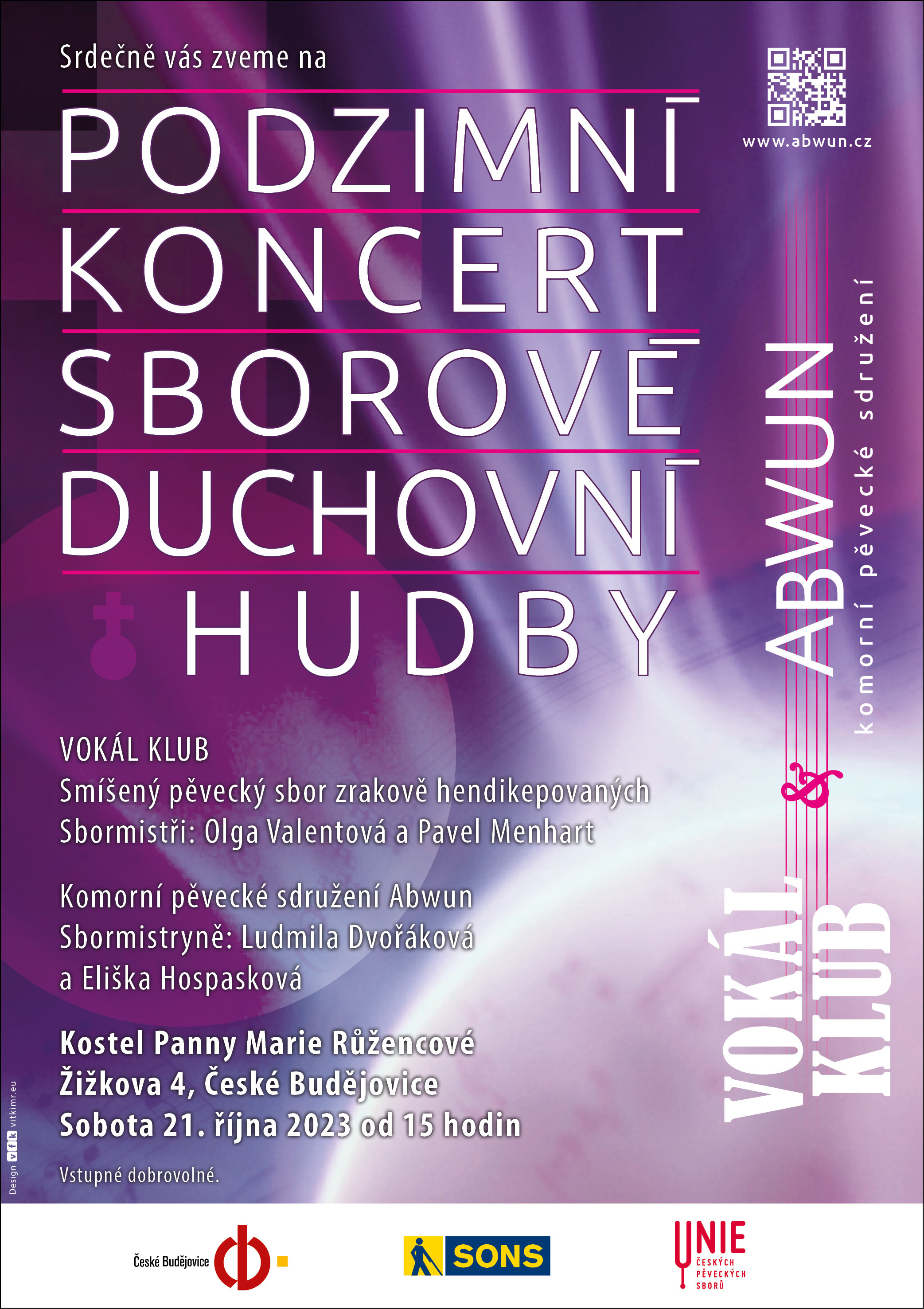 Chtěli bychom Vás pozvat na podzimní koncert sborové duchovní hudby, kde vystoupí Vokál klub společně s komorním pěvěckým sdružením ABWUN. Akce se bude konat 21. 10. 2023 od 15:00 v Českých Budějovicích v kostele Panny Marie Růžencové, Žižkova 4.