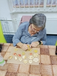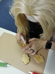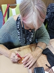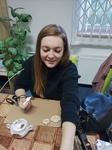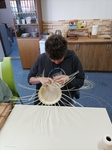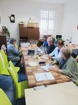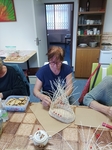 Pokračujeme dále v pletení z pedigu. Z tenkých proutků se pod šikovnými prsty účastníků postupně rodí košíky a misky. Práce vyžaduje trpělivost, ale také spolupráci a vzájemnou pomoc, kterou si všichni ochotně poskytují. Když se na stolech začaly objevovat hotové výrobky, nechyběl pocit hrdosti a spokojenosti z dobře odvedené práce.