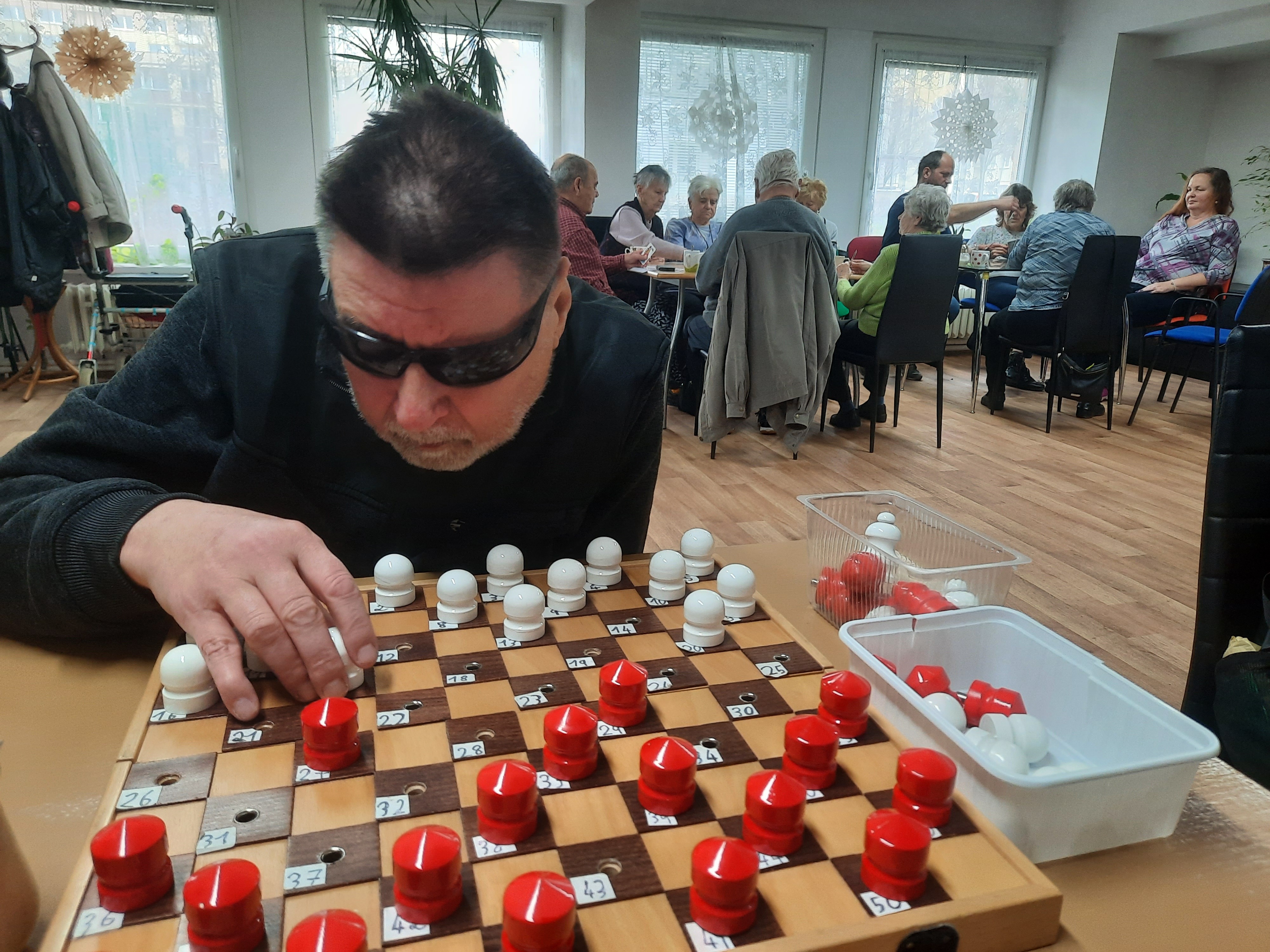 Pondělní odpoledne patří v POSEZu zábavě. Zahrát si můžete deskové hry, mariáš nebo si vyzkoušet zvukovou střelbu. Láďa má však nejraději mezinárodní dámu.