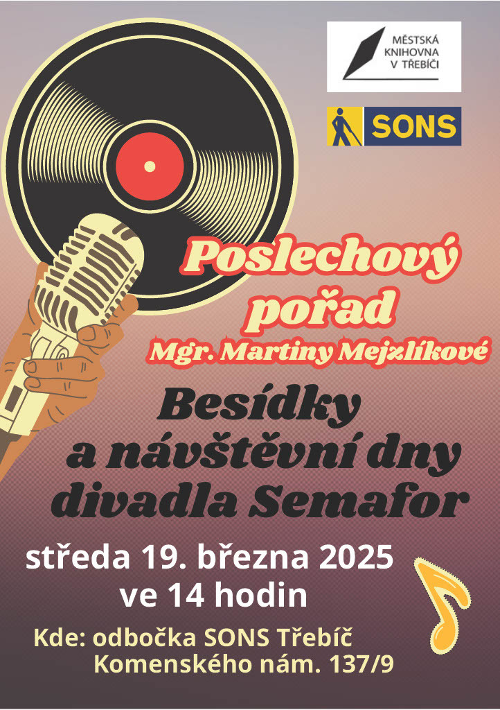 Městská knihovna Třebíč ve spolupráci s OO Třebíč SONS ČR, z.s. Vás zvou na poslechový pořad Mgr. Martiny Mejzlíkové- Besídky a návštěvní dny divadla Semafor- Povídky Šimka s Grossmanna. Budeme se těšit.