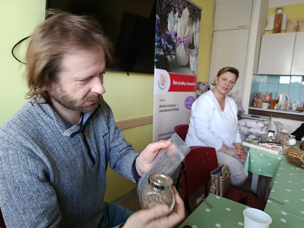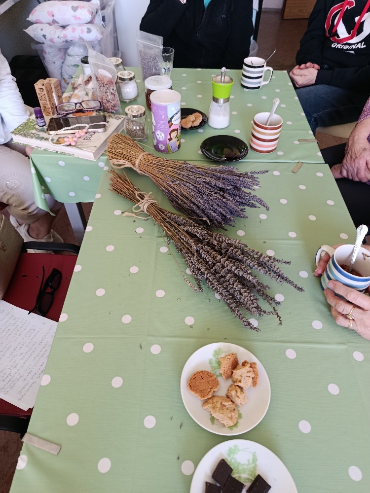 Přivezla nám na ukázku mnoho produktů z levandule, například vonné oleje, levandulovou vodu, polštářky s levandulí pro dobrý spánek, koupelovou sůl s bylinkami, levandulové víno, kávu, sušenky nebo čokoládu. Přítomní členové si mohli vše vyzkoušet, ochutnat, přivonět, takže jsme zažili odpoledne plné chutí a vůní. Paní Krejčová nám povyprávěla o svých zkušenostech z práce na zahraničních levandulových farmách, svou cestu právě k této činnosti a mnoho zajímavých informací k produktům z levandule.