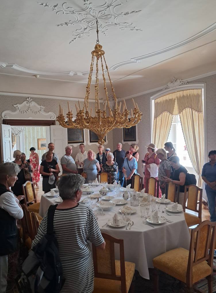 Zde jsme navštívili a prohlédli si reprezentační prostory velkých salónů, dámských apartmá a zbrojnice. Prohlídku zámku jsme měli komentovanou paní kastelánkou, která uměla odpovědět na všechny naše dotazy. Velmi jsme ocenili její přístup s podrobným popisem interiérů a jejich vybavení s možností dotknout se některých. Poté jsme měli možnost vstoupit, prohlédnout si a přivonět ke květinám v nádherné všemi barvami hrající parádně aranžované zámecké zahrady a jedinečnou promenádní kolonádou.