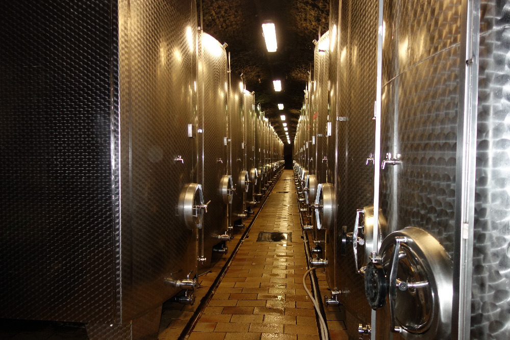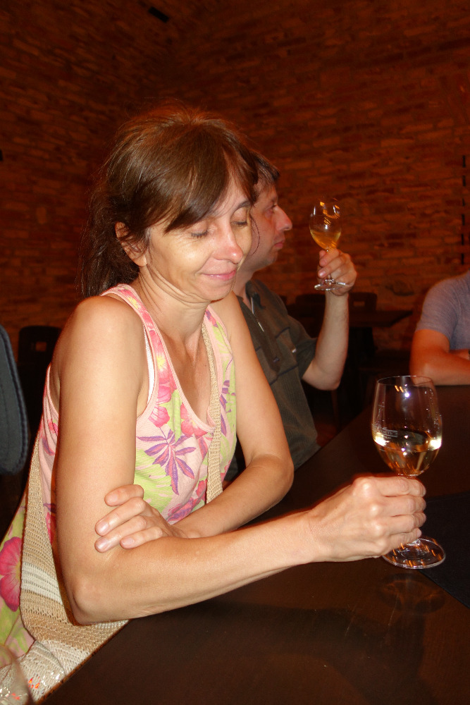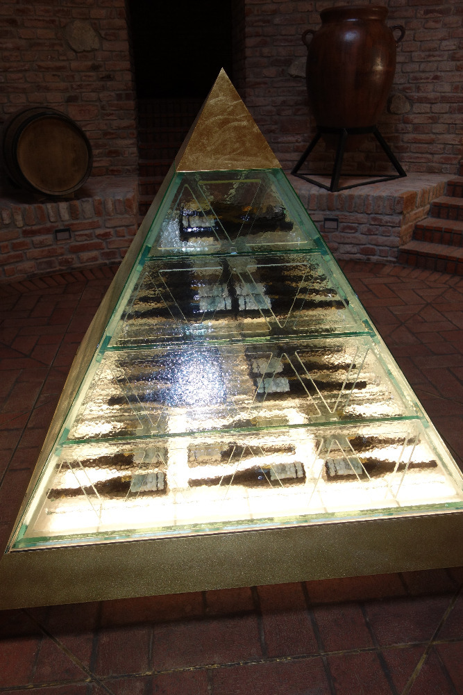 Při průzkumu sklepních prostor jsme zjistili mnoho zajímavostí. Třeba, že sklep pojme přes 1 milion litrů vína. Červené víno zraje v dubových sudech, bílé zase v moderních nerezových cisternách. Ohaptovali jsme si spletité potrubí a velké různě tvarované sudy na víno. V archivu vinařství najdeme také přes 50 tisíc lahví vína a ročně zpracovávájí přibližně 4500 tun hroznů. Jako to správné tajuplné sklepení mají i tyto sklepy svou mystiku. Ze staré části sklepů jsme prošli do nově vybudované části tzv. chrámu vína s rotundou. Ta je vybudována podle vzoru římského Pantheonu a stejně jako on vychází z tzv. posvátné geometrie kruhu a čtverce a magického čísla 8. Rotunda má také osm východů. Vzájemným propojením všech prvků má vzniknout centrum plné zvláštní energie. Téměř mezi prvními jsme zde viděli novou skleněnou pyramidu, která ukrývá ty největší vinařské poklady. Je v ní cca. na rok uloženo 50 lahví, na které skrze kruhový okulus „boží oko“ a pyramidu dopadá sluneční svit. Jaký vliv to všechno bude mít na uložené víno jsme všichni velmi zvědaví. Rotunda má i kouzelnou akustiku, chodí zde zpívat valtický ženský sbor Výběr z bobulí. Úžasnou akustiku rotundy nám názorně demonstrovala svým libozvučným zpěvem naše členka Naďa.