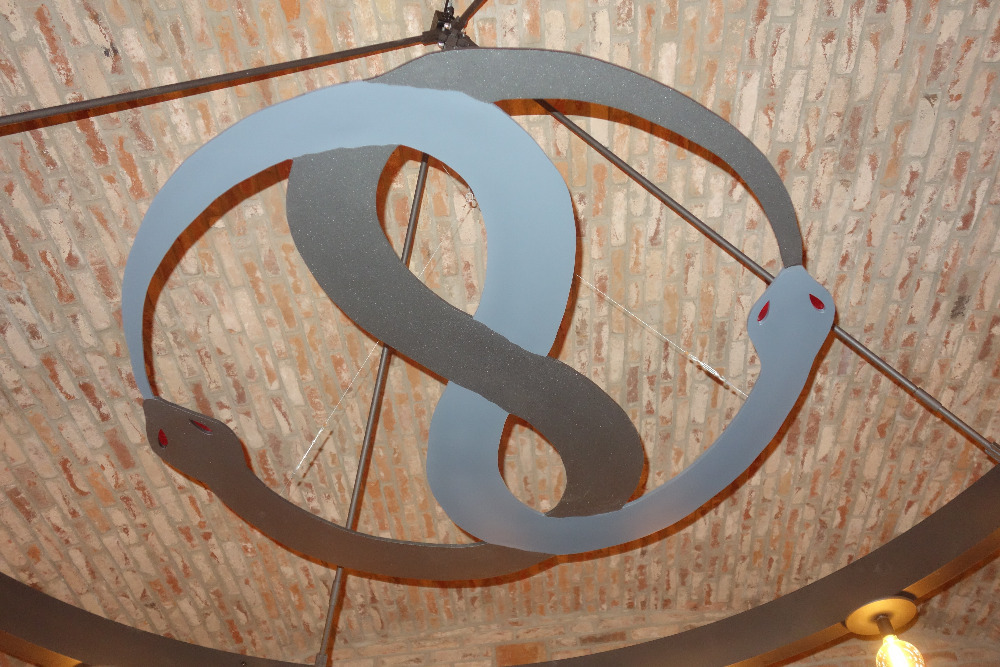 Posledním navštíveným místem byl Moravský vinný sklep. Ten se nachází přímo pod Vinařskou stodolou. Jsou zde dva nové, cihlové sklepy, které jsou vzájemně průchozí a spojuje je mezi sebou unikátní oboustranný krb. V jednom ze sklípků byl pro nás připraven stůl a naše posezení tak mohlo začít. Vínečka na degustaci vybral pan Pospíšil naprosto fantastická a prvotřídní. Jako první jsme degustovali Sylvánské zelené pozdní sběr ročníku 2015. Toto víno vyhrálo i pohár Vinařské unie ČR. Na Sylvánském zeleném si firma velmi zakládá je samotnou takovou doménou toho vinařství. Druhý přišel na řadu lahodný a voňavý Muškátek moravský, pozdní sběr z roku 2016. Výběr bílých vín jsme zakončili tentokrat dokonce výběrem z bobulí a trošičku jsme „ztramínkovali“. Z červených vín jsme následně ochutnali odstín tmavé třešně s černým rybízem v podobě Merlotu a omamně borůvkový Dornfelder. Obě vína taktéž pozdní sběry z roku 2016. Při degustaci na nás z obřího lustru dohlížel had Uroboros propletený s číslem 8 symbolizující nekonečno. Je pravda, že kdybychom mohli zůstaneme tady obklopeni skvělým vínem a společností asi napořád. Čas však plyne nezávisle na nás a naprosto fenomenální prohlídka sklepů Chateau Valtice a jejich nově vybudovaných reprezentačních prostor byla ukonce. Průvodce pan Jiří Pospíšil je opravdový odborník přes vína. Maximálně se nám věnoval a bavil nás svou milou společností i svými vtípky přes 3 hodiny. Vinné sklepy Chateau Valtice jsou takovou kombinací historie a moderní doby. Myslím si, že nynější majitelé ze sklepů vytvořili vzkvétající vinařské impérium, na které by byl i slavný rod Liechteinsteinů právem hrdý.