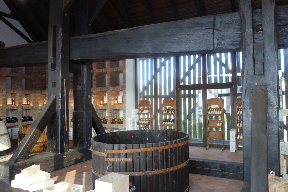 No ale teď už trošku z jiného soudku. V nově vybudované Vinařské stodole nás přivítal náš suprový průvodce Jirka Pospíšil. Tato unikátní stavba získala dokonce zvláštní architektonické ocenění Jihomoravského kraje v roce 2017. V nadzemní části je rozsáhlá vinotéka a je zde umístěn obří kládový lis, který byl převezen ze zámeckého sklepa, kde velmi trpěl vlhkostí. V novém prostředí mu to očividně svědčí. Díky své fotogeničnosti a dobré náladě, kterou mu dodává neustálá přítomnost kvalitních vín je vyhledávaným společníkem.
