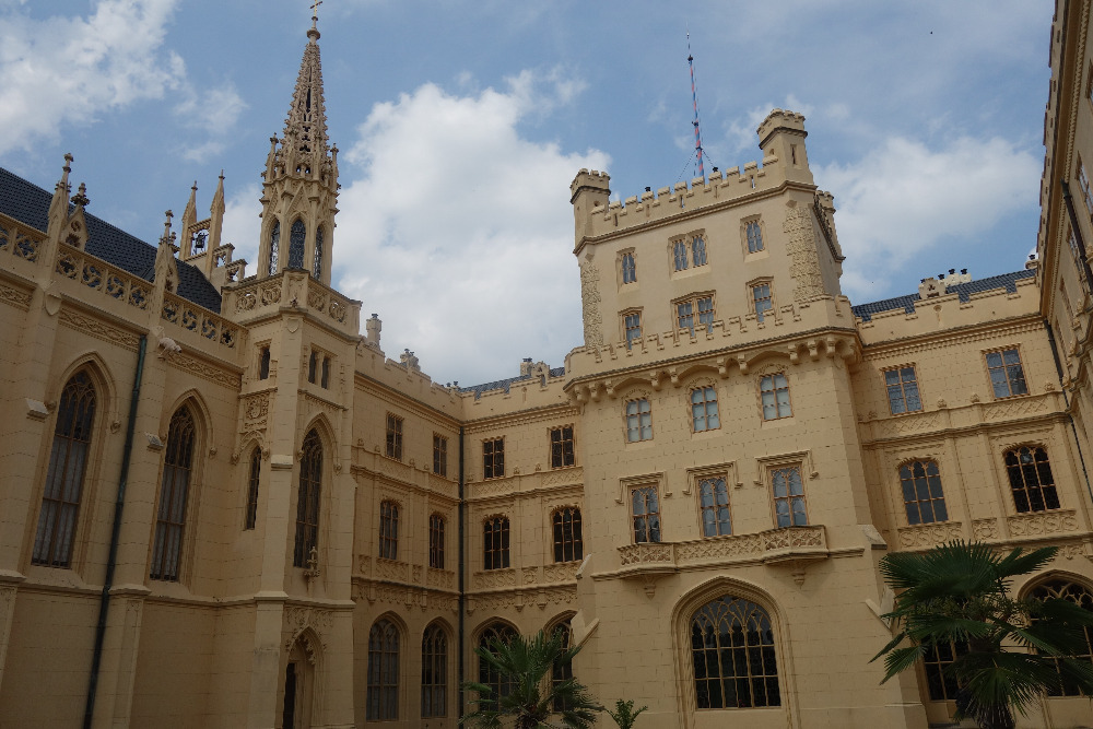 Po obědě jsme si rozhodně nemohli nechat ujít samotný klenot mezi zámky a navštívili jsme okruh, který nám přiblížil reprezentační prostory zámku Lednice. Prohlídku letního Liechteinsteinského sídla imitujícího tudorovskou gotiku jsme započali ve vstupní hale, kde se nachází samonosné, dřevěné schodiště. Před dávnými časy se nad ním nalézalo 11 portrétů předků, z nich zbyly pouze tři. Strop zde zdobí velký třípatrový lustr se 116 rameny, zavěšený ve výšce 15 metrů a vážící 690 kg. Prošli jsme také loveckým salónkem se spoustou exotických trofejí. Obdivovali jsme krásnou koupelnu z 19 století s mramorovou vanou. Její napouštění trvalo 9 hodin. Vleze se do ní voda o objemu 1200 l nebo také 5 sličných průvodkyň. Pokračovali jsme do ložnice kněžny Františky, kde se nachází empírová postel se zvířecíma nožkama i kopie psacího stolu císařovny Sissi. V aristokratických kruzích bylo velmi moderní mít na svém panství něco z orientálních zemích. V zámku proto nechybí Čínský pokoj s unikátním stolkem na ruční práce, vykládaný perletí a v Čínském kabinetu najdeme ručně malované tapety. Do středověku nás vrátil Rytířský sál jehož zdi zdobí zbroje měřící 153 cm a vážící 36 kg. V tamní zámecké jídelně mohlo panstvo rozdělat stůl dokonce po celé délce místnosti. V rozích místnosti jsou umístěny etažéry s cínovým nádobím. Nejznámější místností zámku je beze sporu knihovna. V ní se nachází překrásně vyřezávané schodiště. Vyrobeno je z jednoho kusu dřeva a nenajdete v něm jediný hřebík. V jeho zákoutích jsme hledali vyřezávanou žabku, mloka a ptáčka. Nade dveřmi knihovny je Křídlový oltář ze slonoviny a palisandru s rodokmenem Ježíše Krista ze 16 století, který používali Liechteinsteini při svých cestách. V tyrkysovém sále visí obraz těhotné Sydonie Alžběty hraběnky ze Salmu s pigmejem po svém boku. Bylo velmi ojedinělé se nechat namalovat v požehnaném stavu. Za svůj život porodila 24 dětí, z toho se dospělosti dožilo jen 9. Sama se dožila úctyhodných 65 let. Poslední navštívenou místností byl oslňující Modrý taneční sál s unikátním kazetovým stropem z lipového dřeva. Každá kosočtvercová kazeta je jedečná, žádný motiv se zde neopakuje. V místností dominuje obraz Persea a Andromedy. Povídá se o něm i následující příběh. Alois Josef II z Lichteinsteina byl velký obdivovatel tohoto obrazu respektive něžnějšího pohlaví na něm zobrazeném. Jeho neustálé „okukování“ půvabů „hambaté“ Andromedy se však nelíbilo jeho žárlivé ženě Františce. Alois si nechtěl svou milovanou choť rozhněvat a tak pro klid manželství umístil sofa opačným směrem. Jenže byl to „lišák“ tuze mazaný, nad krásný mramorový krb si nechal umístit benátské zrcadlo v jehož odraze stále mohl pozorovat Andromedu. Ze sálu jsme vyšli ven na terasu, kde jsme mohli ještě obdivovat venkovní část tohoto pohádkového zámku, pyšnícího se nádherným interiérem i mobilitářem. Okolní přírodní scenérie spolu s romantickými salety a sedmset letou historií rodu Liechtensteinů, která na člověka dýchá snad při každém kroku spolu vytváří v Lednici nezaměnitelné genius loci, kterému jen málo kdo, dokáže odolat. Tak co, že by jsme se zde zastavili i do třetice?