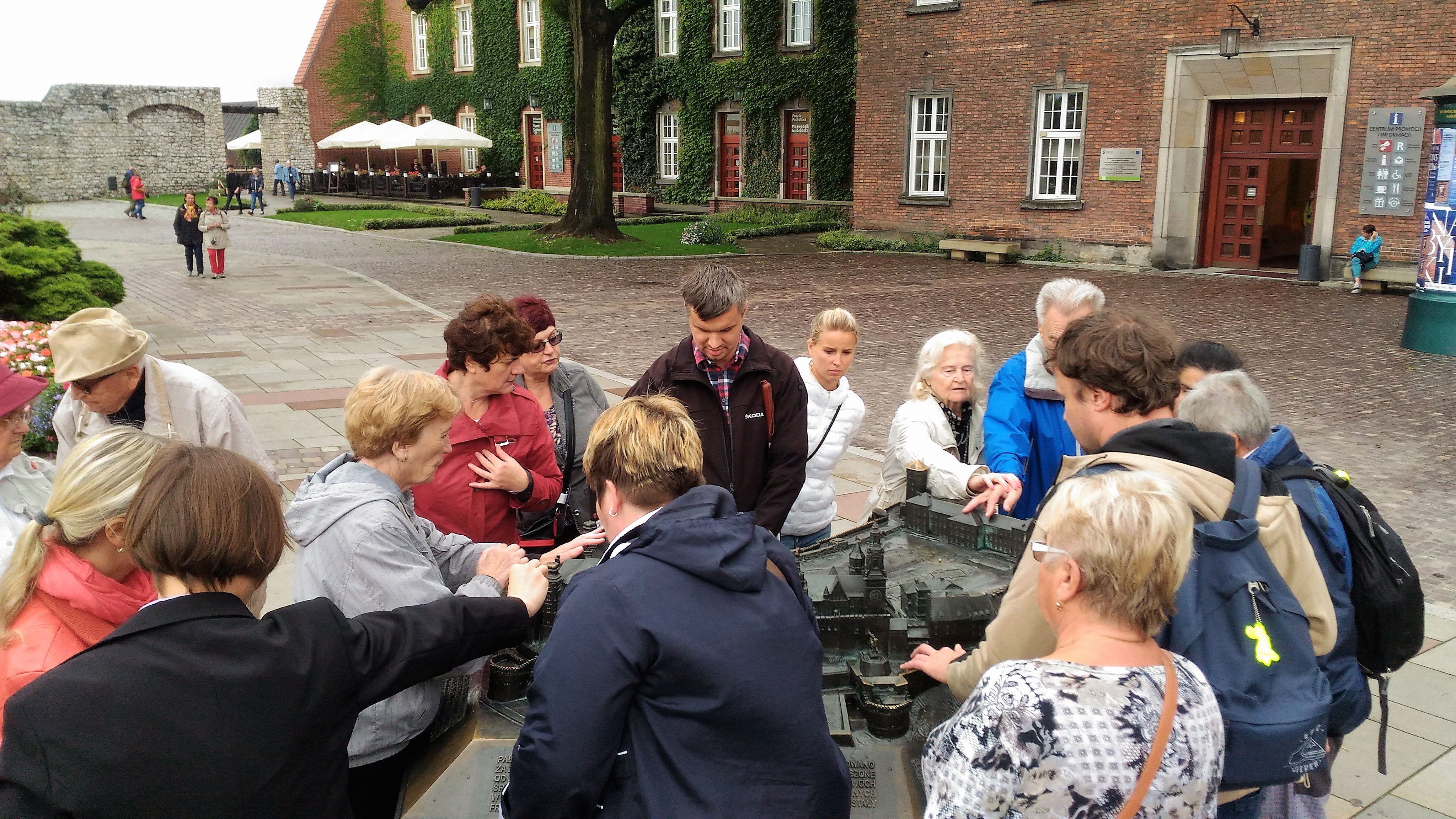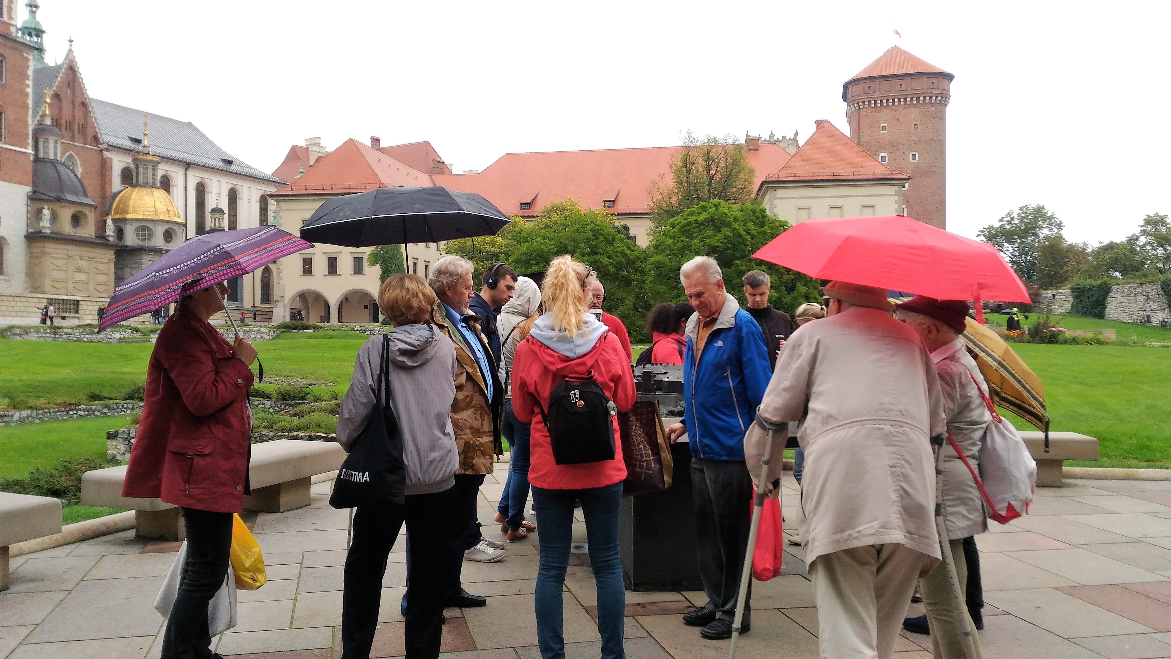 Jelikož nás trochu pozlobilo počasí a od rána velmi hustě pršelo, místo procházky po historickém centru Krakova jsme se rozhodli pro návštěvu nákupního centra Bonarka, kde jsme si mohli nakoupit suvenýry i jiné věci pro sebe či pro příbuzné. Okolo poledne nás pak již čekala prohlídka zámku a katedrály na Wawelu. Naše paní průvodkyně paní Renata Tatoj byla velmi milá, česky mluvící Polka, navíc se zkušeností s průvodcováním zrakově postižených dětí. Díky tomu jsme se dočkali velmi podrobného a zajímavého výkladu o historii hradu Wawel a jeho dřívějších obyvatelích. Navíc jsme si také mohli i hapticky vyzkoušet některé exponáty – a to prostřednictvím vzorků tkanin, které paní průvodkyně zajistila – například kousky čalounění nábytku, tapet i gobelínů, jichž na wawelských zdech visí nespočet.