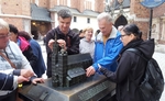Po prohlídce zámku a katedrály jsme měli sraz s panem prezesem Ortylem, který se nám dříve nabídl jako průvodce po historické části Krakova. S ním jsme se vydali po slavné Královské cestě – cestě, která vede kolem nejhezčích památek (např. tržiště Sukienica, Floriánská brána, Katedrála sv. Stanislava a Václava, Mariánský kostel, Kostel sv. Petra a Pavla či Barbakán) a je zvláštní tím, že je po ní rozeseto celkem 12 bronzových haptických modelů všech důležitých míst. U těchto modelů jsme se zastavili, abychom si je mohli prohlédnout a pan prezes nám k nim vždy podal bohatý výklad (za překlad z polštiny děkujeme paní Andrýskové J). Náročný den jsme zakončili ve stejné restauraci, kde jsme samozřejmě ochutnali tradiční polská jídla – hustou polévku žurek a bigos (jídlo podobné boršči, se zelím a masem).