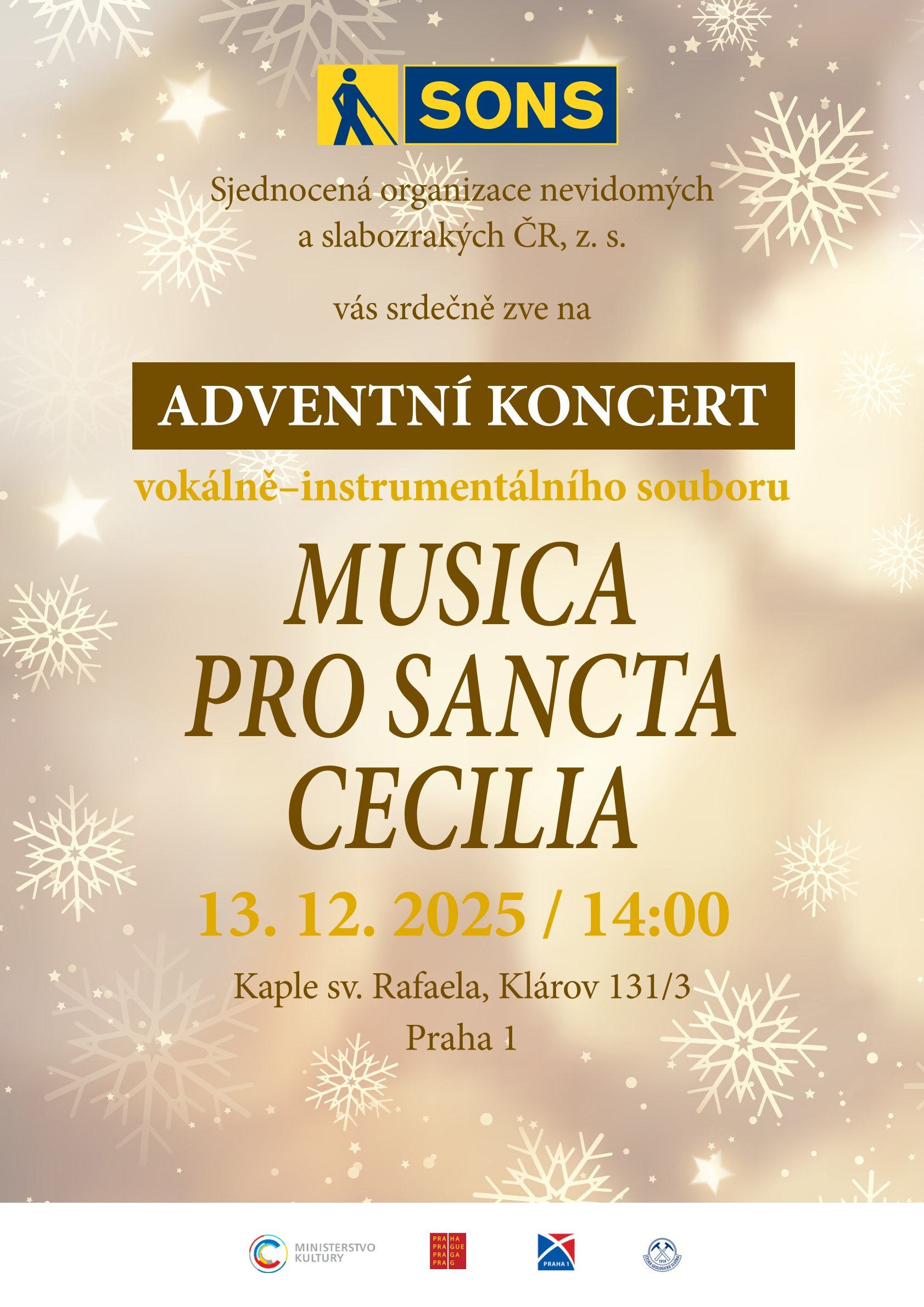 Zveme Vás na adventní koncert konaný 13.12.2025 ve 14 hodin. Účinkuje vokálně–instrumentální soubor Musica pro Sancta Cecilia, který se zaměřuje především na interpretaci hudby z období gotiky, renesance a baroka. Soubor vznikl v roce 1992 na půdě pražské Konzervatoře a ladičské školy Jana Deyla (konzervatoř pro zrakově postižené), dnes v souboru působí 7 absolventů této konzervatoře. Pod současným názvem, který byl vybrán podle patronky hudebníků Svaté Cecilie, Musica pro Sancta Cecilia soubor vystupuje od roku 1994. Všichni členové se práci v souboru věnují ve svém volném čase, většina z nich vyučuje na hudebních školách v Praze a jejím blízkém okolí.