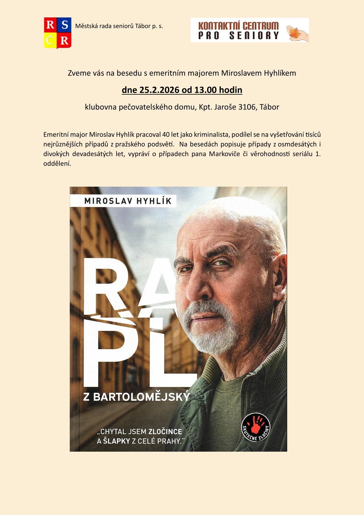 Zveme Vás na besedu s emeritním majorem Miroslavem Hyhlíkem, který pracoval 40 let jako kriminalista, podílel se na vyšetřování tisíce nejrůznějších případů z pražského podsvětí. Na besedách popisuje případy z osmdesátých i divokých devadesátých let, vypráví o případech pana Markoviče či věrohodnosti seriálu 1. oddělení.