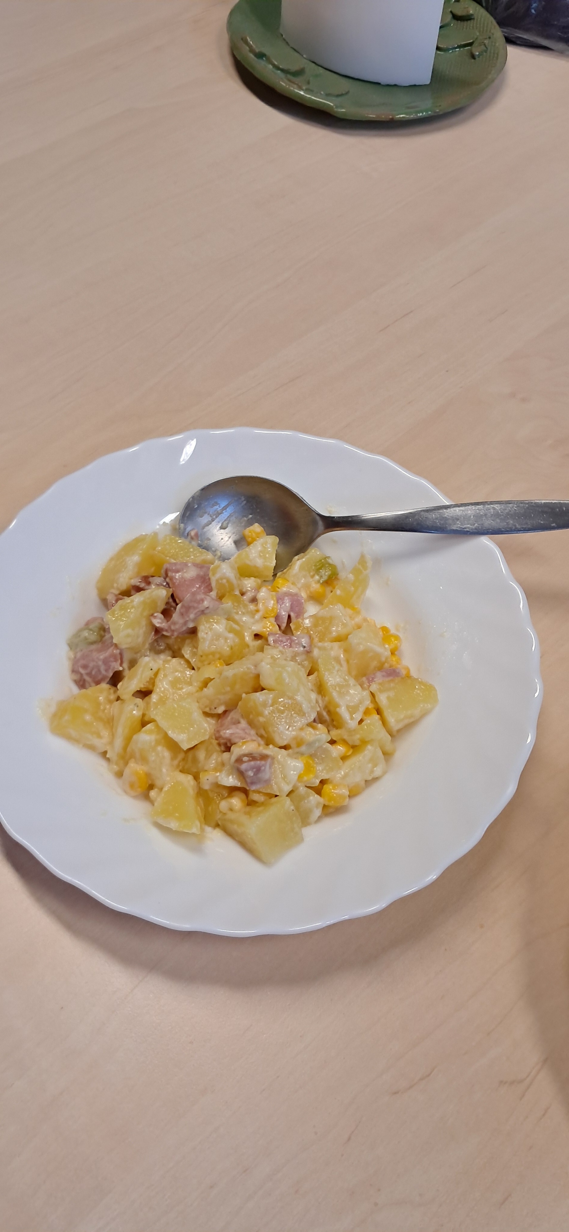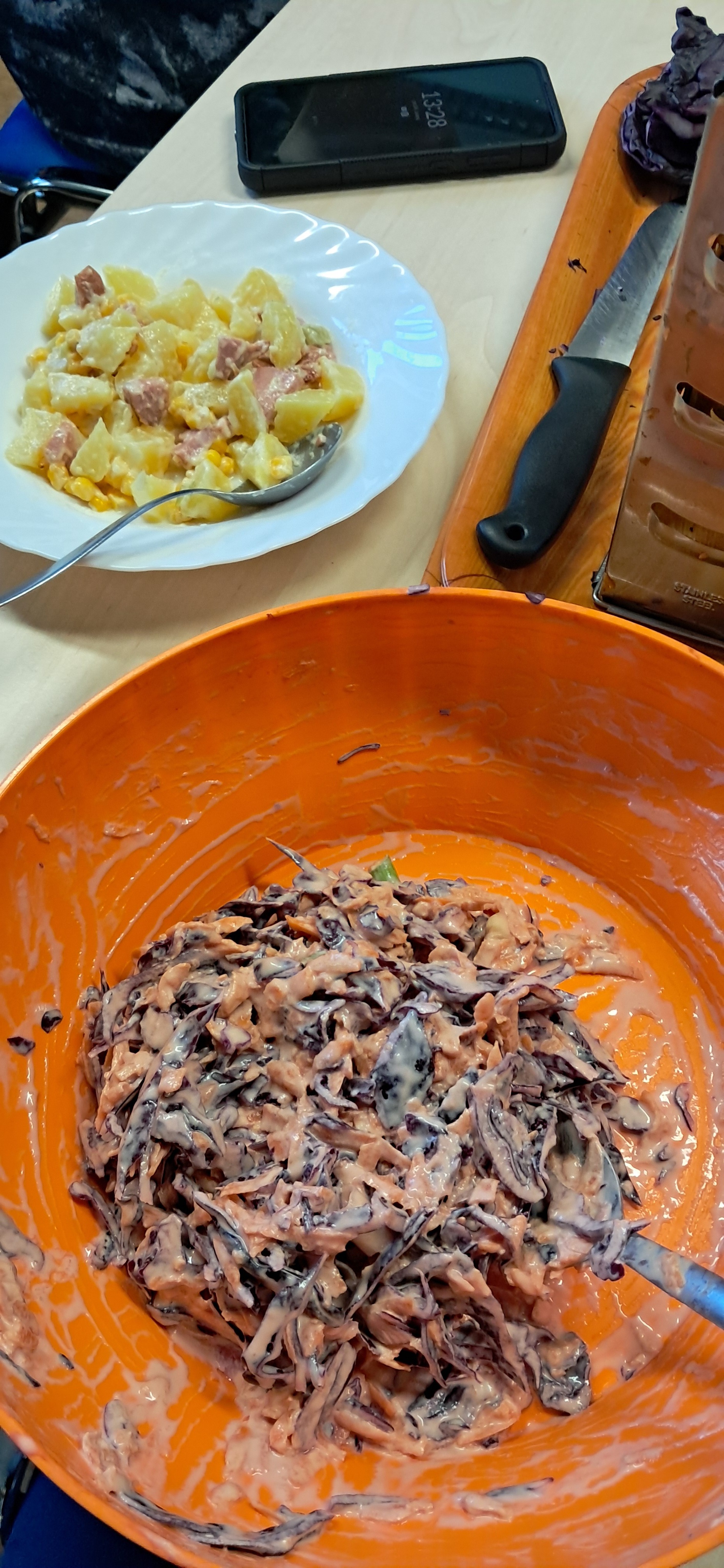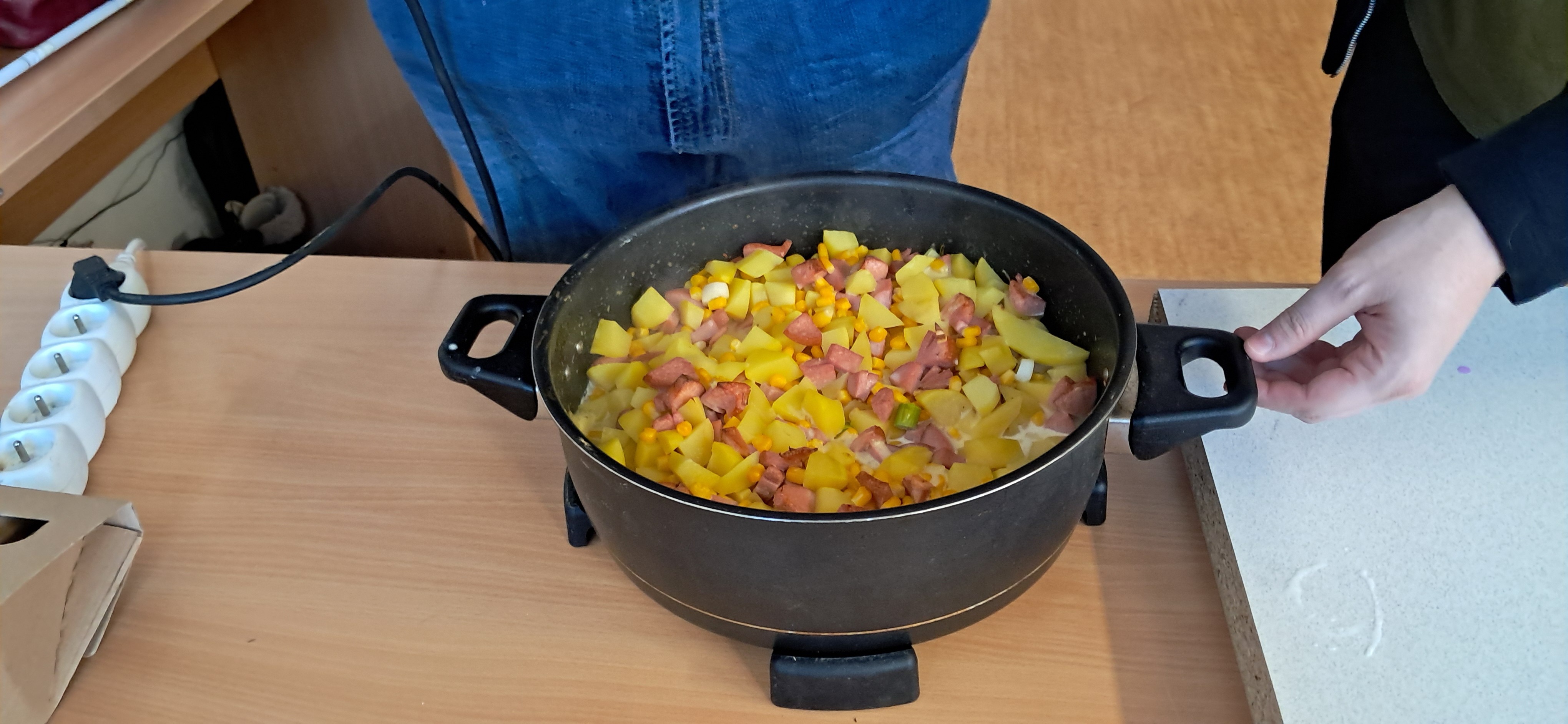 V pondělí 24. února jsme dělali v remosce zapečené brambory se salámkem a sýrem a zelný salát Coleslaw.