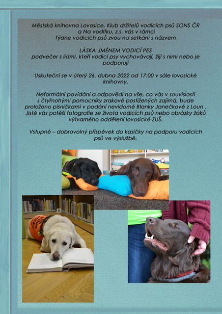 Městská knihovna Lovosice, Klub držitelů vodicích psů SONS ČR, z.s. a Na vodítku, z.s. vás v rámci Týdne vodicích psů zvou na setkání s názvem: “LÁSKA JMÉNEM VODICÍ PES“. Podvečer s lidmi, kteří vodicí psy vychovávají, žijí s nimi nebo je podporují.
