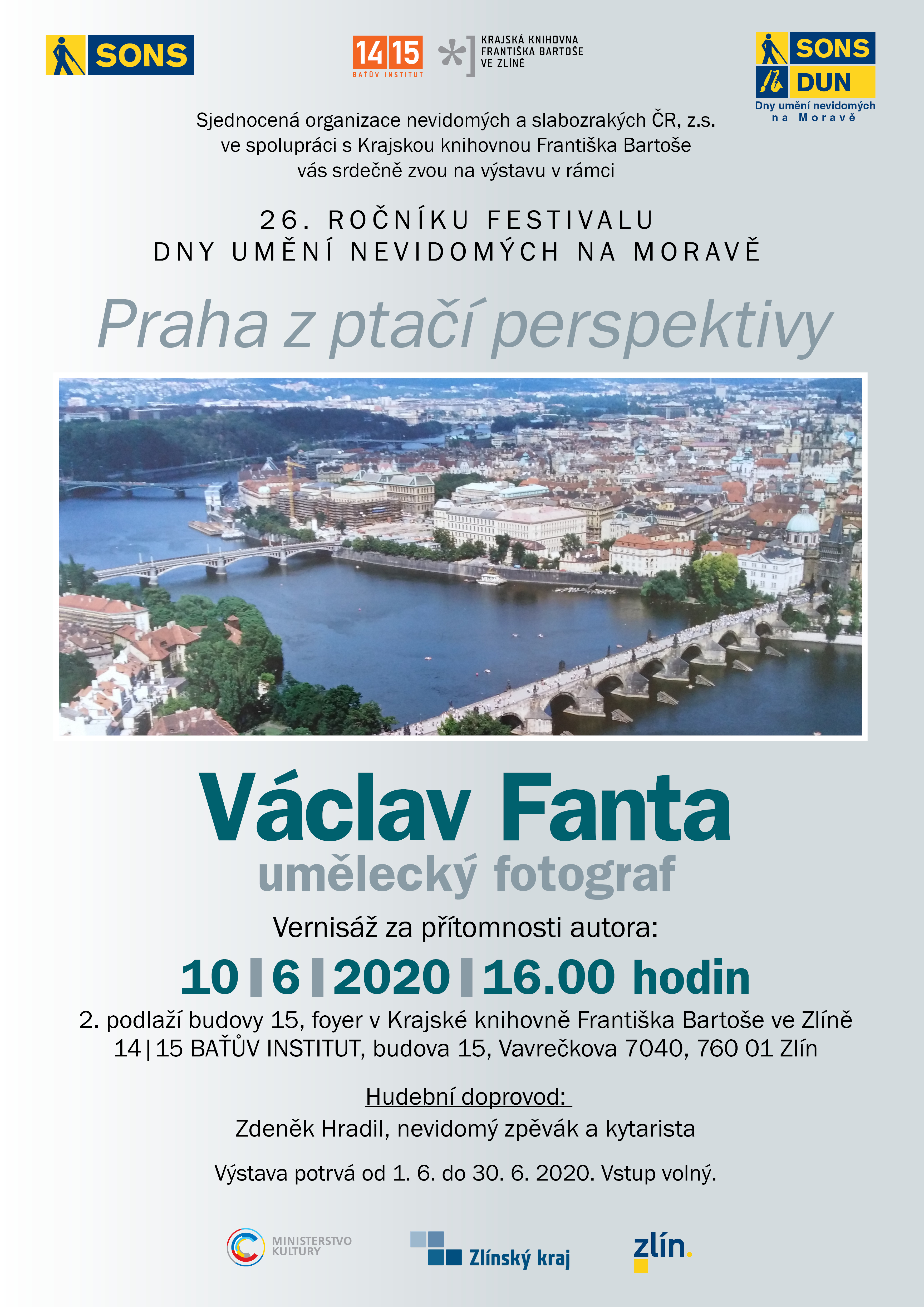 V rámci festivalu Dny umění nevidomých na Moravě vás srdečně zveme na vernisáž výstavy nevidomého fotografa Mg.A. Václava Fanty - Praha z ptačí perspektivy, která se koná dne 10.6.2020 od 16.00 ve foyer Krajské knihovny Františka Bartoše ve Zlíně (budova 15 - Baťův institut). Hudební doprovod - kytarista Zdeněk Hradil