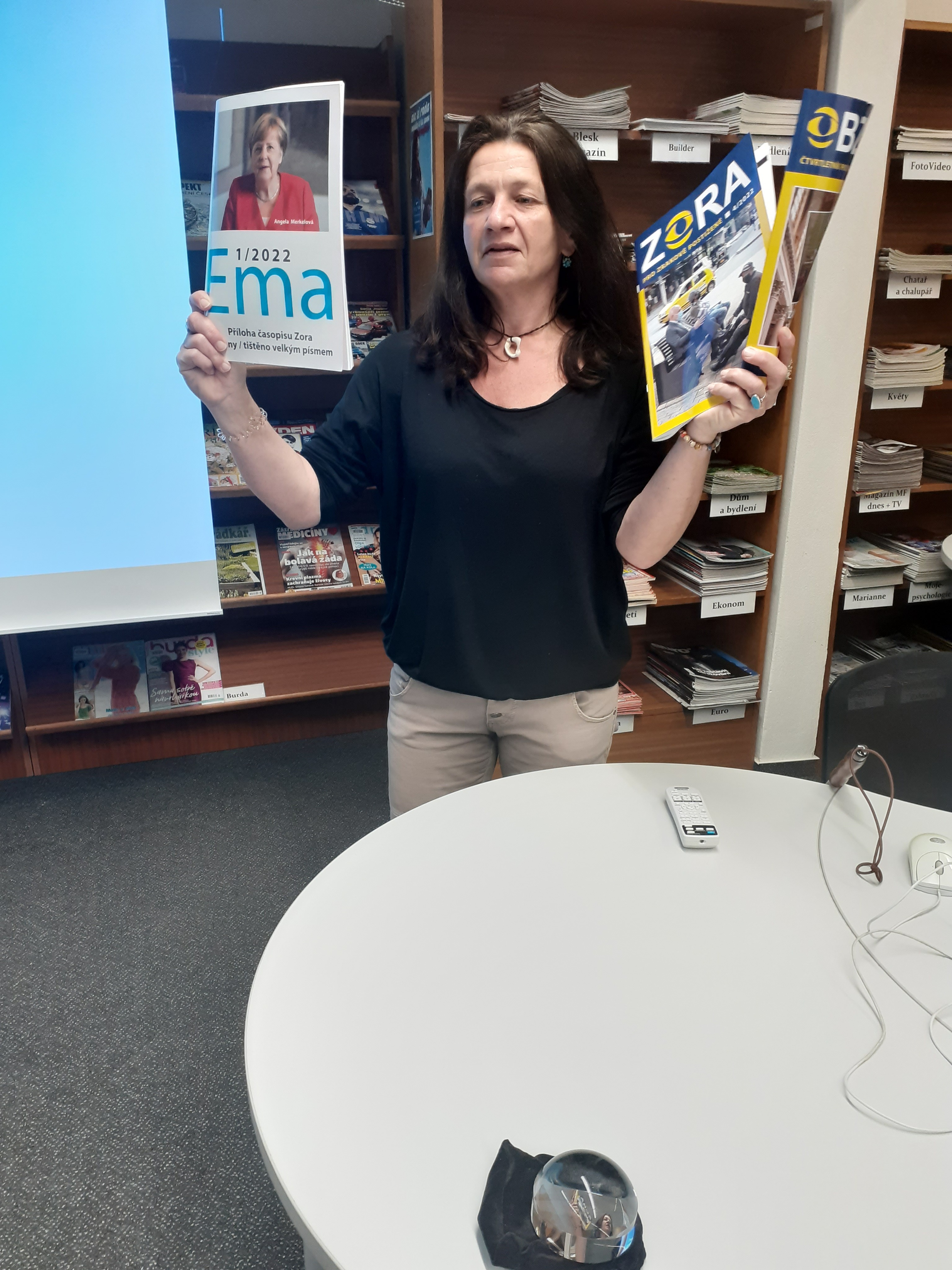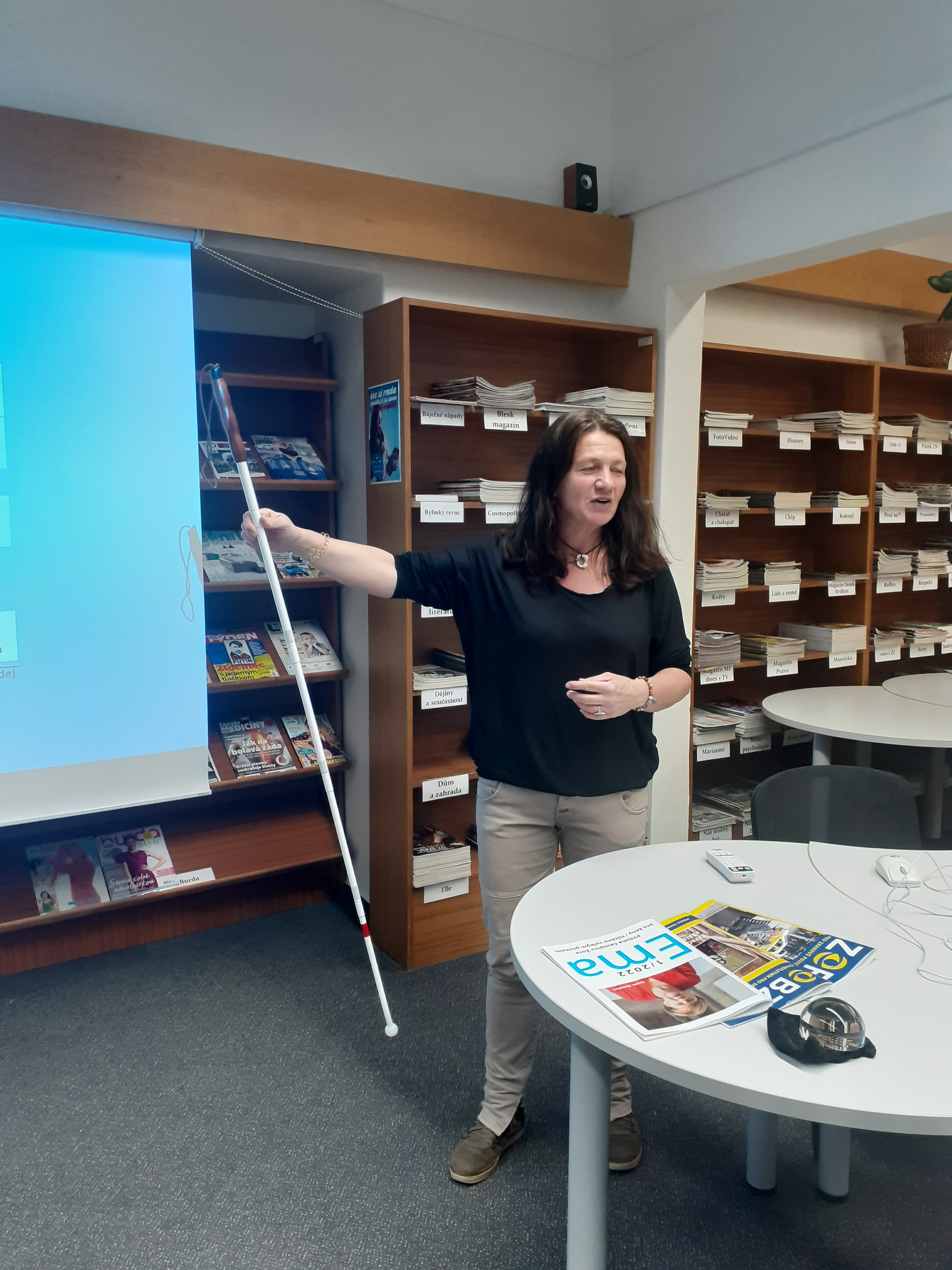Součástí přednášky bylo představení naší Sjednocené organizace nevidomých a slabozrakých ČR. Byla představena naše služba, naše činnost a aktivity. Odstartovali jsme tímto budoucí vzájemnou spolupráci SKIP – Svaz knihovníků a informačních pracovníků a SONS, která by měla obohatit život běžné společnosti i komunity zrakově postižených.