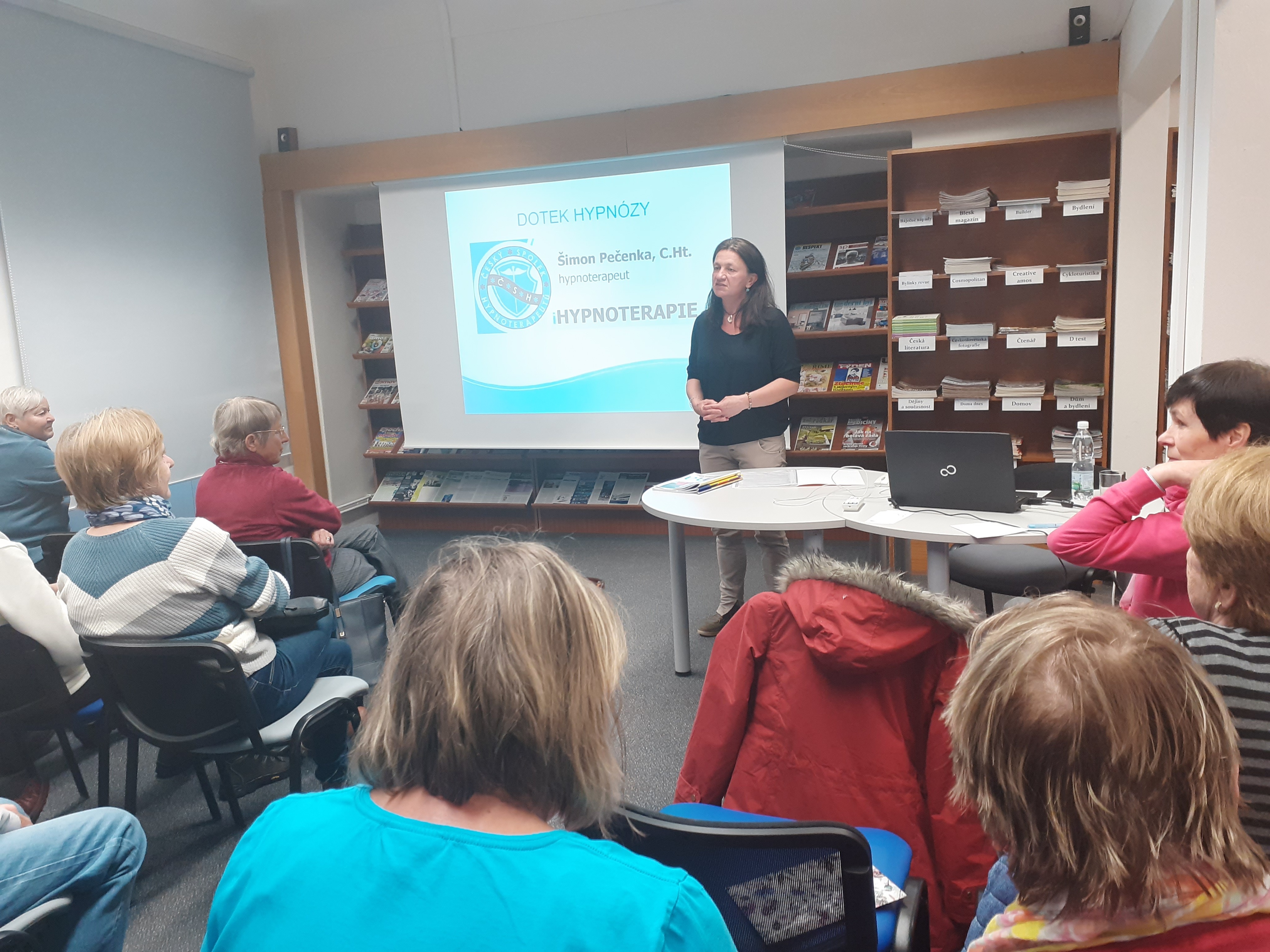 Dvě mouchy jednou ranou… tak by se mohl nazvat jeden úterní podvečer v místní knihovně. Sešli jsme se tam a jednak jsme si vyslechli přednášku pana Šimona Pečenky Dotek hypnózy, kdy jsme se dozvěděli opravdu mnoho zajímavých a nových věcí. Nejzajímavější byly ukázky z praxe. Hypnózu stále obestírá mnoho nesmyslných pověr a mýtů. Pro některé má dokonce punc jakési mystické dovednosti. Nám nechal pan Pečenka nahlédnout pod pokličku a dozvěděli jsme se, jak je to ve skutečnosti.