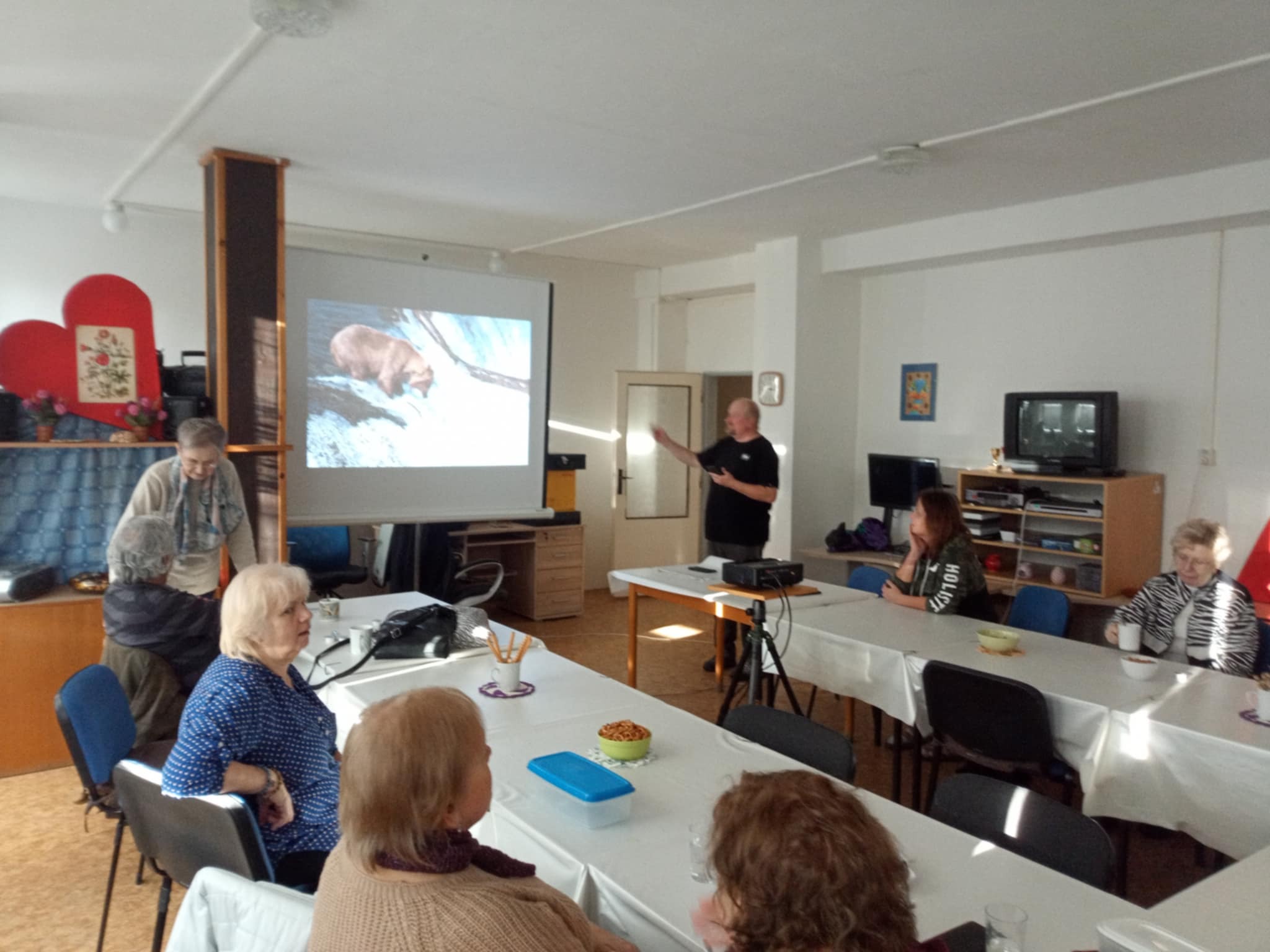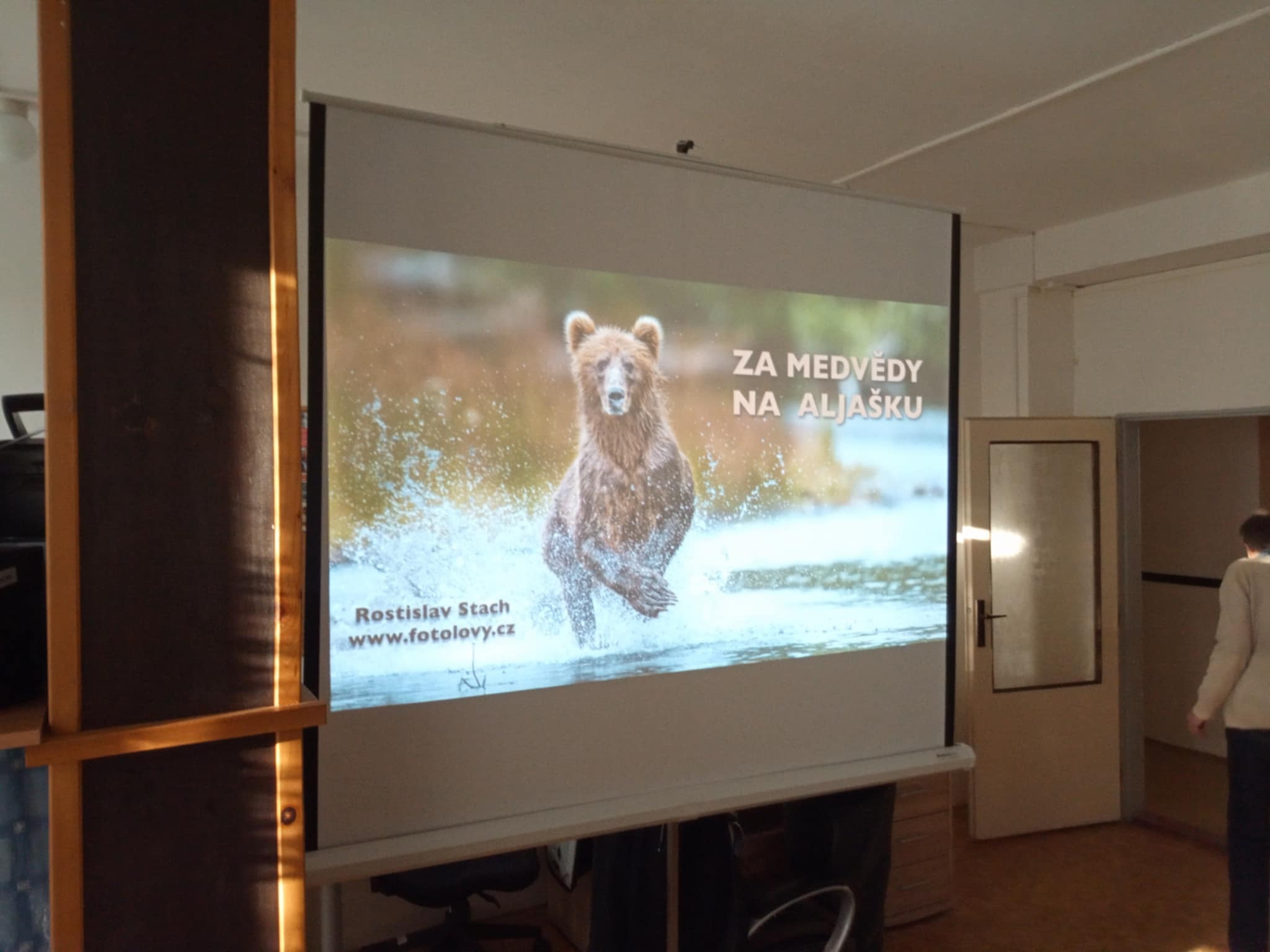 Poslechli jsme si přednášku cestovatele a fotografa Rostislava Stacha,který je dlouholetým milovníkem překrásné aljašské přírody a talentovaným fotografem.Promítal své fotografie a pouštěl film,pořízené během cest v národním parku Denali na Aljašce,na ostrově Kodiak a v Montaně v USA,které osobně se svou výpravou navštívil.Díky přednášce jsme mohli vidět nádhernou,divokou a stále člověkem neporušenou přírodu Severní ameriky.Shlédli jmě překrásné fotografie a film.Jeho vyprávění o zážitcích bylo poutavé a jedinečné.Proto se těšíme na další setkání s tímto dobrodruhem a talentovaným fotografem-cestovatelem.