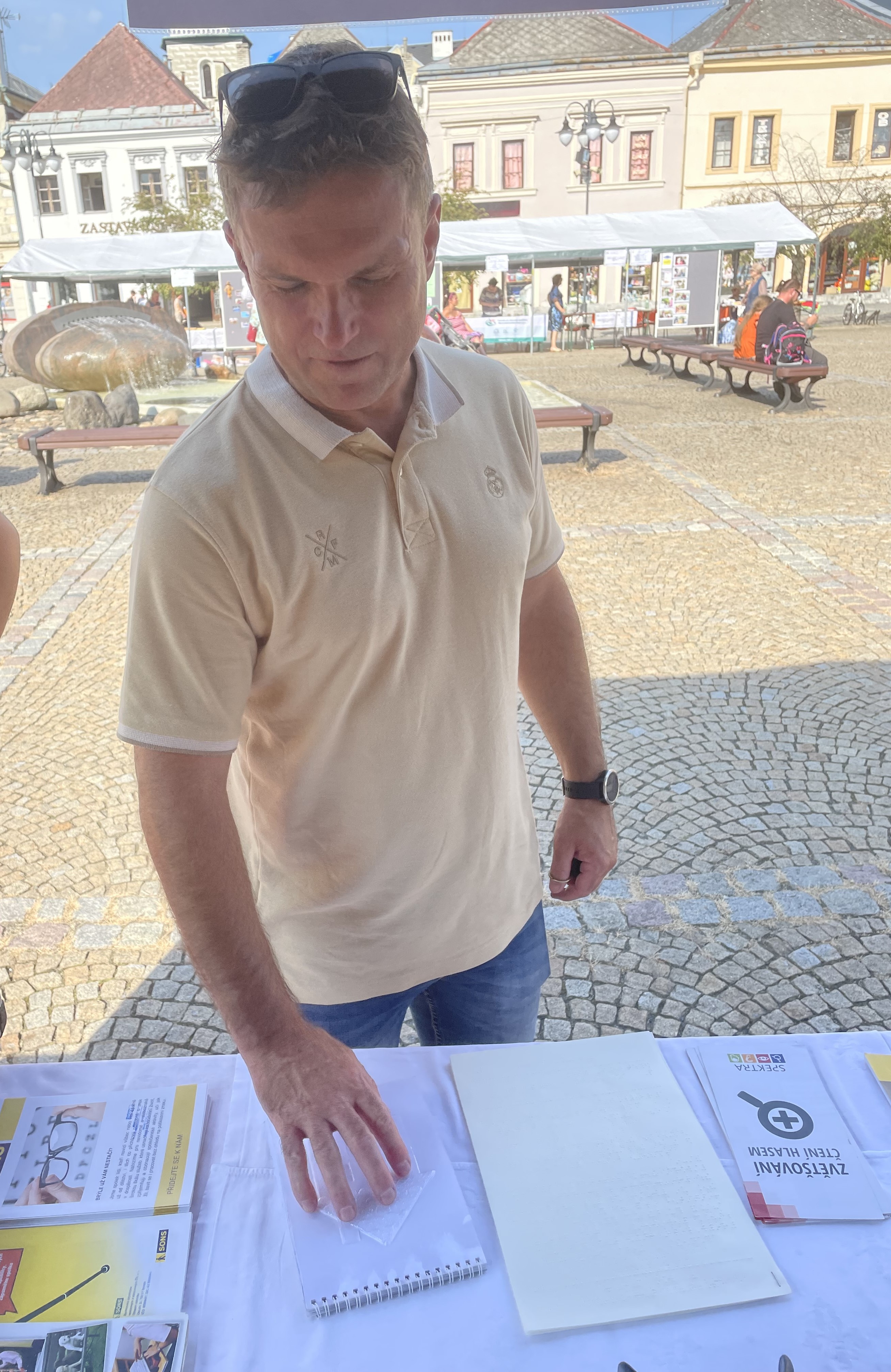 Dne 3.10.2025 se naše Oblastní Pobočka SONS ČR z.s. Bruntál se aktivně účastnila na dnech Sociálních služeb a zdraví v Horním Benešově byli zde přítomní i ostatní poskytovatele sociálních služeb působící na území Města Horní Benešov a okolních obcí například Eurotopia CZ o.p.s., Slezská diakonie, Sagapo p.o., Help-in, Nadace Pavla Novotného, Fosanima, Polárka. Poskytovatelé sociálních služeb přítomné seznámili se svou činností formou prezentace, ale i naše pobočka měla připravenou praktickou ukázkou chůze s bílou holí nebo si také přítomní měli možnost vyzkoušet simulační brýle, které poskytnout představu, co může zrakově postižený vidět s určitou oční vadou, dále platové lupy, hmatové omalovánky, ukázku Braillova písma a mnoho dalšího. Dále také přítomní návštěvníci mohli navštívit individuální poradenství v oblastí prevence zdraví například stánek na měření tlaku, nutriční poradenství, měření glykémie, onkologické poradenství a další. Také se dozvěděli, co je čeká v oblasti dávek důchodového pojištění a super dávky od roku 2026 od pracovnice Okresní správy sociálního zabezpečení. Jako novinka zde byla přítomná i parukářka o kterou byl obrovský zájem o hudební doprovod se postaral sbor Legato Krnov, který celé odpoledne vyplnil zpěvem, do kterého se zapojil i pán starosta Ing. Pavel König.