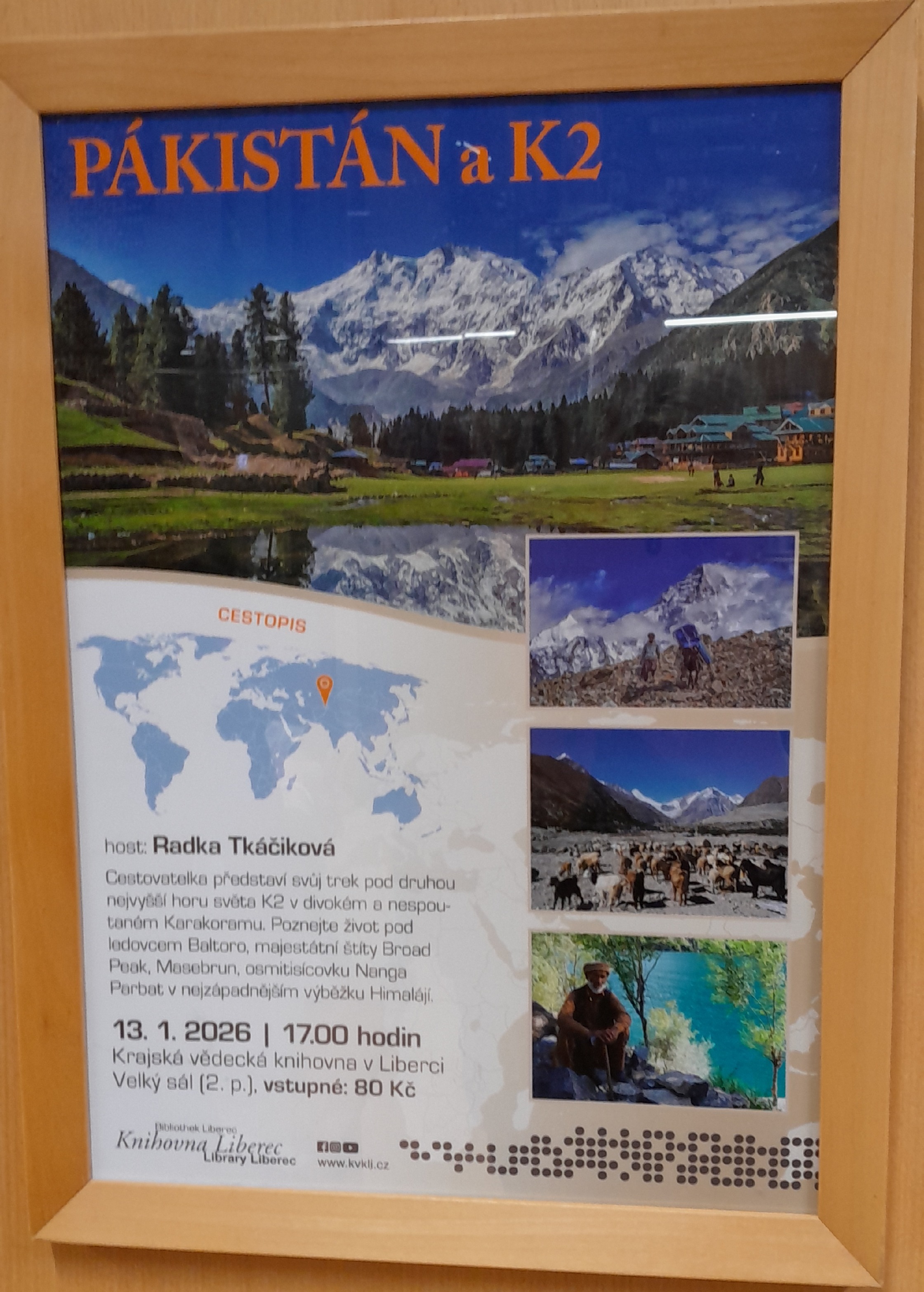 V úterý 13. ledna jsme s našimi členy SONS zavítali do Krajské vědecké knihovny v Liberci na přednášku s názvem PÁKISTÁN A K2. Cestovatelka Radka Tkáčiková nám představila svůj trek pod druhou nejvyšší horu světa K2 v divokém a nespoutaném Karakoramu. Přiblížila nám život pod ledovcem Baltoro, majestátní štíty Broad Peak, Masebrun, osmitisícovku Nanga Parbat v nejzápadnějším výběžku Himalájí, ale i Karakoram Higway podél majestátní řeky Indus.