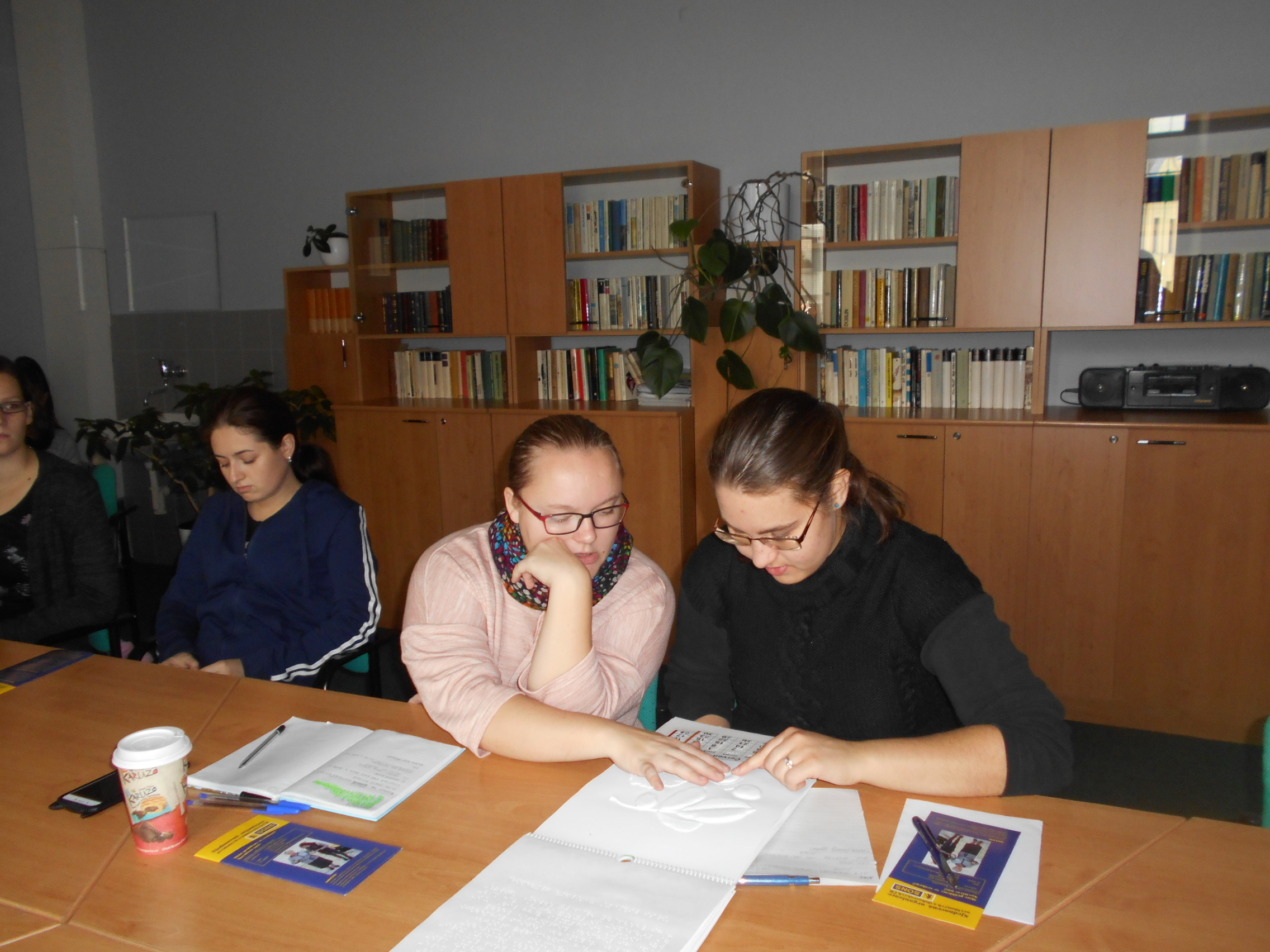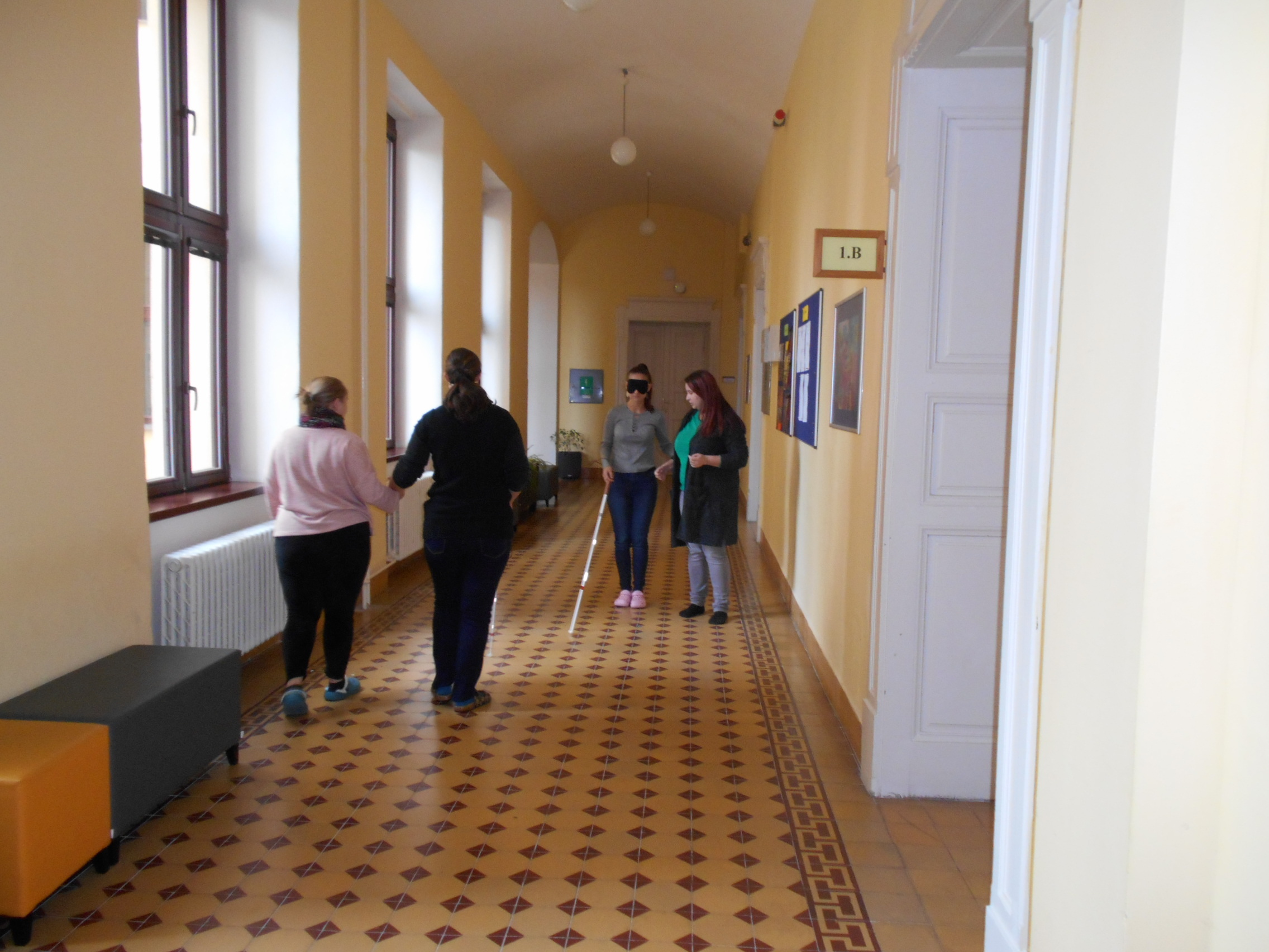 Studenti byli seznámeni s hlavním posláním SONS ČR a jejími projekty, s činností Oblastní odbočky v Kroměříži zahrnující sociální poradenství a sociální aktivizační služby, dalšími odbočkovými aktivitami a návaznými službami pro zrakově postižené poskytovanými o. p. s. Tyfloservis a krajskými Tyflocentry. Prohlédli si některé z kompenzačních pomůcek umožňujících zrakově postiženým zvládání každodenních situací, orientaci a samostatný pohyb. V rámci prostorové orientace se studenti seznámili s přirozenými a umělými vodícími liniemi, akustickými a reliéfními prvky pro orientaci a navigaci v terénu, typy bílých holí a základními technikami chůze s bílou holí, které si měli možnost prakticky vyzkoušet. Dále byli poučeni o správné komunikaci a přístupu k nevidomým, jak nevidomého oslovit, kdy nabídnout pomoc a jak nevidomé správně a bezpečně provázet. Ve dvojicích a s klapkami na očích si sami vyzkoušeli role nevidomých i jejich průvodců.