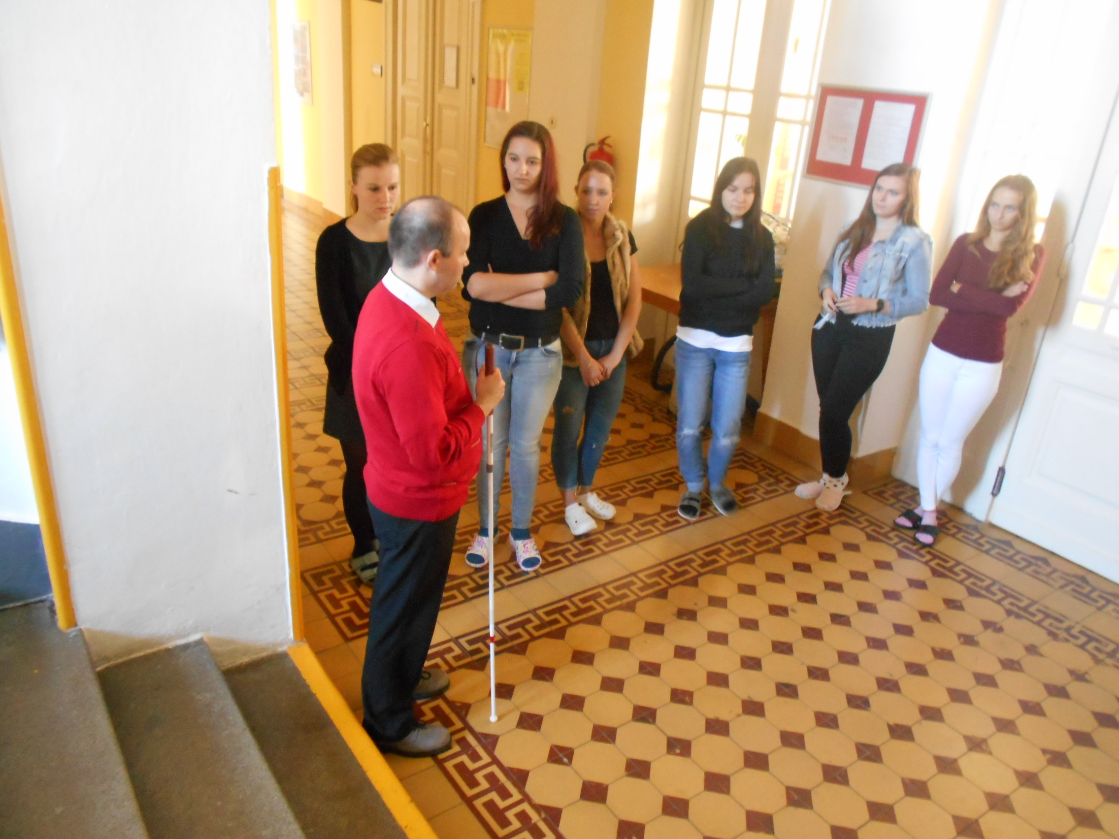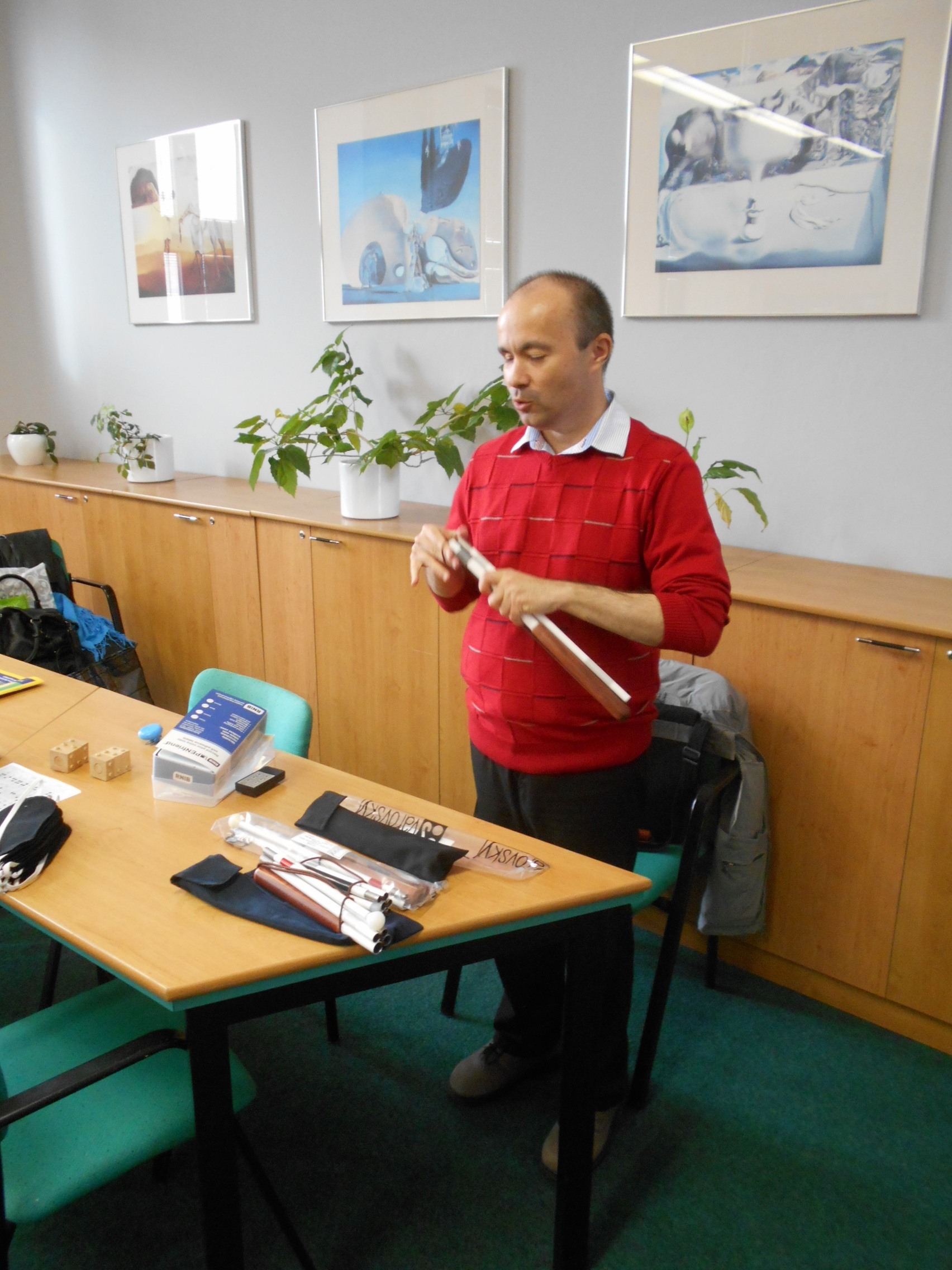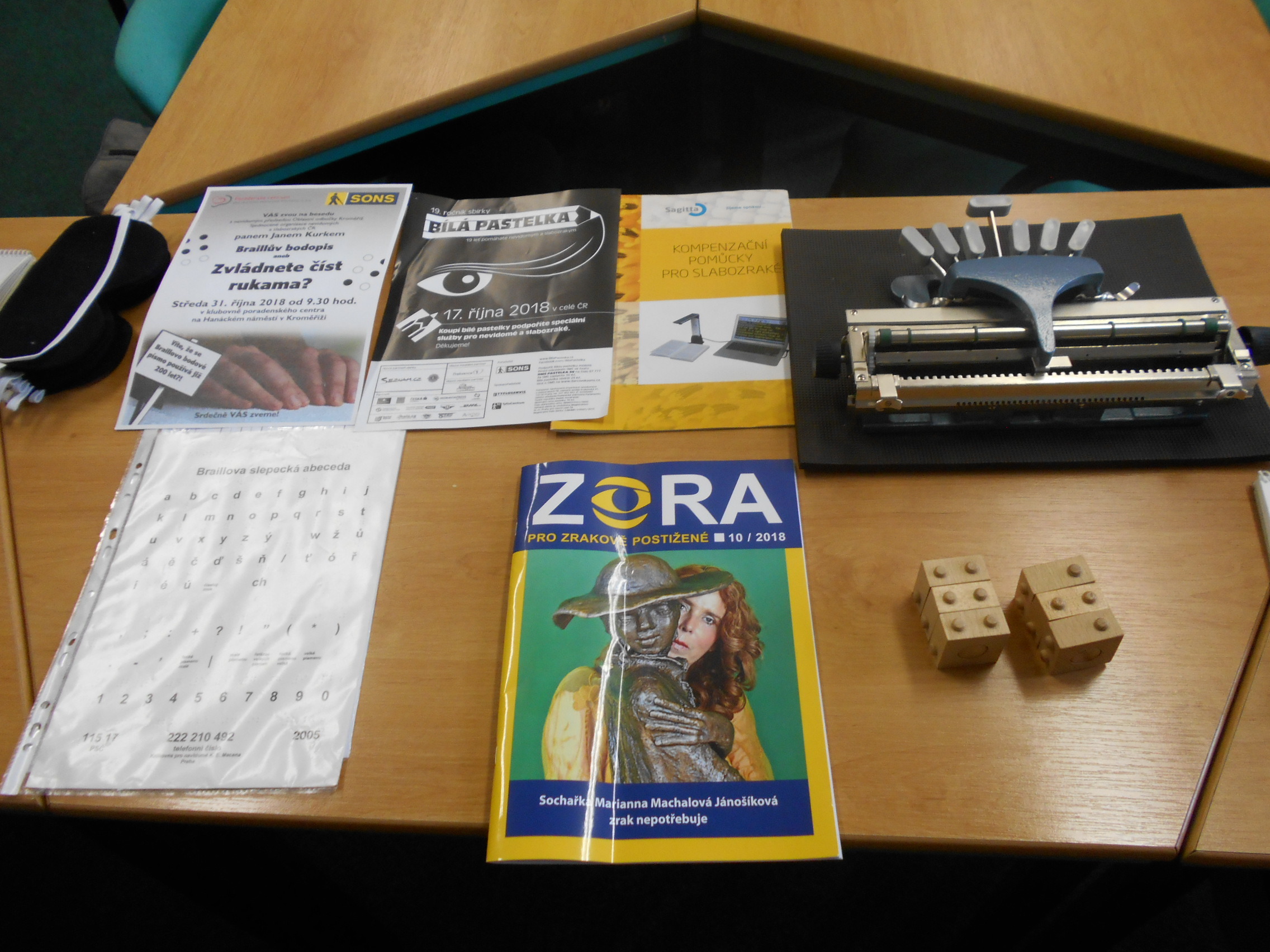 Studenti byli seznámeni s hlavním posláním SONS ČR a jejími projekty, s činností Oblastní odbočky v Kroměříži zahrnující sociální poradenství a sociální aktivizační služby, dalšími odbočkovými aktivitami a návaznými službami pro zrakově postižené poskytovanými o. p. s. Tyfloservis a krajskými TyfloCentry. Prohlédli si některé z kompenzačních pomůcek umožňujících zrakově postiženým zvládání každodenních situací, orientaci a samostatný pohyb.