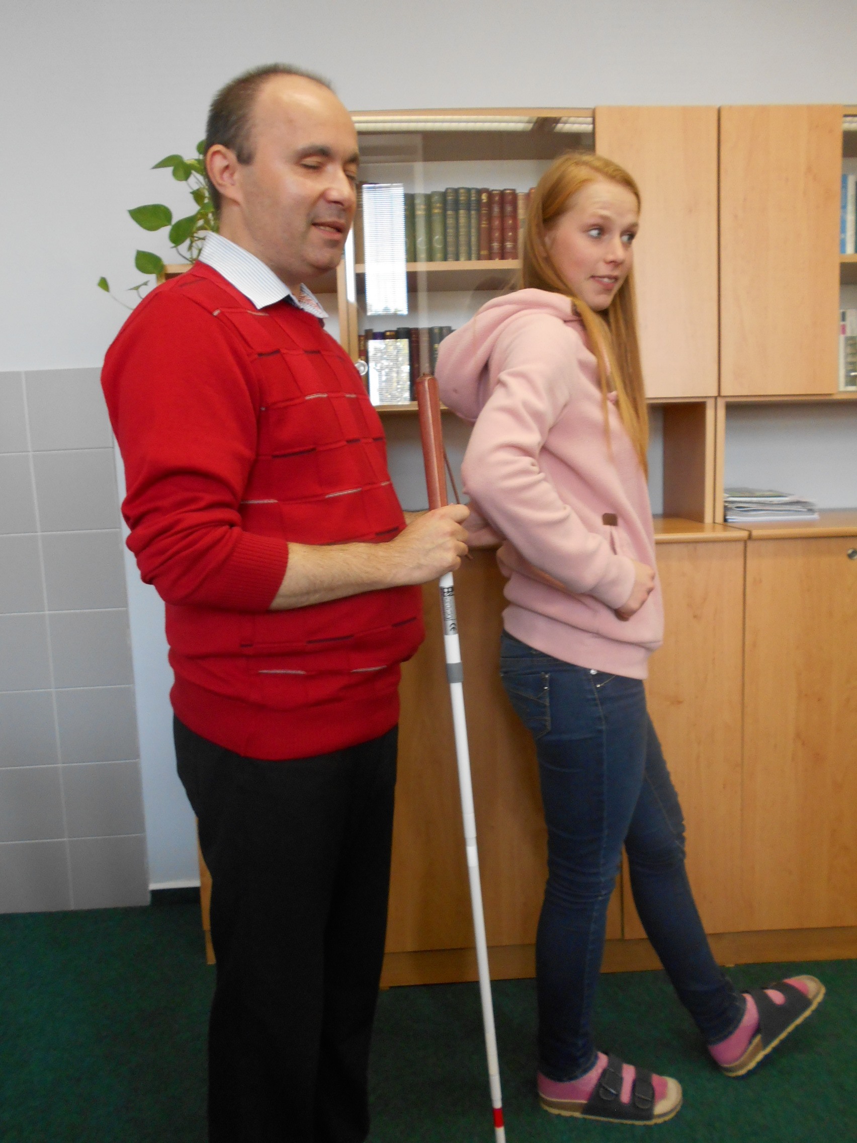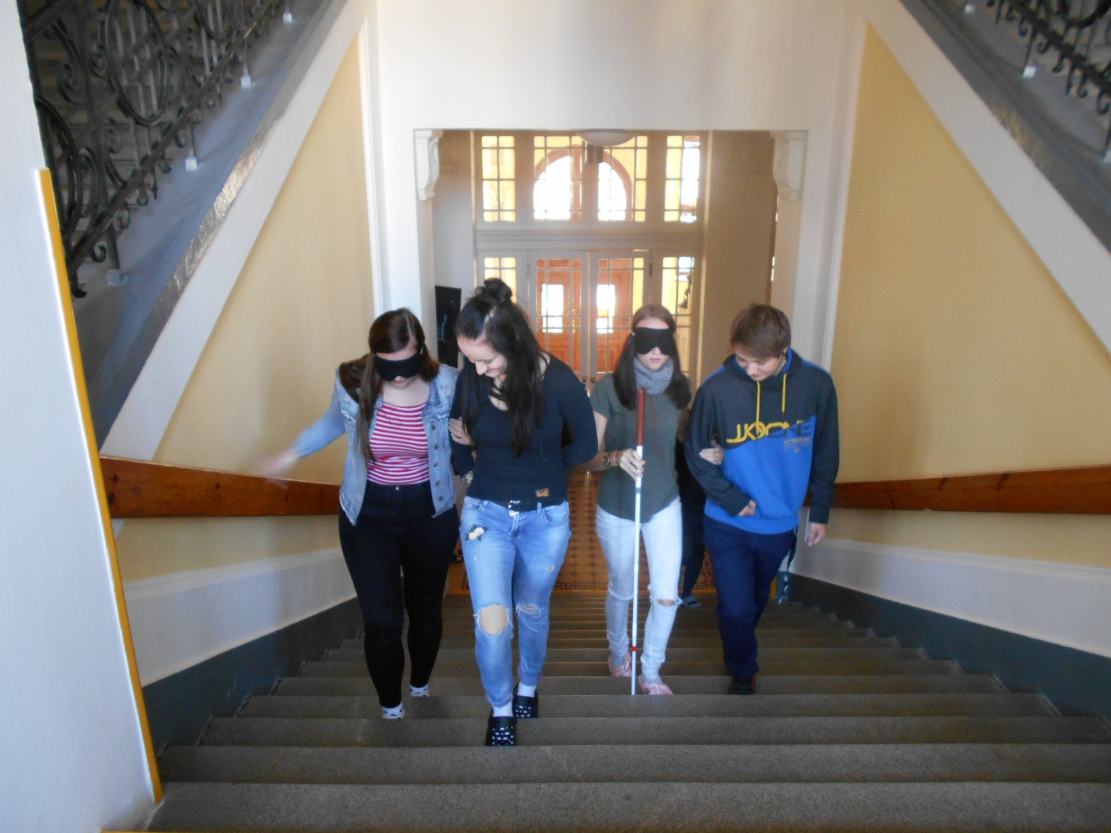 V rámci prostorové orientace se studenti seznámili s přirozenými a umělými vodícími liniemi, akustickými a reliéfními prvky pro orientaci a navigaci v terénu, typy bílých holí a základními technikami chůze s bílou holí, které si měli možnost prakticky vyzkoušet. Dále byli poučeni o správné komunikaci a přístupu k nevidomým, jak nevidomého oslovit, kdy nabídnout pomoc a jak nevidomé správně a bezpečně provázet. Ve dvojicích a s klapkami na očích si sami vyzkoušeli role nevidomých i jejich průvodců, obcházení překážek, průchod zúženým prostorem, doprovod a usazení nevidomého v prostředcích hromadné dopravy a bezpečné zdolání schodiště.