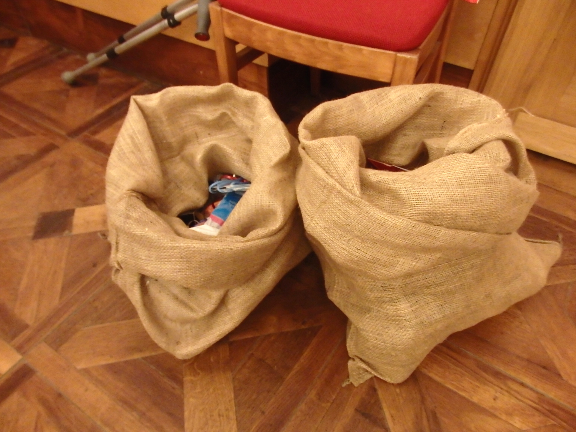 Tou první bylo, že s pozvánkou jsme všechny vyzvali, aby přišli na setkání se zabaleným dárečkem, který nešel tradičně pod stromeček, ale do jutových pytlů a tam čekal na svůj čas.