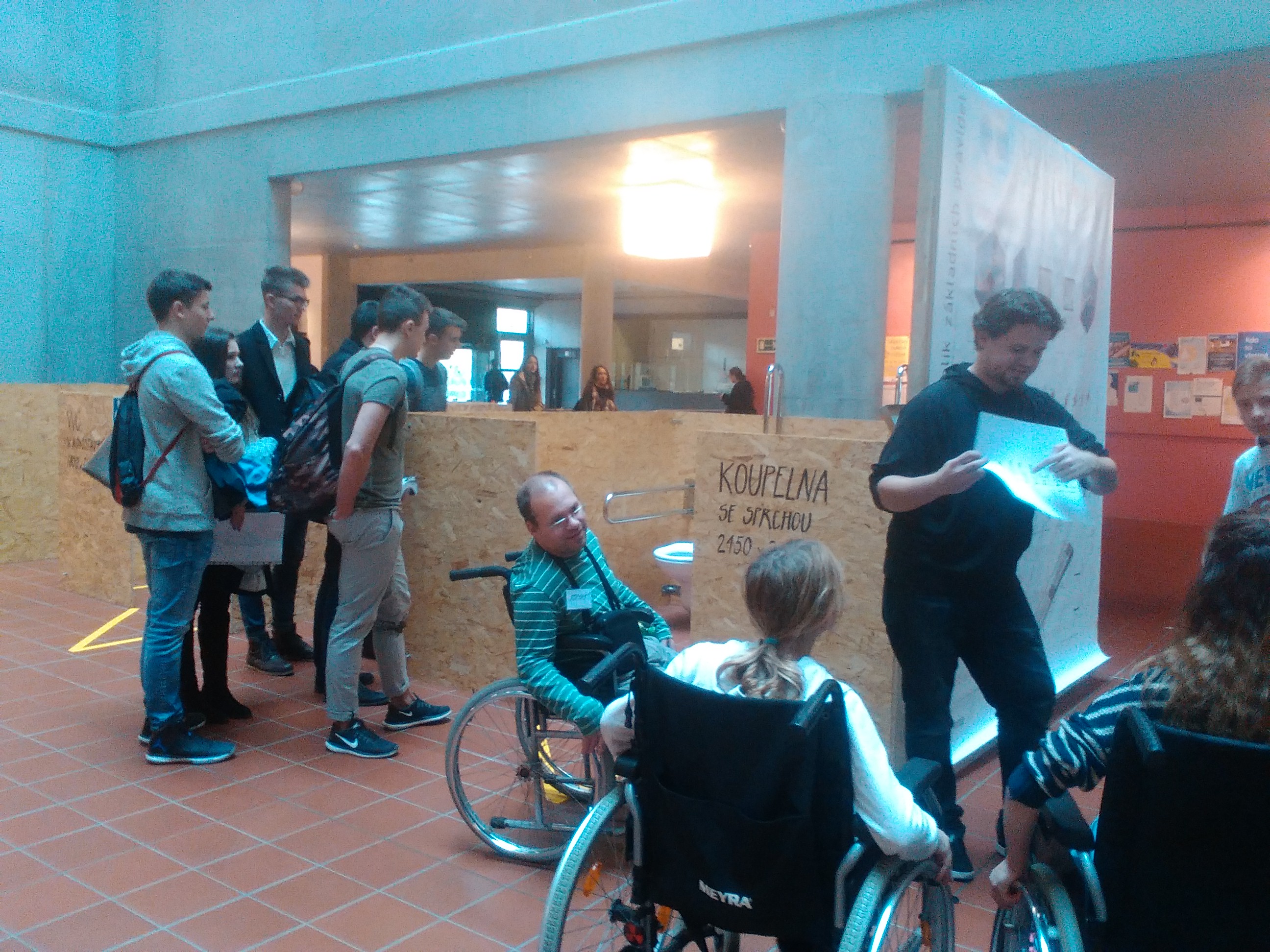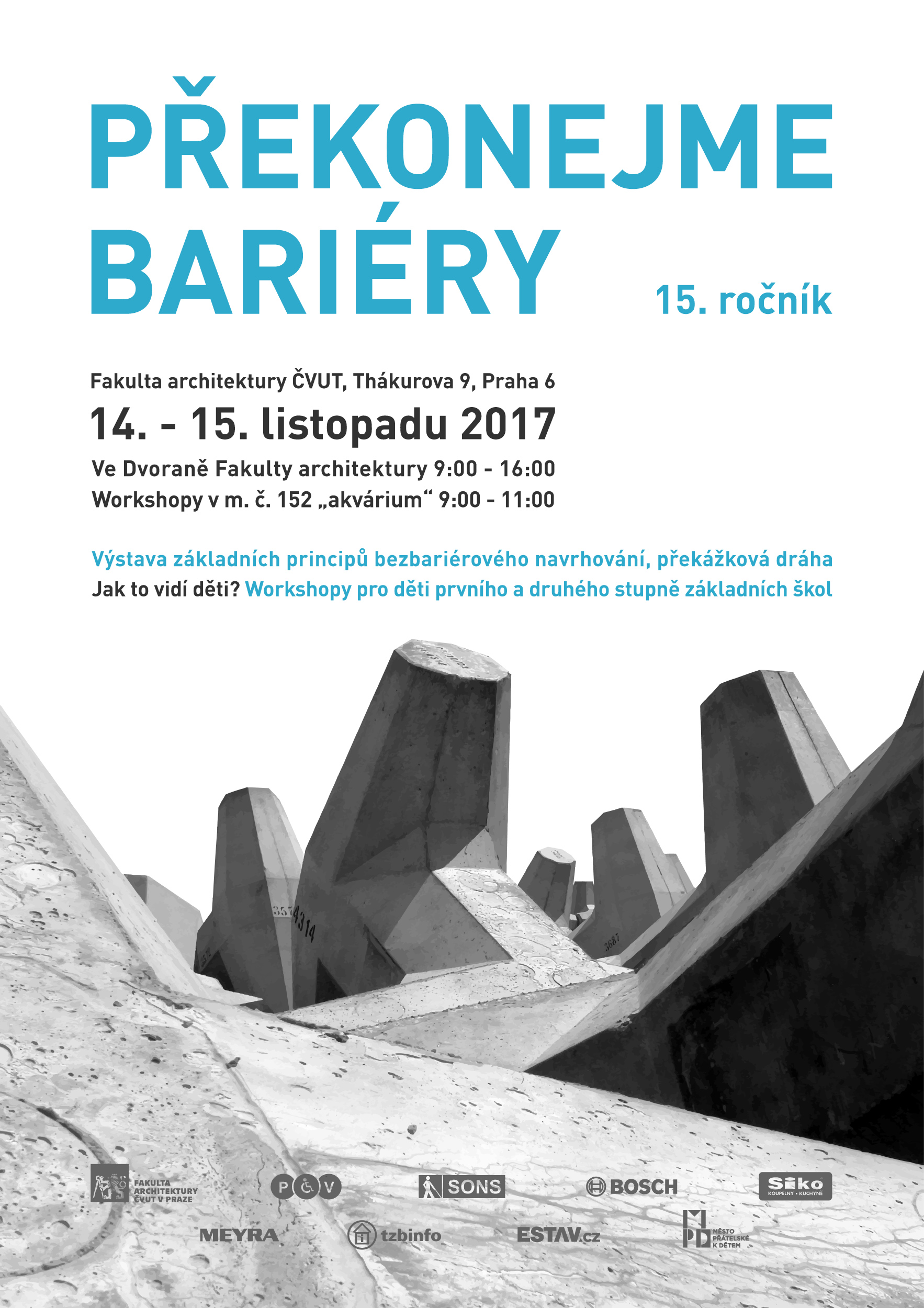 Z tiskové zprávy: Cílem akce je budoucím architektům, designérům a technikům ukázat specifika pohybu osob s nejrůznějšími typy pohybového nebo zrakového omezení a současně potřebám těchto lidí co nejlépe porozumět. Na akci Překonejme bariéry jsou zváni zejména studenti středních průmyslových škol stavebních (obor pozemní stavby, dopravní stavby), vyšších uměleckých škol, vysokých škol technických a uměleckoprůmyslových (obor architektura, interiérová tvorba, pozemní stavby, dopravní stavby). Studenti si na "překážkové dráze" postavené z modelových místností (kabin WC, výtahů), chodeb a ramp budou moci vyzkoušet pohyb na různých typech ortopedických vozíků nebo se budou moci seznámit s problematikou zrakově postižených osob. Modelové prostředí akceptuje požadavky bezbariérové vyhlášky MMR č. 398/2009 Sb. Přímo na místě bude možnost diskutovat nejrůznější otázky jak s lidmi na vozíku a nevidomými, tak i s odborníky na různé aspekty tvorby bezbariérového prostředí.