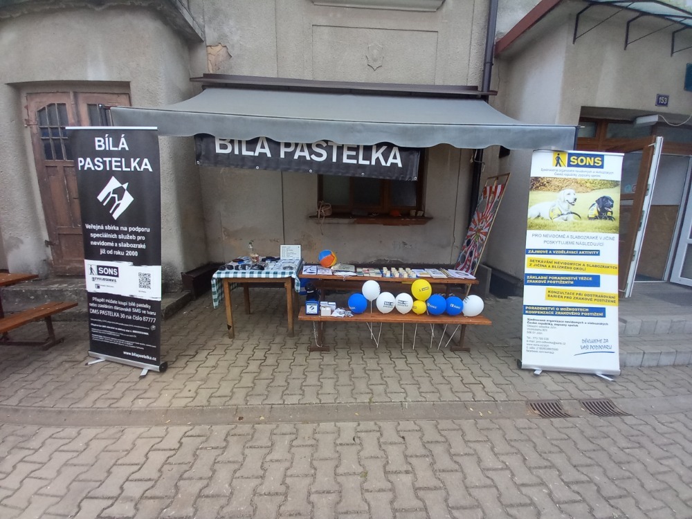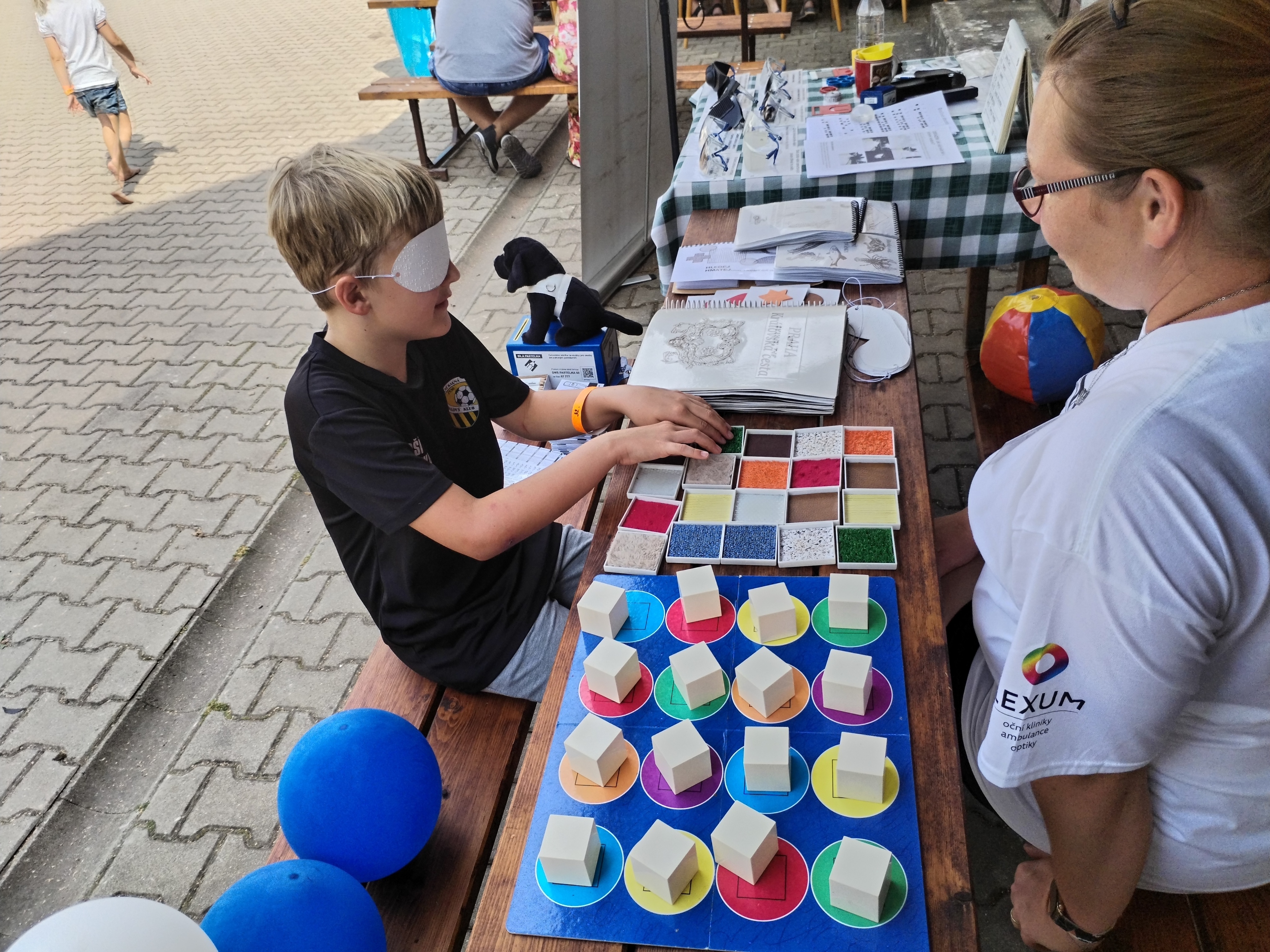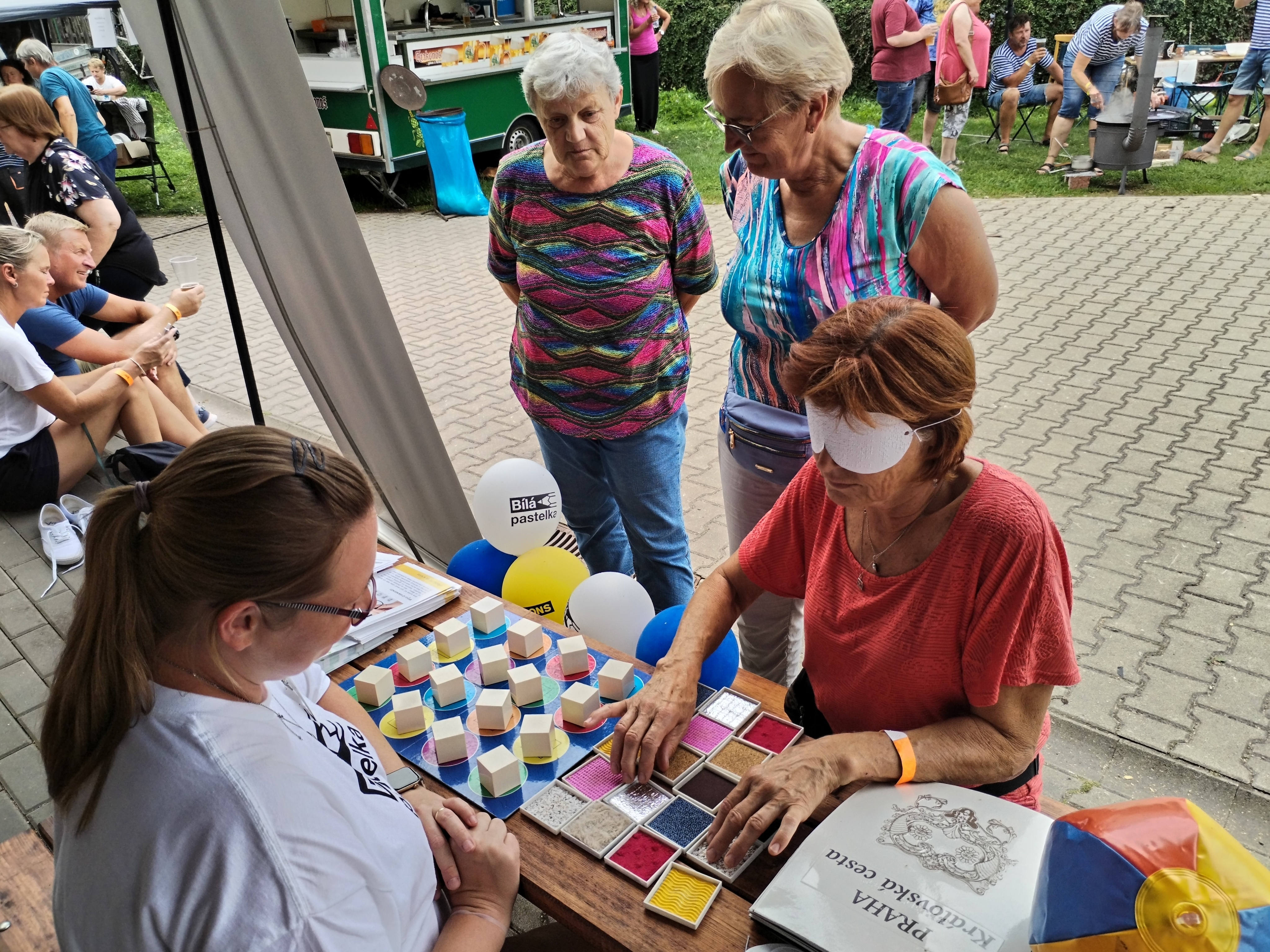 Pro návštěvníky jsme měli připravený plný stůl pomůcek pro nevidomé a slabozraké – přes lupy, měrku, kolortestr po ukázku Braillova písma. Nechyběly ani brýle evokující zrakové vady. Zejména pro děti oblíbené a velmi atraktivní hry – zvukové a hmatové pexeso. Toto si s radostí vyzkoušeli i dospěláci. S klapkami na očích to opravdu není snadné 😊. Děti se k nám opakovaně vracely a hmatového pexesa se nemohly nabažit. Odměnou jim byl samozřejmě balónek. Všechny děti byly velmi šikovné a bystré.