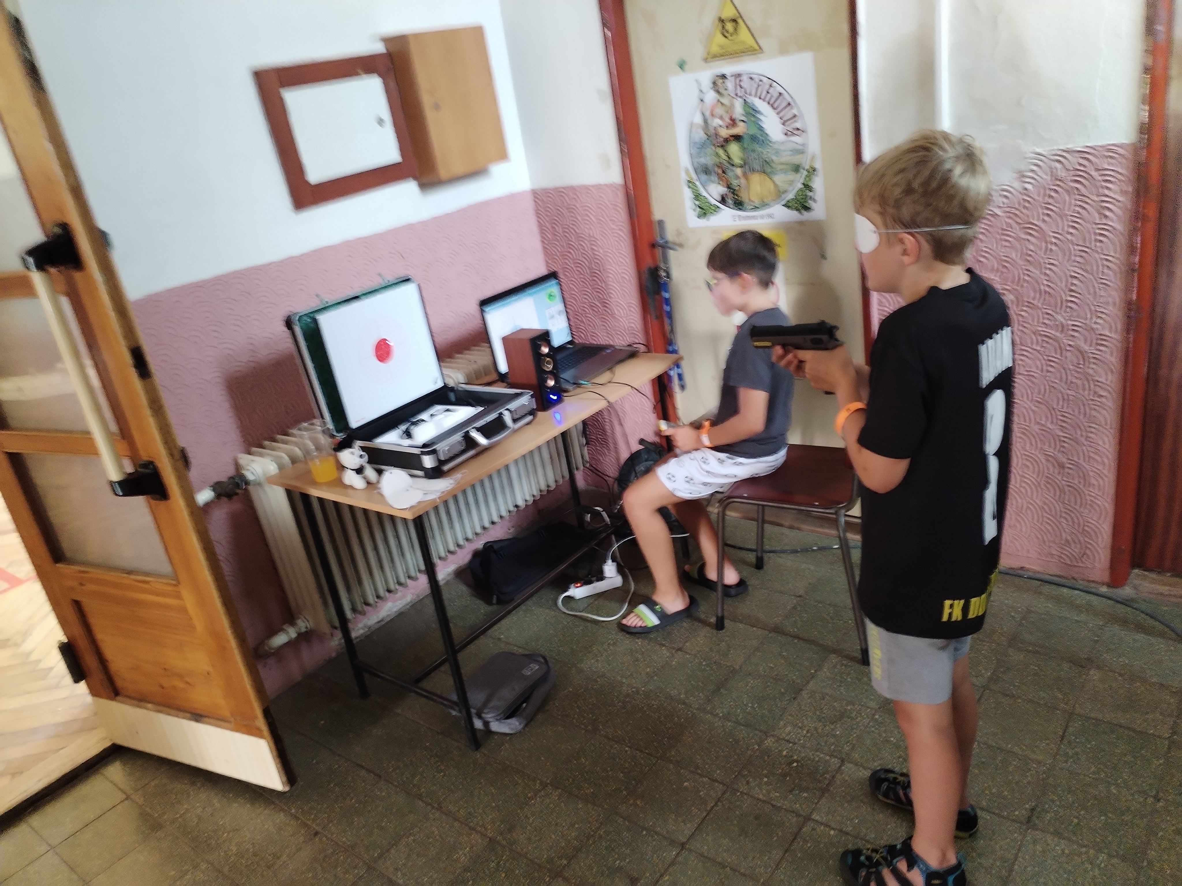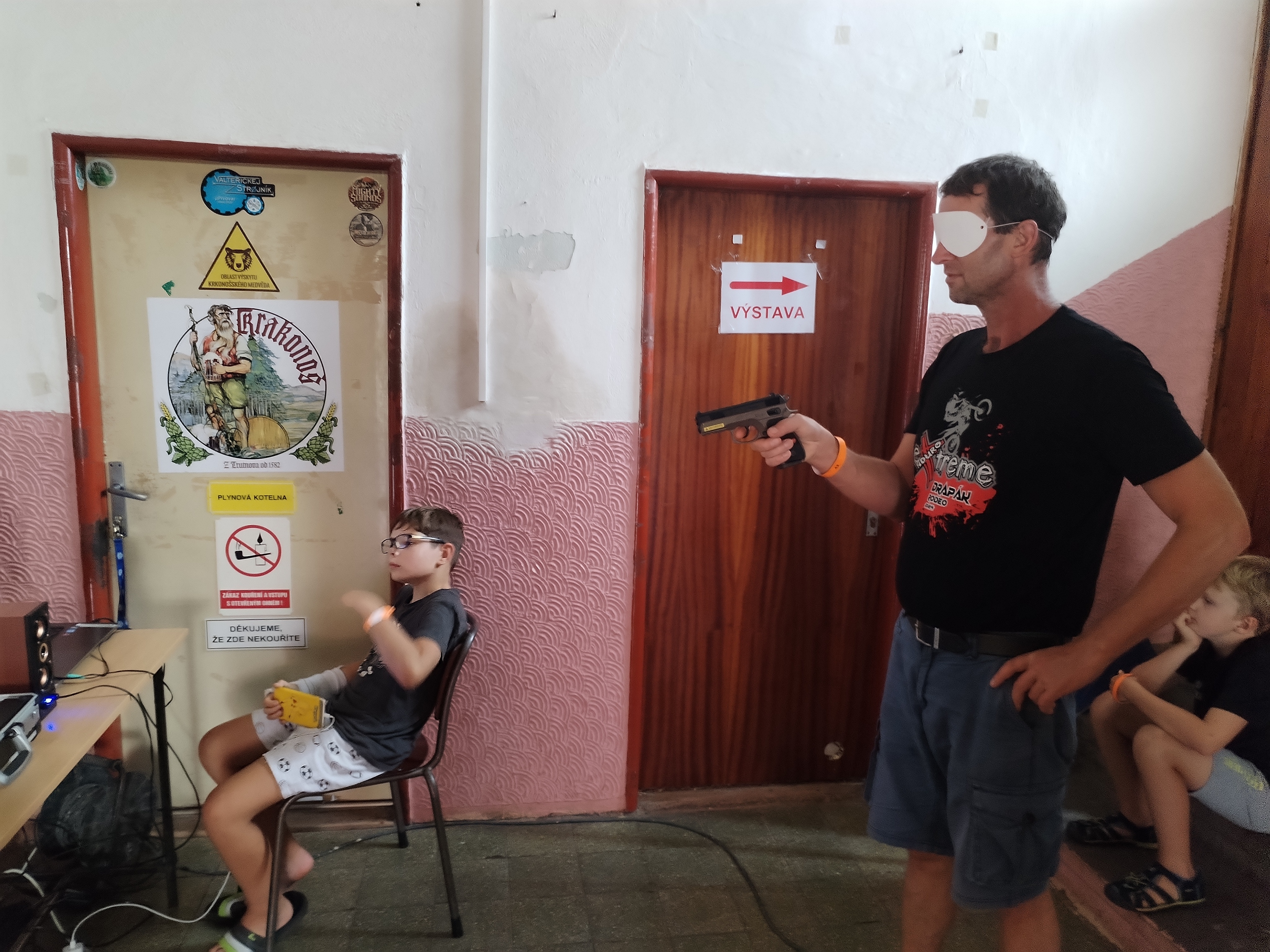 I přes drobné technické problémy se Vojtovi podařilo zprovoznit zvukovou střelbu, kterou jsme nově pořídili za pomoci Nadačního fondu Českého rozhlasu ze sbírky Světluška. Pracovat se zvukovou střelbou ve venkovních prostorách je velmi náročné, protože velice citlivě reaguje na světlo. Nepomohly ani zástěny z ubrusů, tak jsme ji nakonec museli umístit do vnitřních prostor. I tak byla pro návštěvníky našeho stánku atraktivní, a to jak pro děti, tak jejich rodiče. Všichni si s chutí vyzkoušeli přesnost střelby na terč pomocí zvukových signálů.