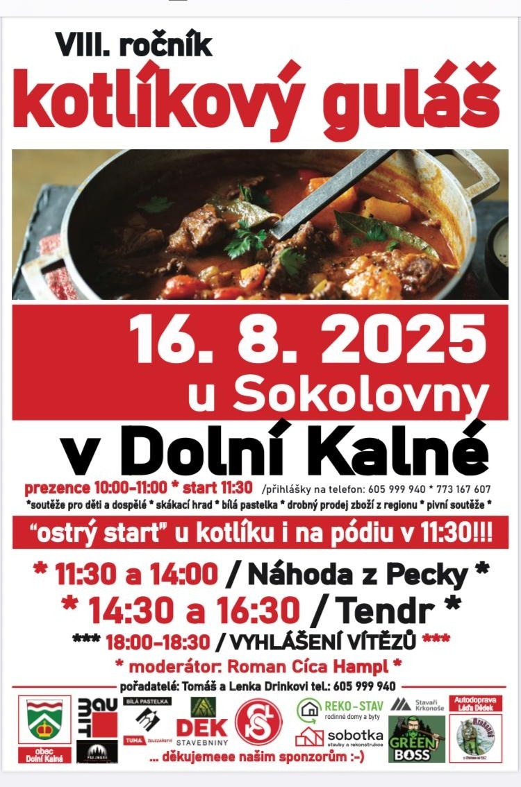S radostí jsme přijali pozvání a v sobotu 16. srpna 2025 jsme se vydali do Dolní Kalné na VIII. ročník Kotlíkového guláše.