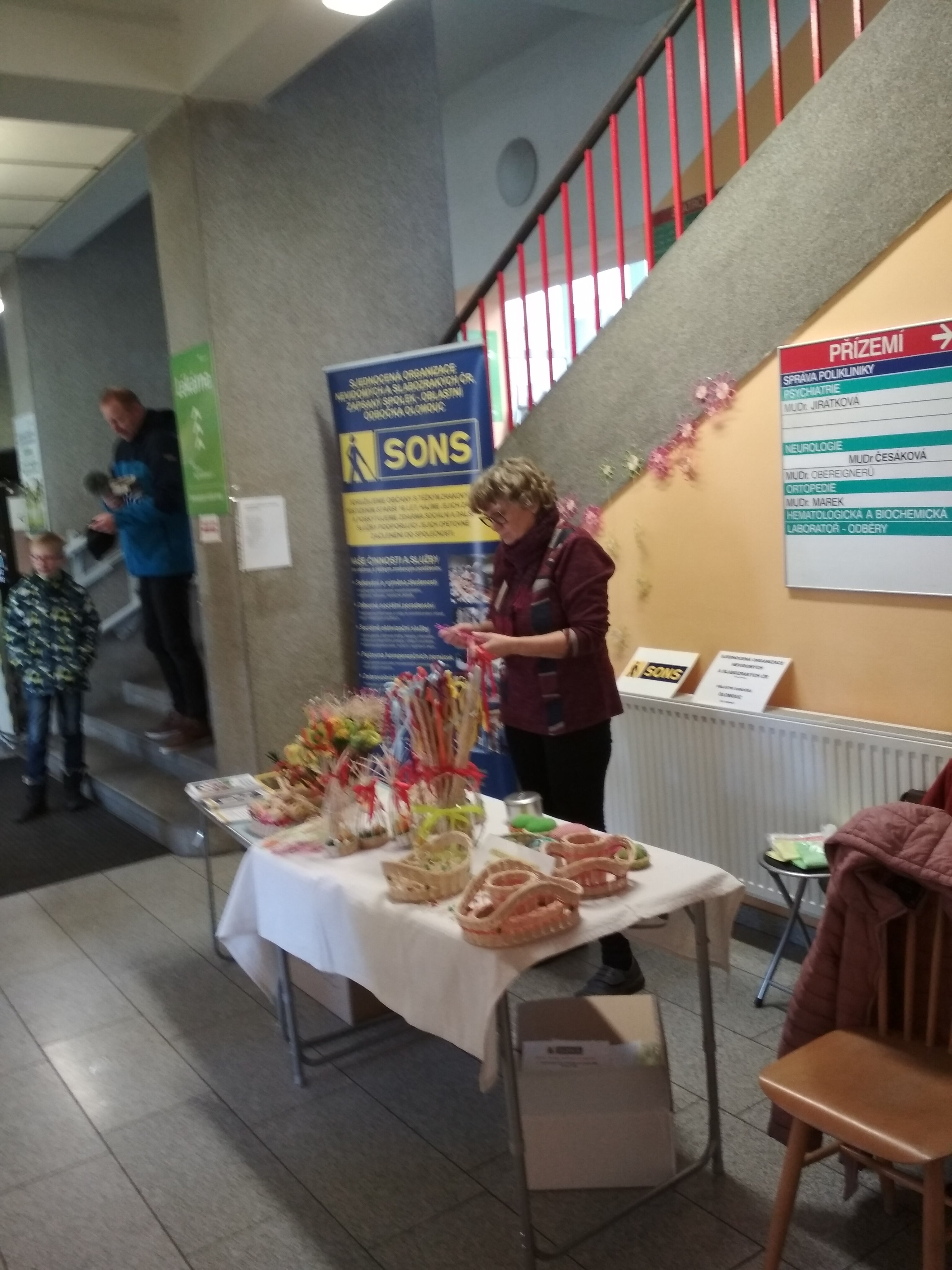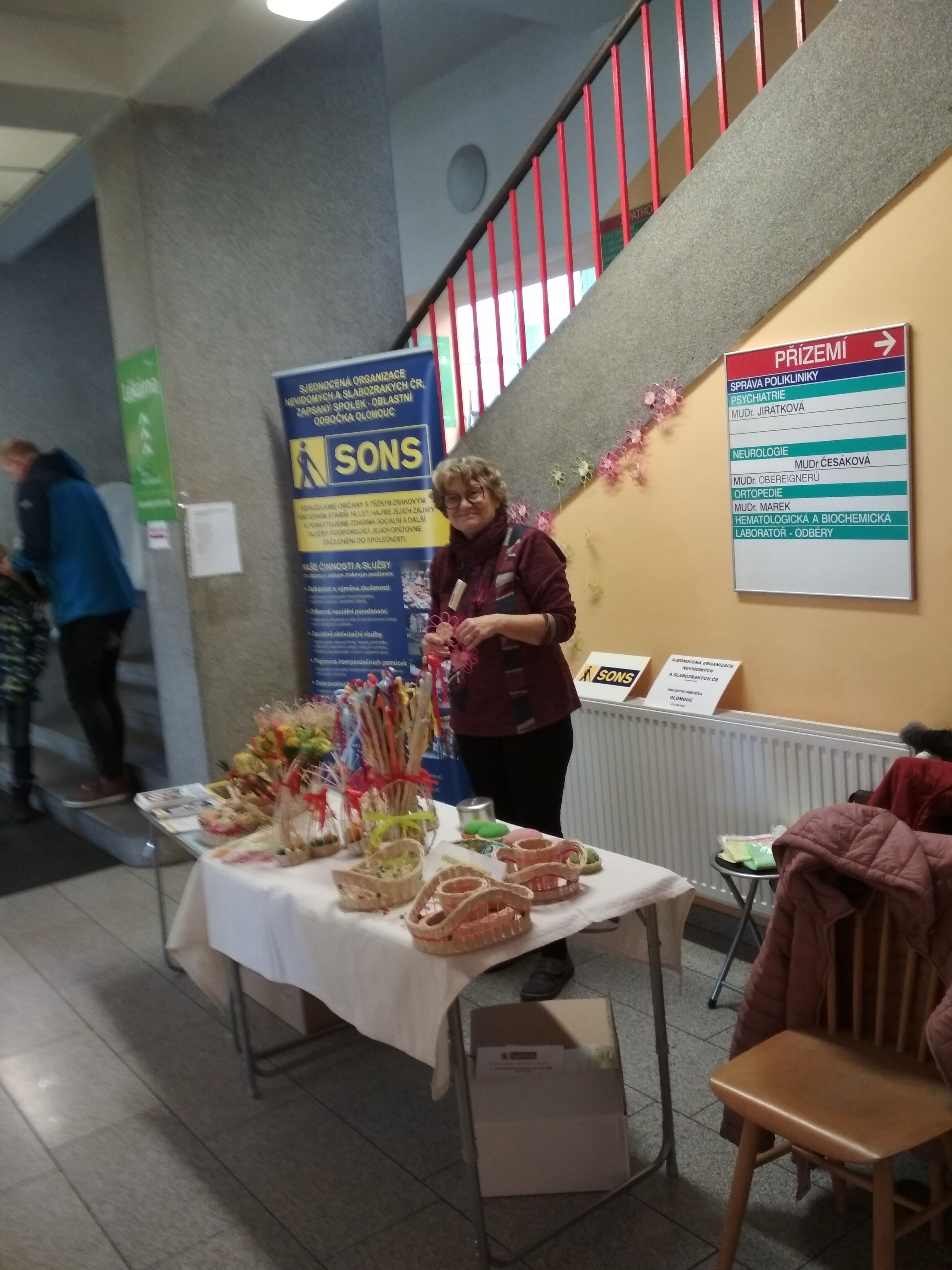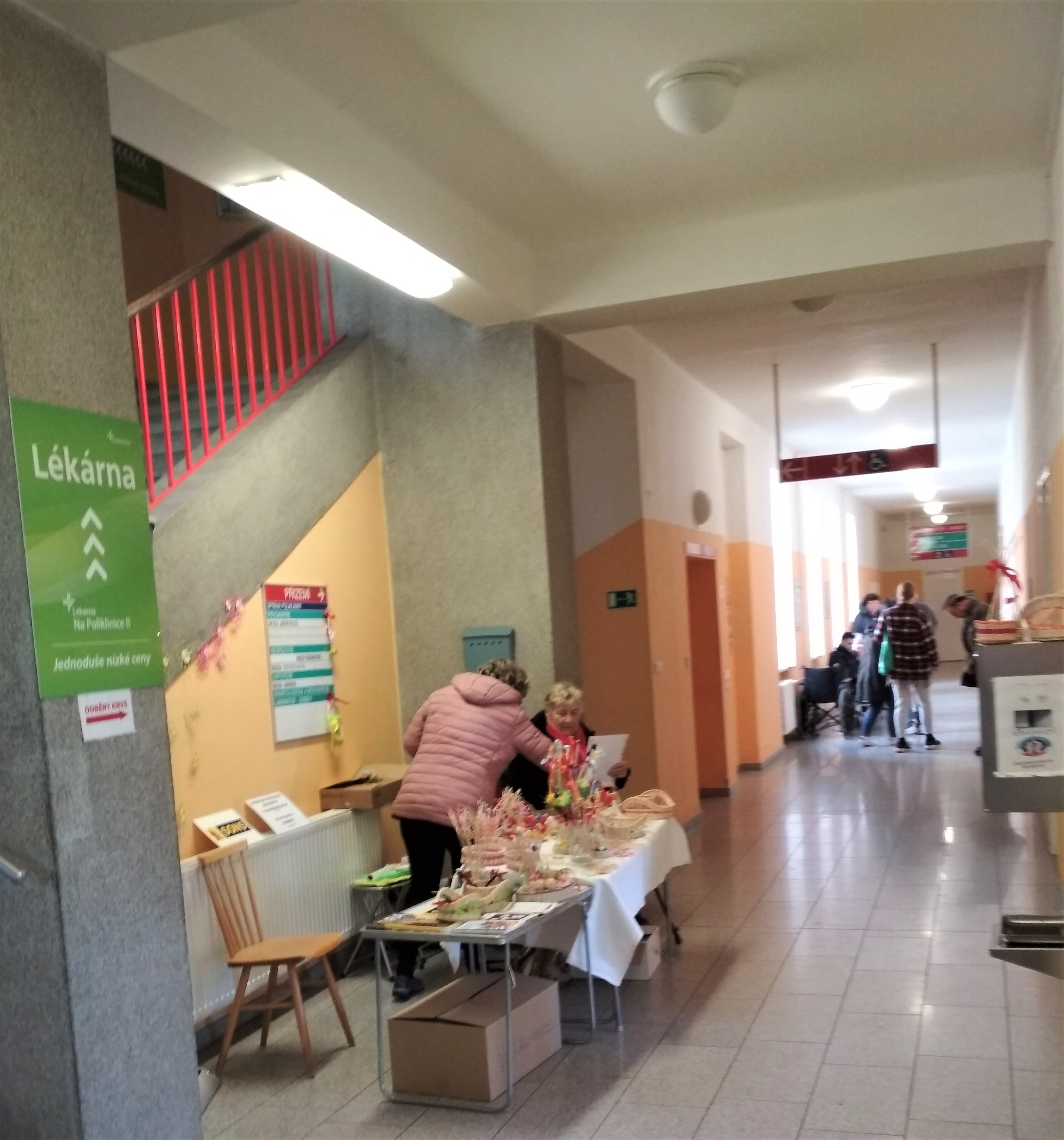 Velikonoční výrobky z klubu kutilů spolu s informačními letáčky odbočky upoutávaly 28. března tohoto roku pozornost kolemjdoucích zdravotnických pracovníků a pacientů kliniky, jejich doprovodů i ostrahy.
