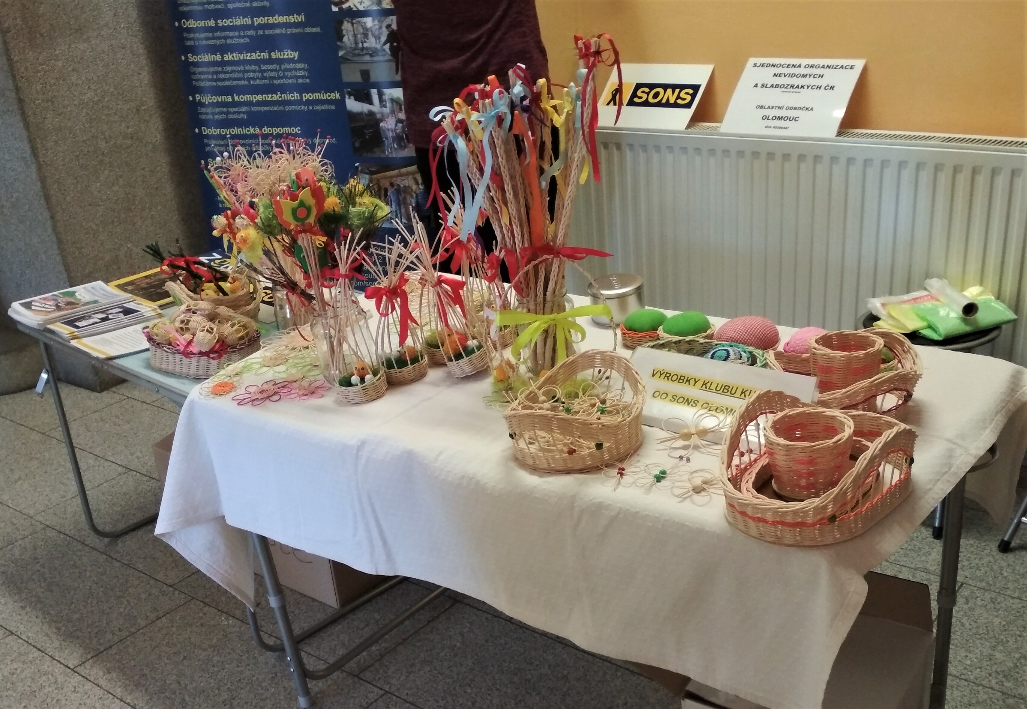 Šlo hlavně o výrobky z pedigu - velikonoční ozdoby či ozdobná zapichovátka do květináčů, barevná malá vajíčka, pomlázky, ošatky, misky či minikukaně, jehelníčky apod. Často jsme vysvětlovaly prohlížejícím z jaké jsme organizace, co vlastně pro lidi s těžkým zrakovým postižením děláme a kde sídlíme. A jak je vlastně možné, že nevidomí a těžce zrakově postižení dokáží uplést ošatky, jehelníčky aj. DOKÁŽÍ!!! A proto jim patří náš obdiv a veliký DÍK!!! Vždy jsem odpovídala, že díky pomoci a vedení zkušeného, trpělivého, šikovného pomocníka, který se sám naučil tuto práci od nevidomého kamaráda.