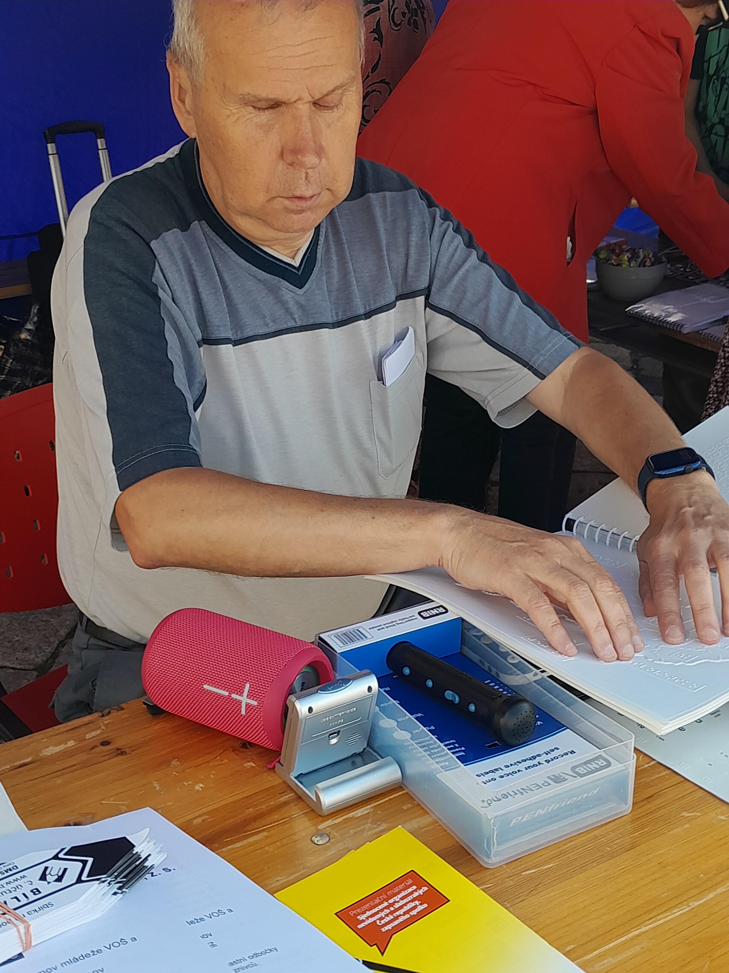 Veřejnosti byly prezentovány kompenzační pomůcky pro zrakově postižené a byl poskytnut odborný výklad. Akce se zúčastnil i pan Tadeusz Karaš, který zájemcům ukázal psaní na tabulce a předvedl i své ozvučené pomůcky, které mu pomáhají v každodenním životě. Akce byla skvěle zorganizována a velice se povedla.