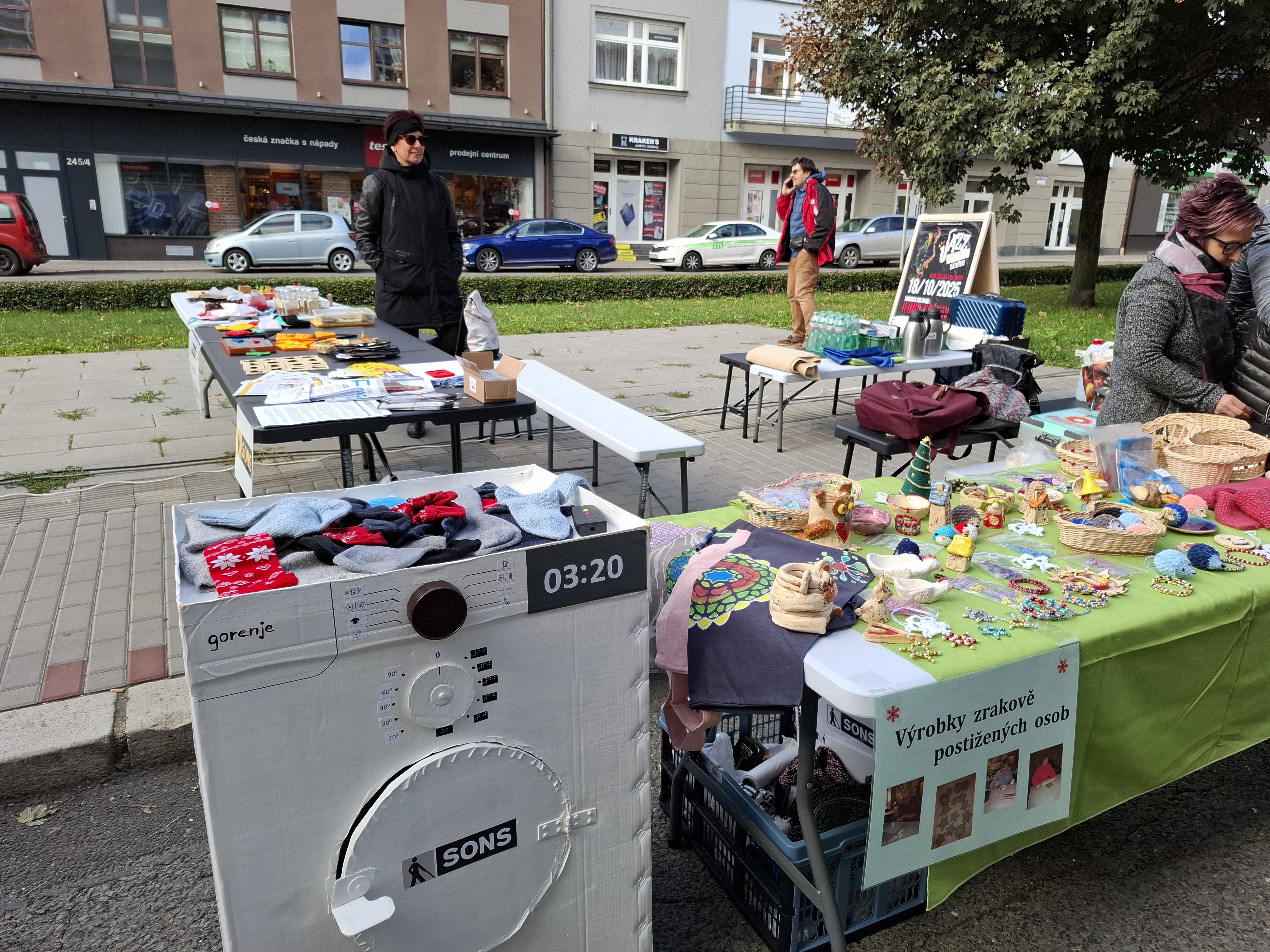 Na našem stánku si návštěvníci mohli vyzkoušet řadu aktivit: třídění ponožek pomocí testeru Colorino ve velké maketě pračky, hry přizpůsobené slabozrakým a nevidomým, ukázku kompenzačních pomůcek včetně kamerové lupy Optelec, nebo si prohlédnout výrobky z našich tvořivých dílen. Nechybělo ani občerstvení – výtečný párek v rohlíku zahřál nejen žaludek, ale i atmosféru, která byla i přes chladnější počasí velmi příjemná.