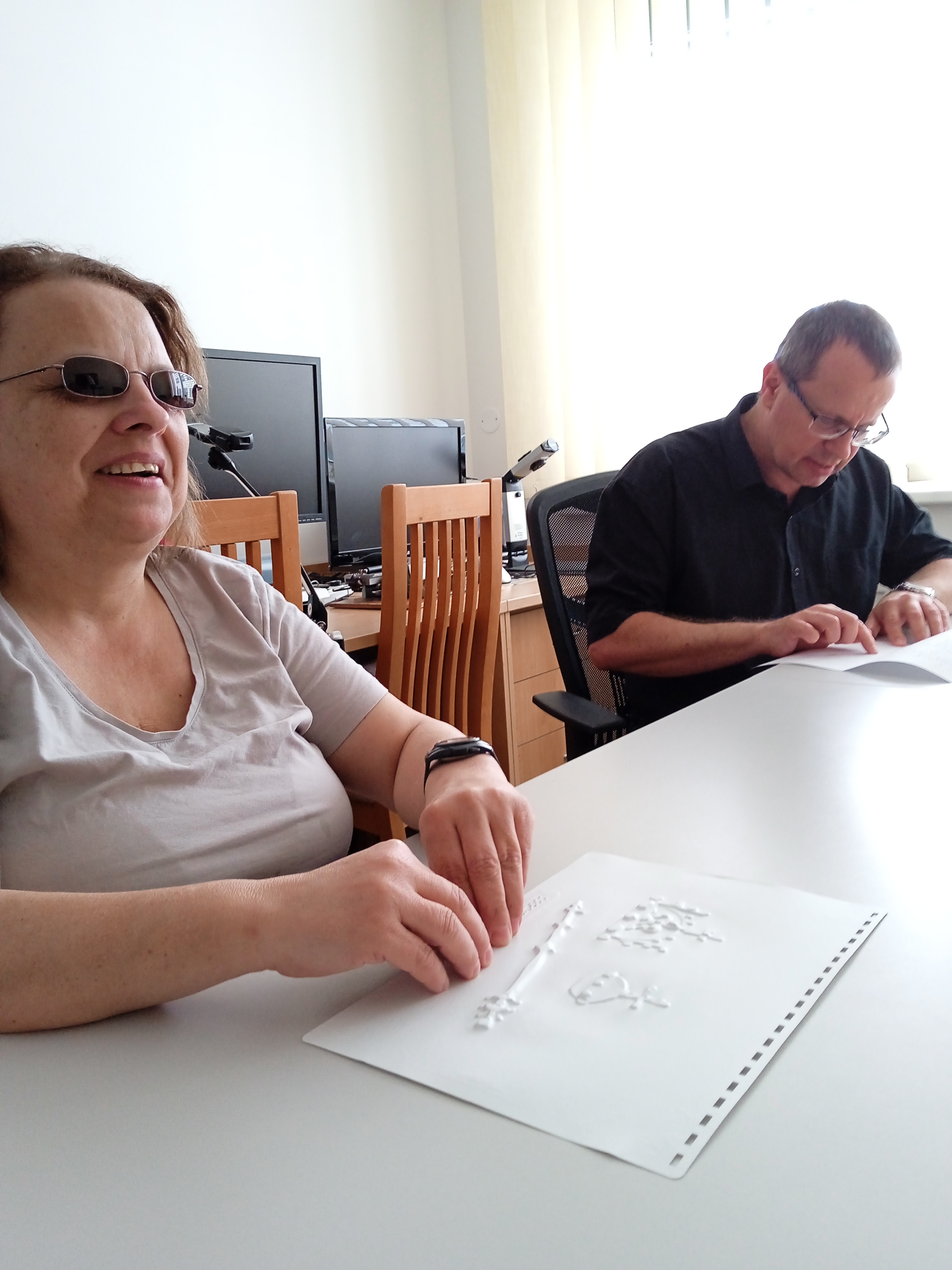 To byste nevěřili, jaké všechny užitečné informace jsou vytištěny v bodovém písmu. Nejdříve jsme si prohlédli stolní kalendář, ve kterém je opravdu snadné se zorientovat. Pak jsme si četli o českých hradech a zámcích, přičemž kniha nabízela i hmatný obrázek těchto zámků. A už následovali hádanky předepsané též v Braillu. Nechybělo také luštění nápisů na lécích. No a protože letos na jaře bude naše odbočka pořádat soutěž ve čtení a psaní bodovým písmem, zkusili jsme si i malé časovky. No to byste neuhodli, kdo z nás četl nejrychleji? Nakonec abychom si spravili náladu, zahráli jsme si zvukové pexeso. Tentokráte jsme nepoužili žádnou elektroniku ani aplikaci, ale pouze trojrozměrné kostky, které v sobě ukrývaly různou chřestící náplň. Na konci hry jsme měli každý stejný počet kostek, a tak jsme s dobrou náladou, že paměť nám stále slouží, odcházeli do svých domovů.