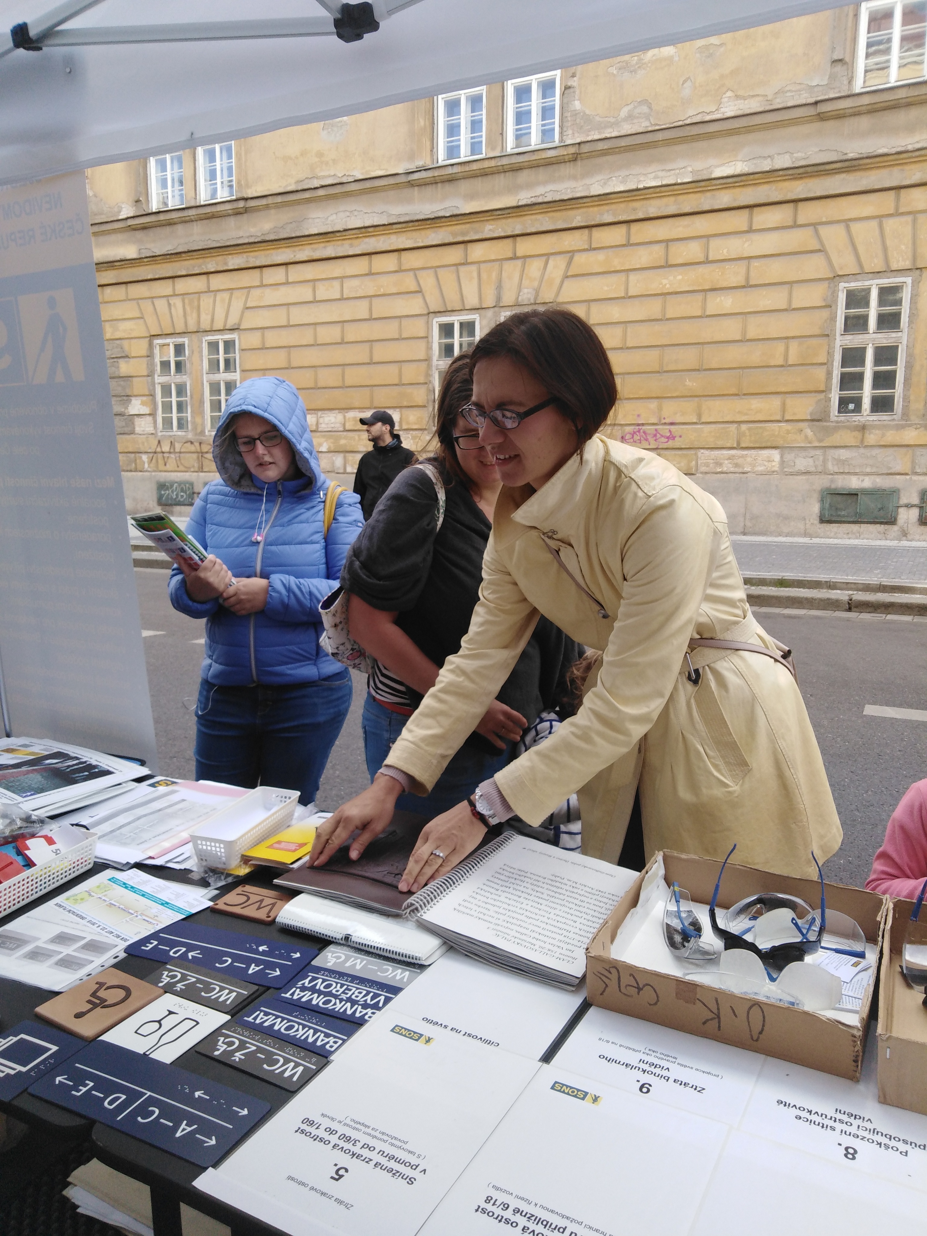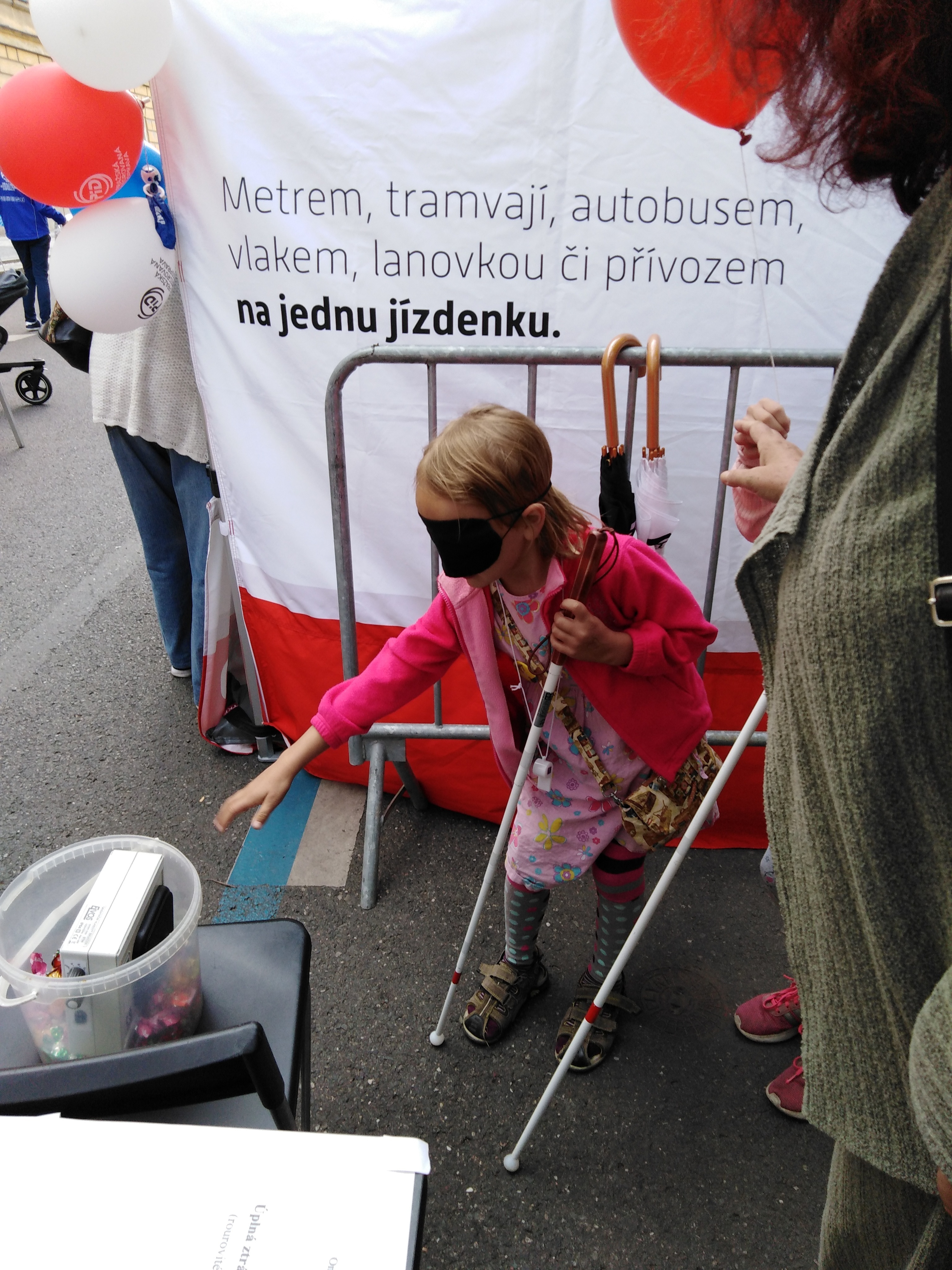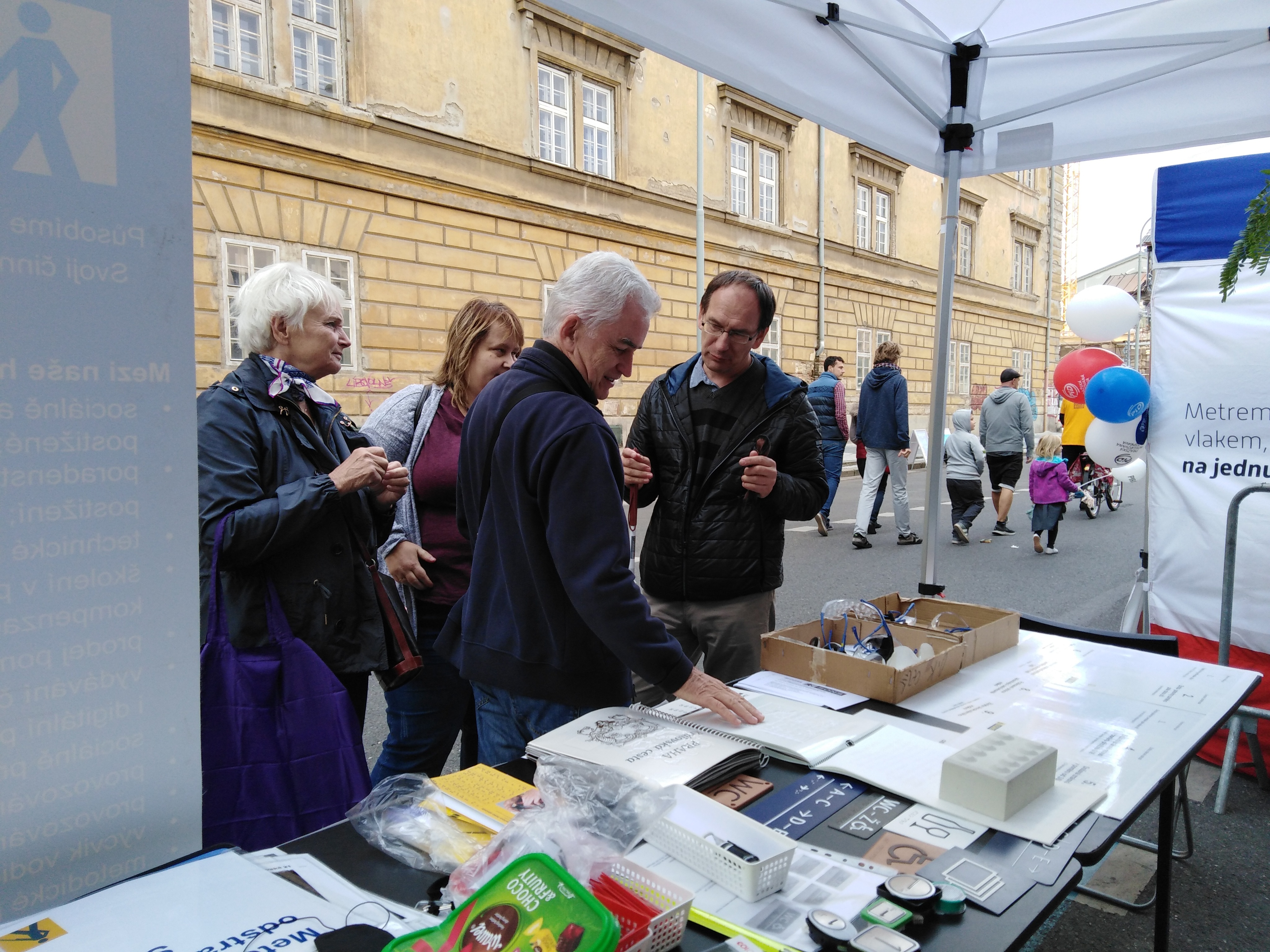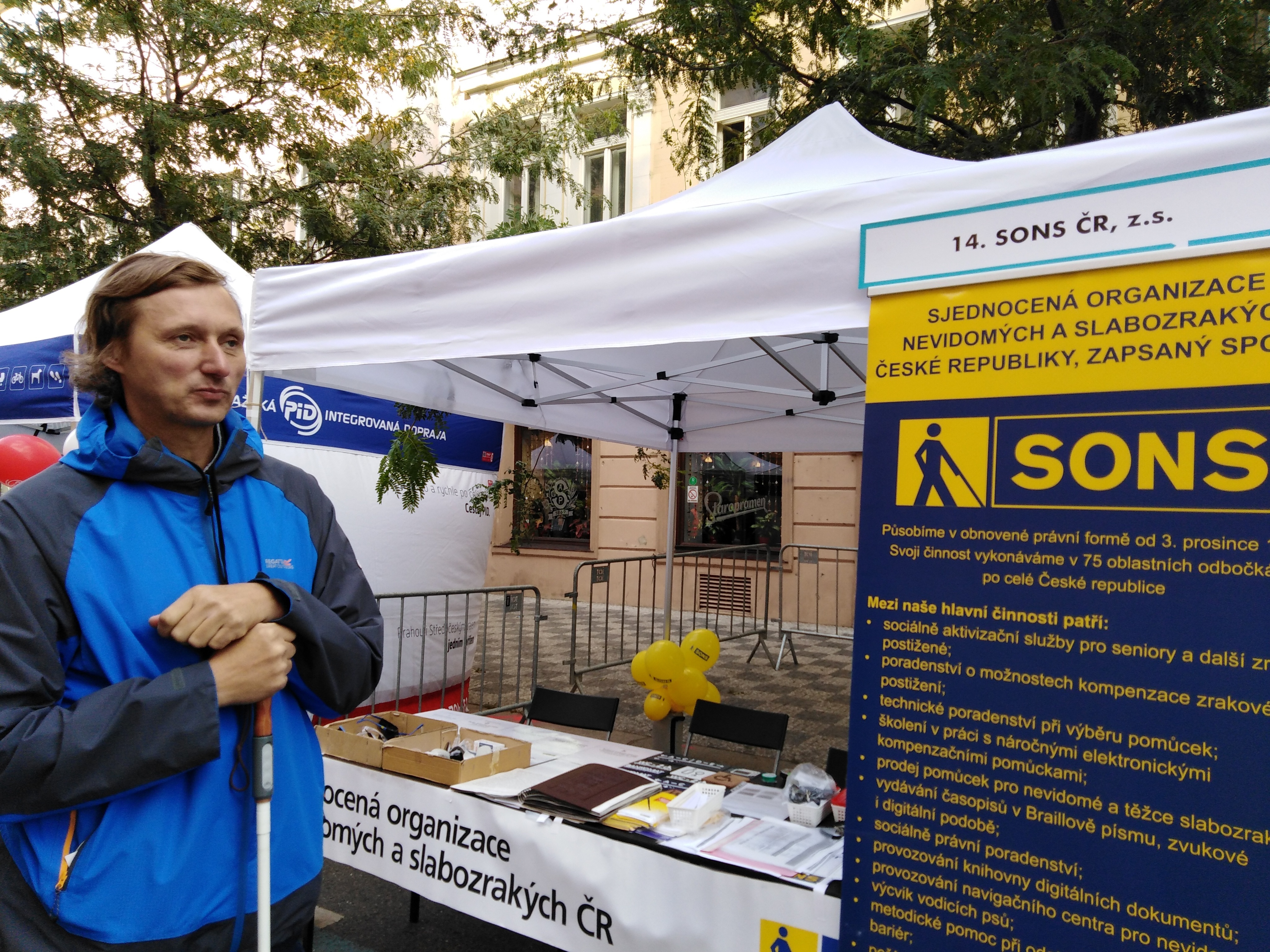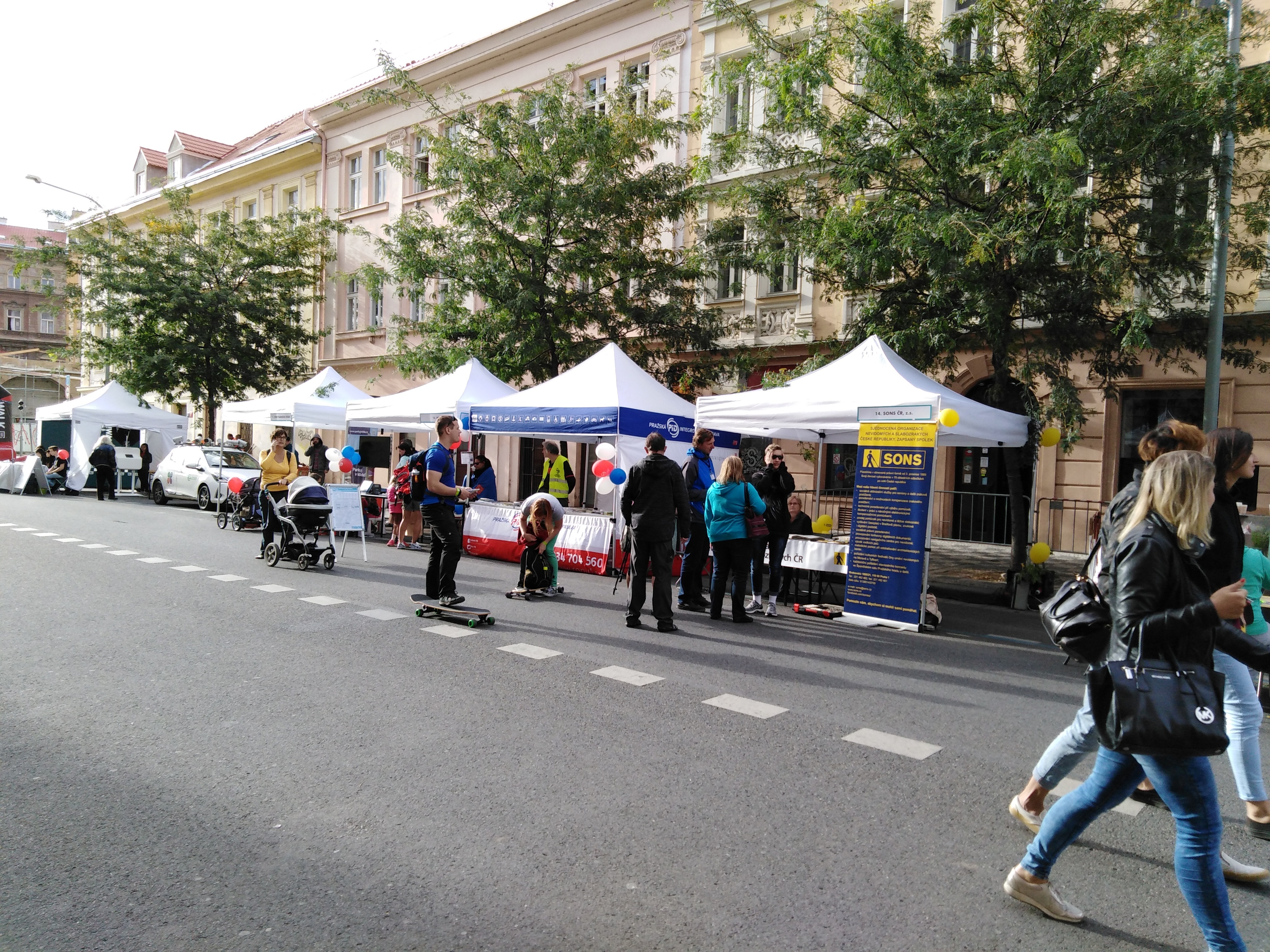 Den bez aut se odehrál v Křižíkově ulici. Program byl bohatý, přes čtyřicet stánků různých organizací představilo mimo jiné zajímavosti a novinky ze světa dopravy, témata se týkala i životní prostředí, Prahy bez bariér a doplňovaly ho různé koncerty. Zapojila se i SONS ČR, z. s., Metodické centrum odstraňování bariér – jako minulý rok zde byla pro veřejnost k dispozici uměle vytvořená dráha pro nácvik chůze s bílou holí a byla zde možnost seznámit se s některými pomůckami nevidomých a slabozrakých. Počasí už jasně naznačovalo, že podzim je za dveřmi, přesto účast nebyla malá. Jak to vypadalo u našeho stánku číslo 14 – byla zde živá atmosféra, zajímaly se rodiny s dětmi, senioři, ale i odborníci stavaři, pedagogové, viz přiložená fota.