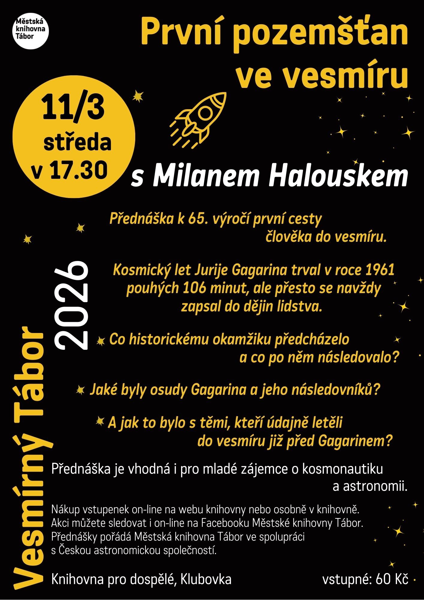 Naše pobočka SONS Tábor pravidělně spolupracuje s městskou knihovnou v Táboře. A již několikrát mohli naši členové vyslechnout poutavé povídaní pana Milana Halouska. I tentokrát Vás srdečně zveme na přednášku věnovanou 65. výročí první cesty člověka do vesmíru. Historický let Jurije Gagarina v roce 1961 trval pouhých 106 minut, přesto navždy změnil dějiny lidstva. Během přednášky se dozvíte, co tomuto okamžiku předcházelo, jaké byly další osudy prvního kosmonauta světa i jeho následovníků a jaké otázky dodnes provázejí Gagarinovu tragickou smrt.